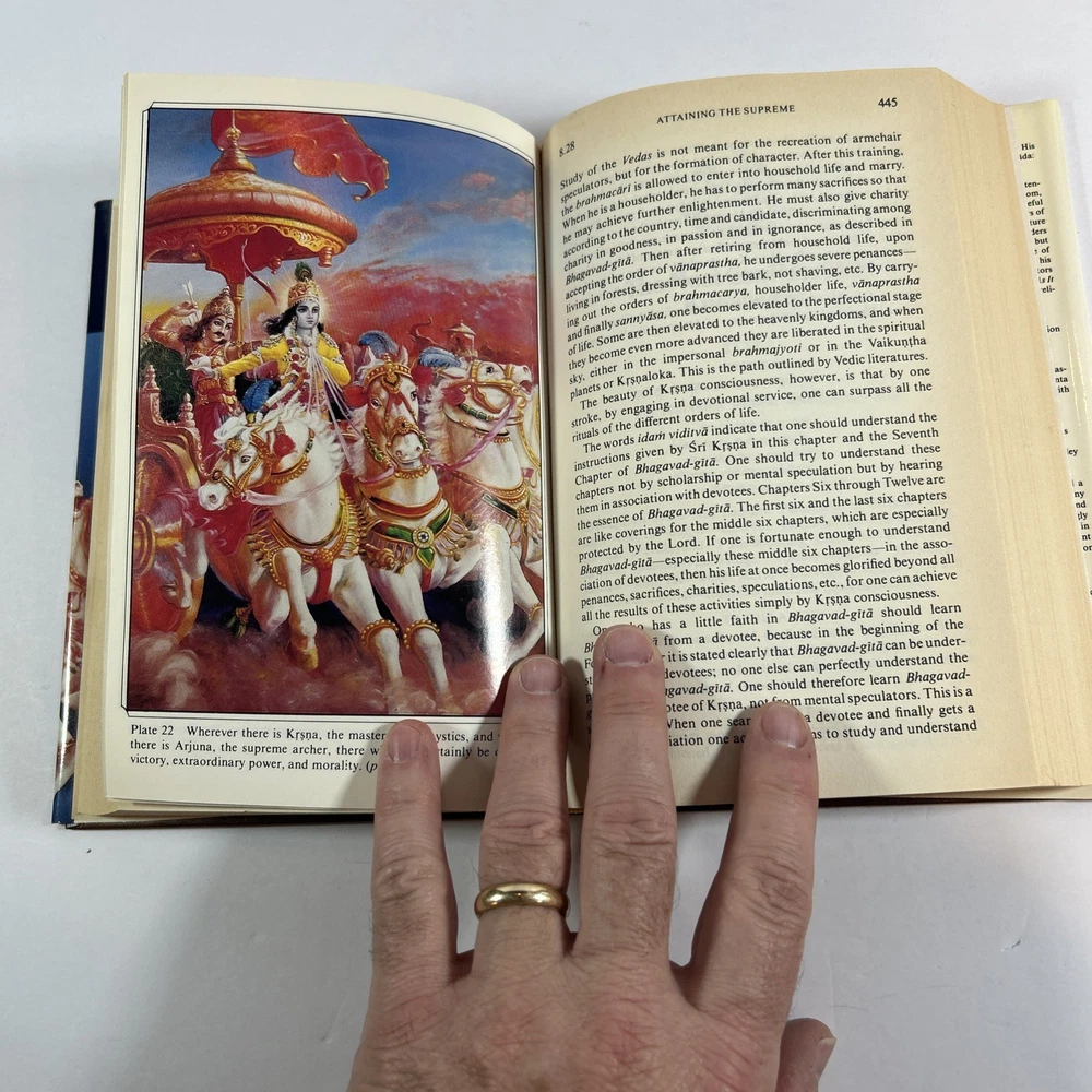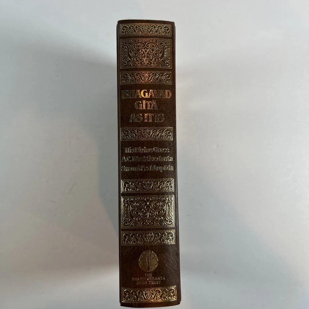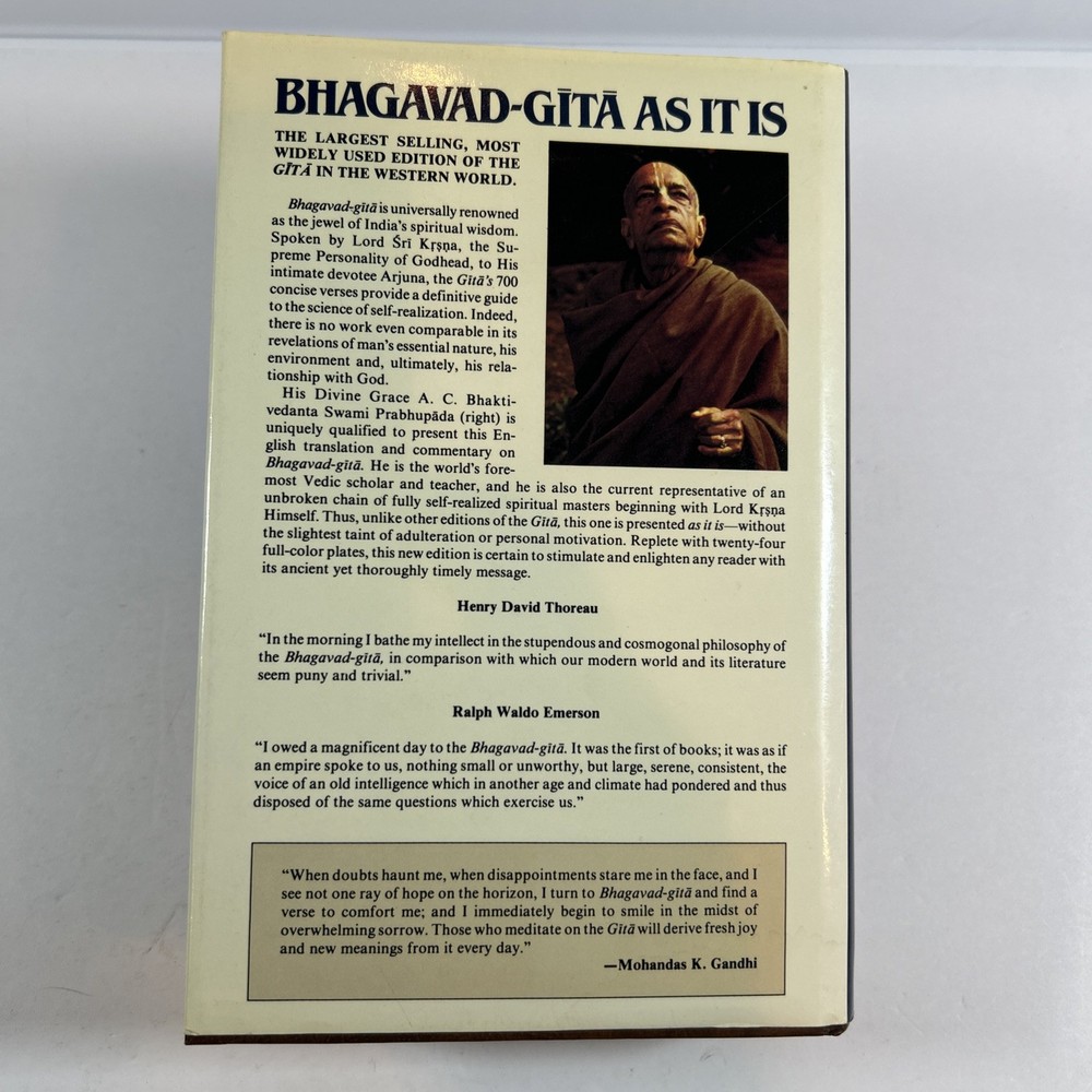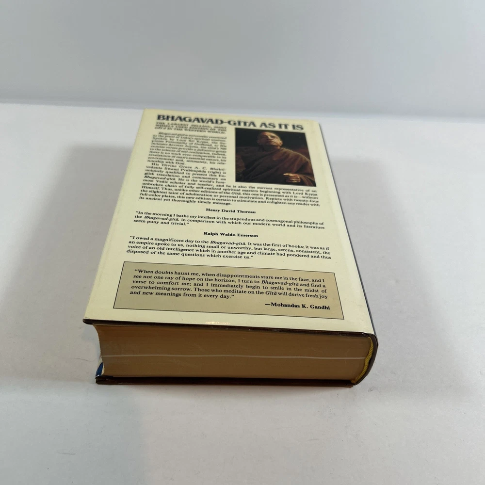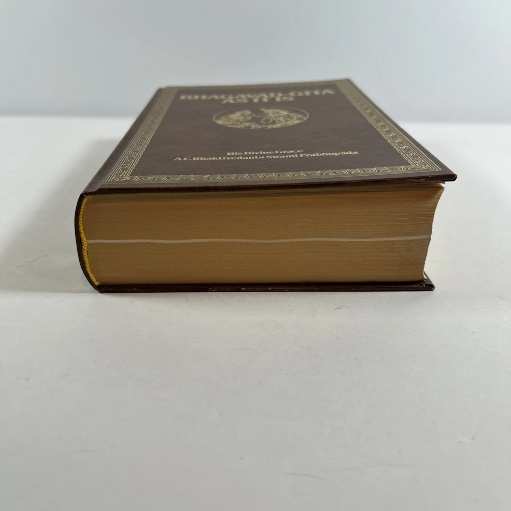 The Bhagavad-Gita As It Is 1983 hardcover vintage edition with brown gold trim is a special first print featuring illustrated plates. Published by Bhaktivedanta Book Trust, the book is a nonfiction narrative exploring comparative religion and the ancient world. Authored by His Divine Grace A.C. Bhaktivedanta Swami Prabhupada, this academic history piece offers insights into the mind, body, and spirit, making it a valuable addition to any collection for adults interested in religious texts and enlightenment.