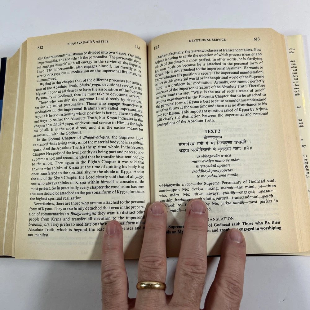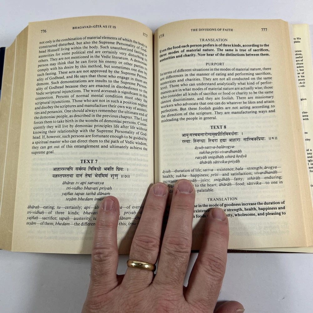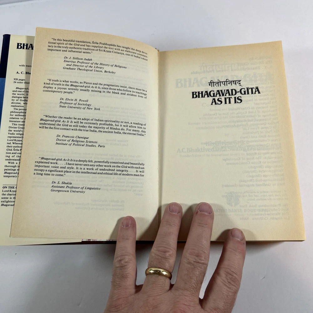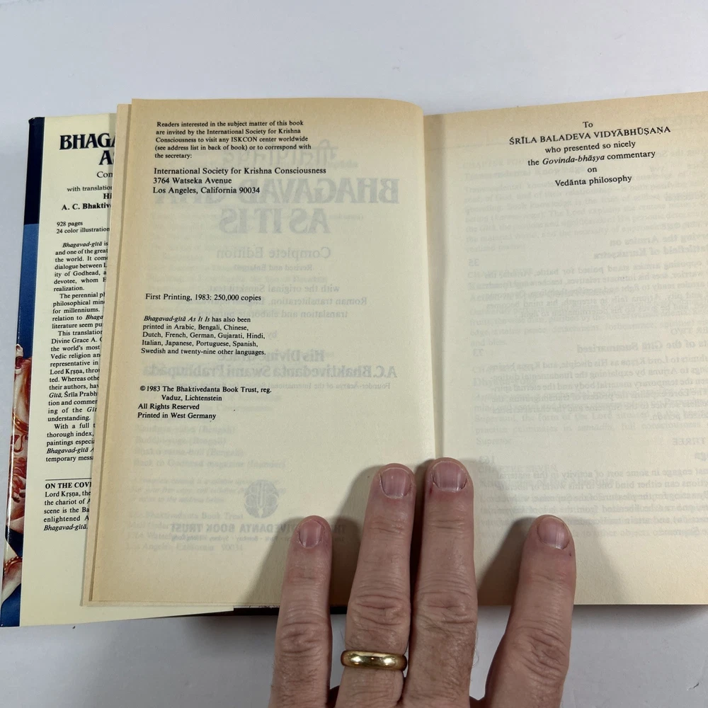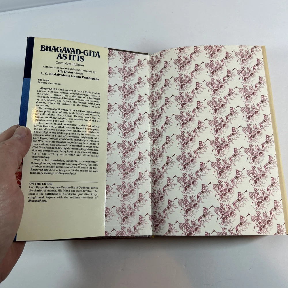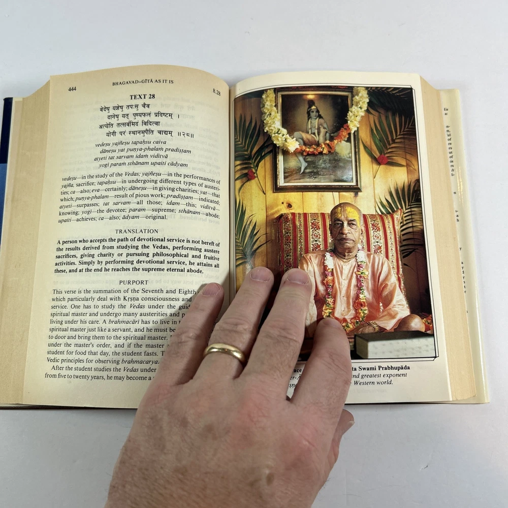 The Bhagavad-Gita As It Is 1983 hardcover vintage edition with brown gold trim is a special first print featuring illustrated plates. Published by Bhaktivedanta Book Trust, the book is a nonfiction narrative exploring comparative religion and the ancient world. Authored by His Divine Grace A.C. Bhaktivedanta Swami Prabhupada, this academic history piece offers insights into the mind, body, and spirit, making it a valuable addition to any collection for adults interested in religious texts and enlightenment.