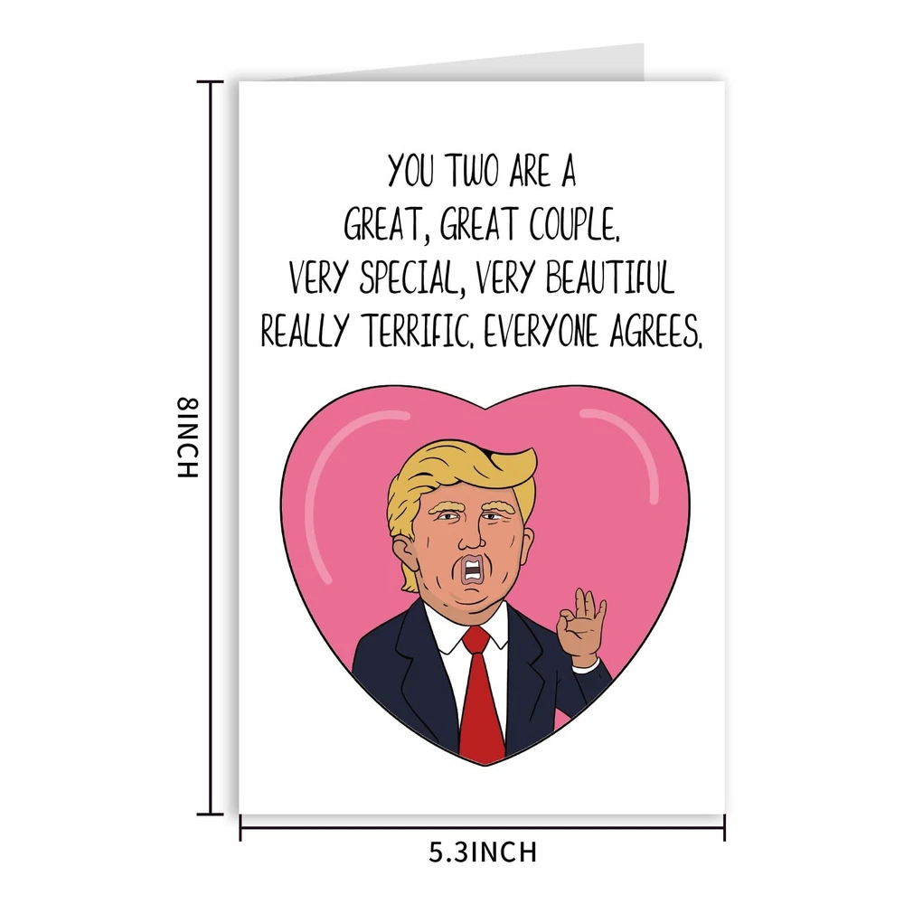 Funny Wedding Card Funny Bridal Shower Card Funny Wedding Congratulations Card Engagement Card Funny Wedding Congrats Card for Bride Gift This humorous greeting card is themed with Trump saying 'OK' and expresses the best,really great,Believe me. The best gift for friends or family members who are about to get engaged or get married will definitely make them happy and moved. 300gsm natural white embossed paper has a quality look and feel, The uncoated side will absorb more of the ink from your pen to make smudging a thing of the past Size:8 X 5.3in /20.5 x 13.5cm. Printed environmentally and blank inside, you can design it by yourself, draw it on or write what you want,Comes with a envelope and protective pouch to prevent damage to the card SATISFACTION GUARANTEED: We take pride in providing high-quality products and excellent customer service. If you have any questions or concerns, please contact us, and we'll be more than happy to assist you.