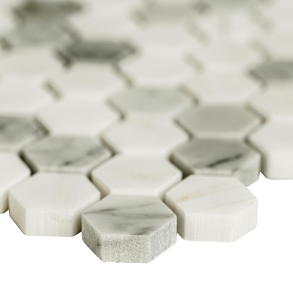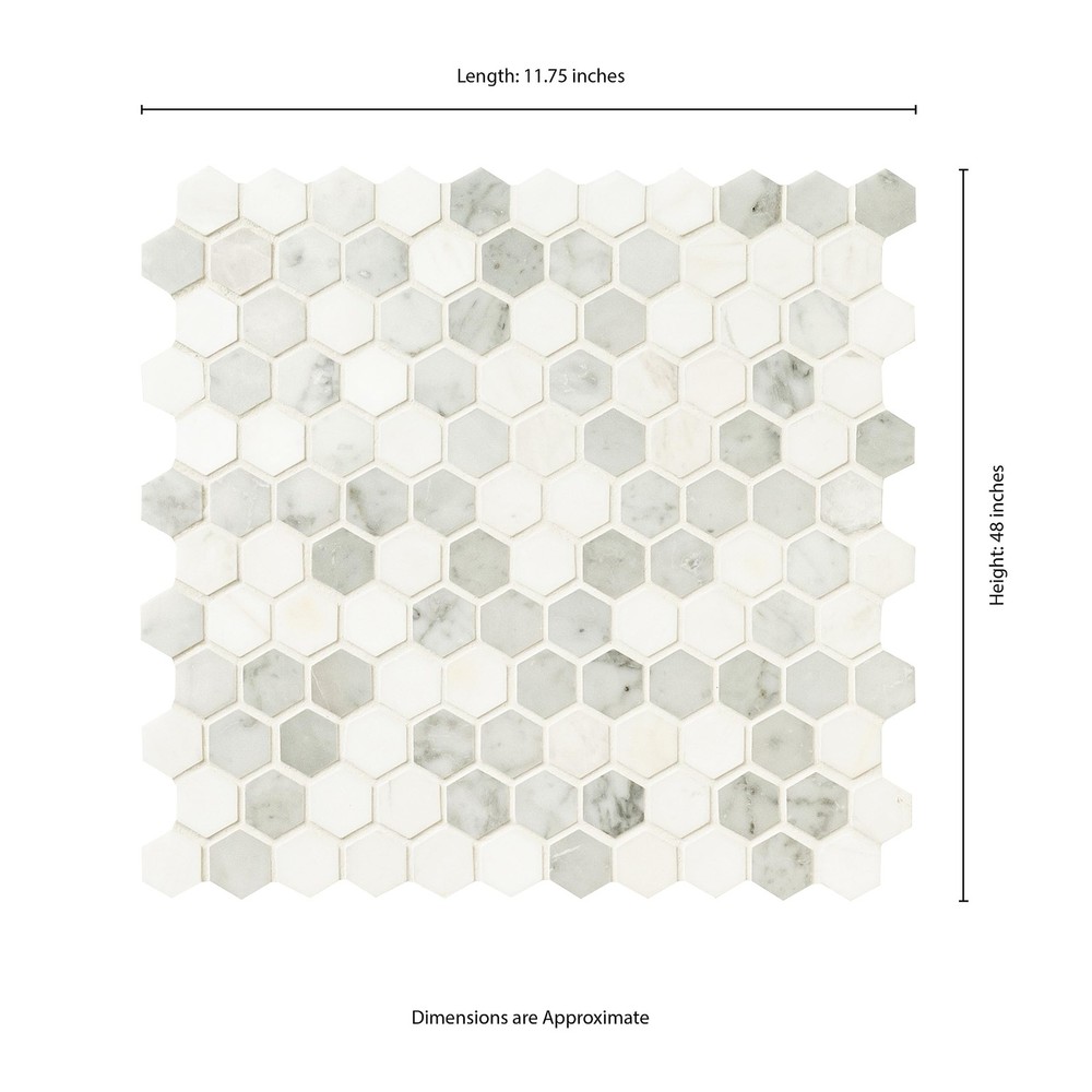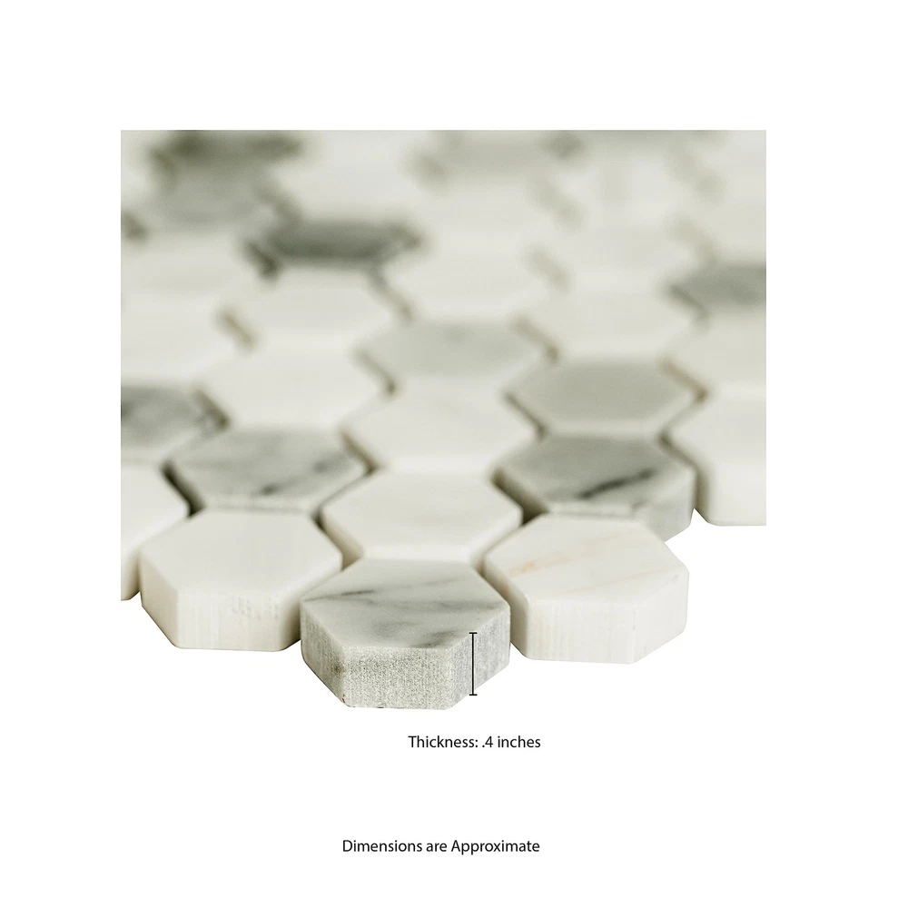 High-quality natural marble hexagon mosaic tile from , available in 11.73 in. x 11.73 in. size, perfect for kitchen backsplashes, shower walls, and residential floors Unglazed polished finish with a high sheen and random variation in tone Vitreous flooring has water absorption of more than 0.5% but less than 3% for indoor use and some outdoor applications and is frost resistant To ensure proper coverage and design flexibility, we recommend purchasing a minimum of 10% overage to account for design cuts and patterns. Choose indoor air quality certified and GREENGUARD children and schools certified product for top-quality, durable, and stylish floor, wall tile that will stand the test of time and add value to your home.