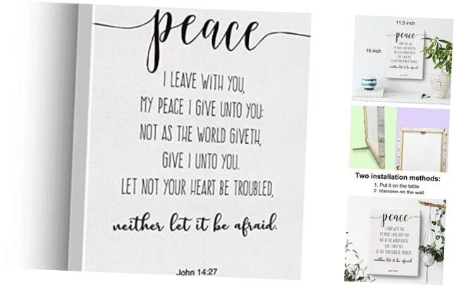 Menu 1. We require immediate payment. 2. We currently accept payment via eBay managed payments only. 3. Once payment is cleared, we will dispatch your shipment within 1-3 business days. Please refer to the "Shipping" tab for more information regarding shipping speed to your destination. Bible Verse Art Wall Decor John 14:27 Peace Scripture Canvas Painting Prints for Home Dining Room Living Room Wall Decor Framed Artwork Christian Gifts(12x15 Inch) Product description Size - 12*15 inches. Framed. Ready to Hang. High-quality Materials - High-quality materials make this product more distinctive. Waterproof and UV resistant. Durable. The patterns and text will be more attractive on high-quality canvas materials. Easy to Install - This canvas art print is easy to install. Ready to Hang. Just a simple operation can add interest to your life. Wonderful Decoration - Our canvas art print products have a variety of themes and styles. You can choose a decorative product that suits your taste from a variety of options. Let them exude outstanding charm in spaces such as home, office, kitchen, living room, nursery, bathroom, dormitory, etc. Excellent Gift Ideas – This canvas art print is a great gift choice. You can give it to yourself, but also to your parents, friends, relatives, colleagues, partners, neighbors, children, etc. The bright colors and excellent pictures are sure to give the gift recipient an unparalleled surprise and happiness. PLEASE MESSAGE US IF YOU HAVE ANY OTHER QUESTIONS, AND MANY THANKS FOR READING ALL OF THIS. Copyright ©#. All Rights Reserved.