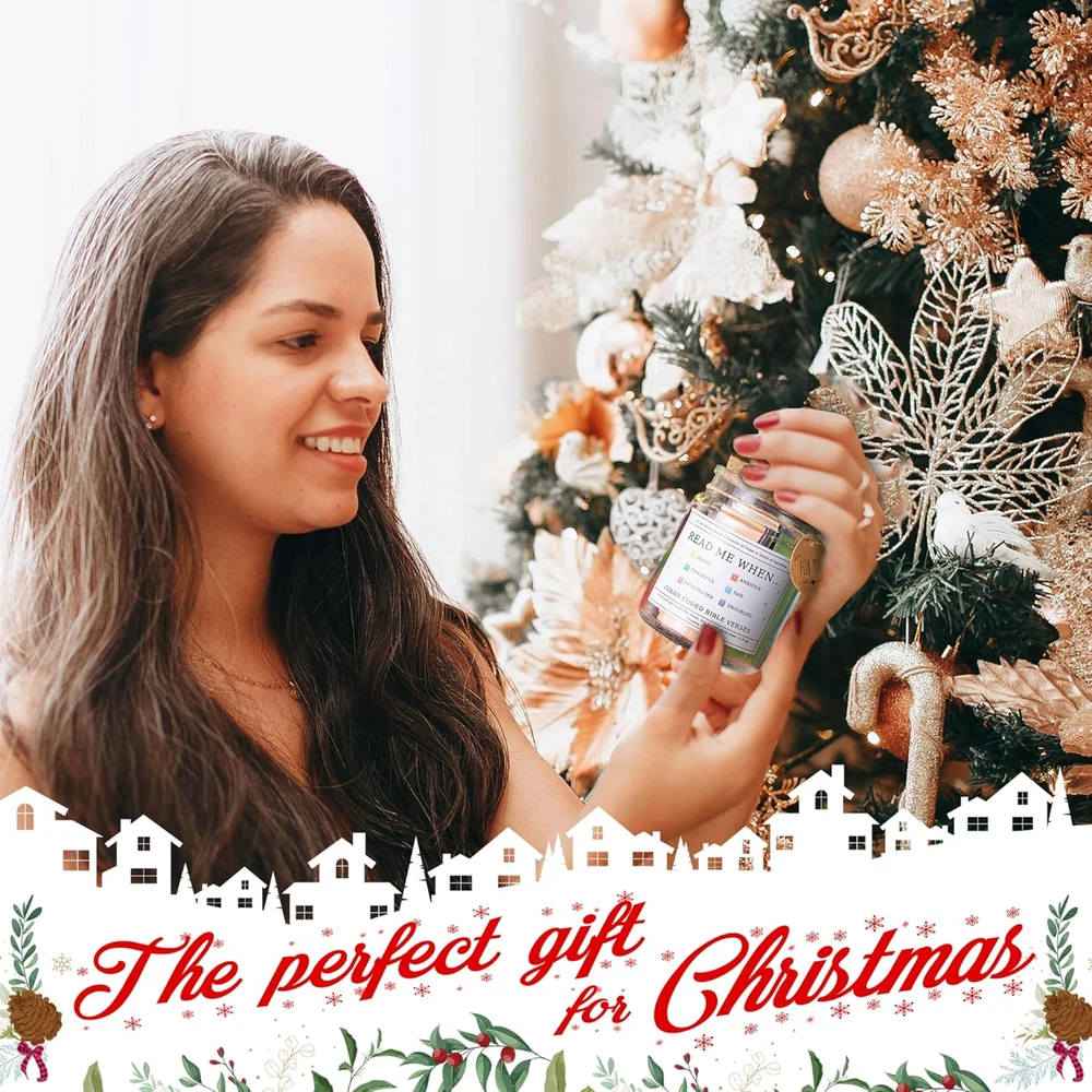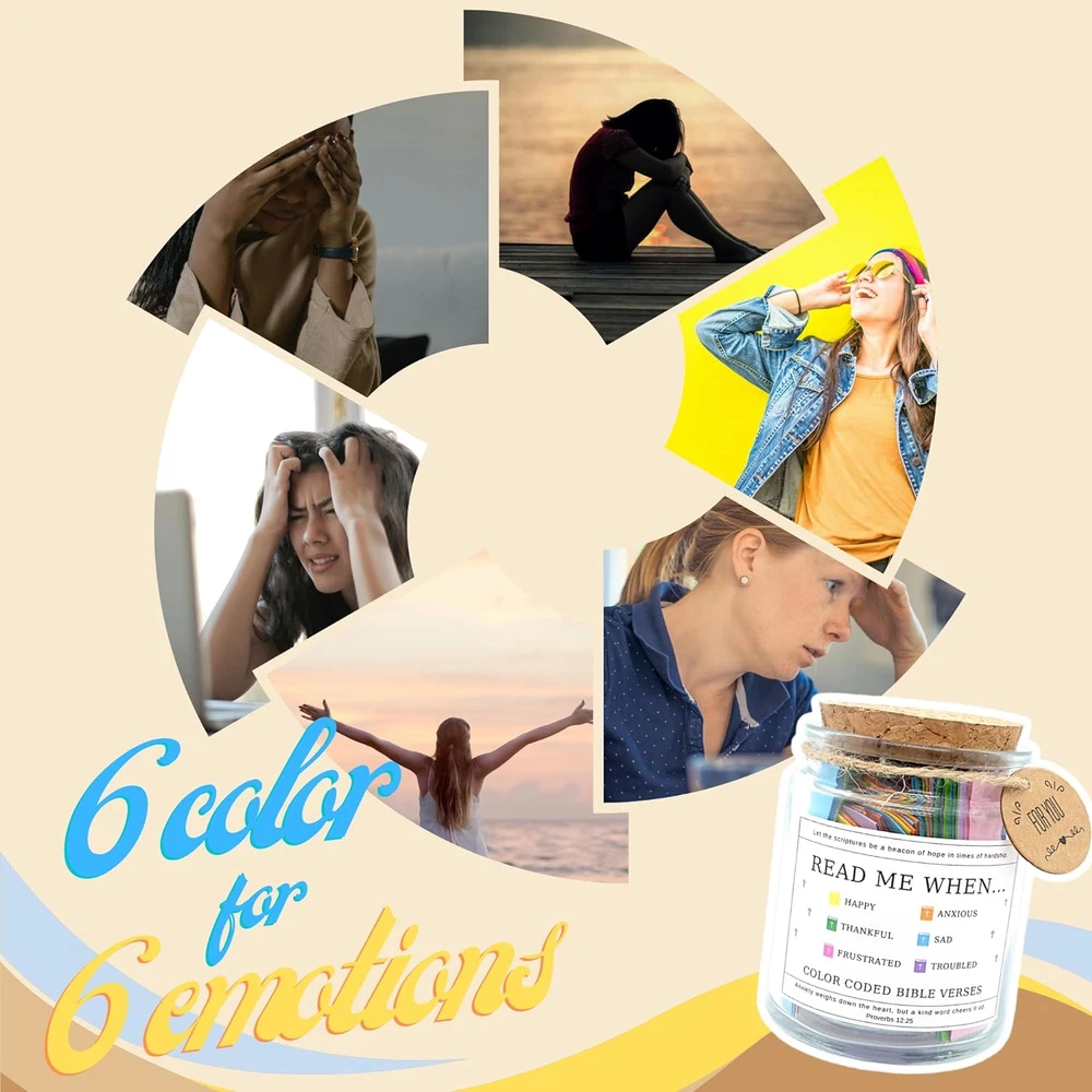【Inspirational Scriptures】The Inspire Bible Verse Glass Jar offers 92 sellected verses for comfort, inspiration, and encouragement. Select a card, absorb the wisdom of God and Jesus, and let these scriptures uplift your soul. 【Promotes Mindfulness and Gratitude】Utilize our Bible Verse Glass Jar to select a scripture that resonates with your emotions, fostering mindfulness and gratitude. Find solace or inspiration within the scriptures and renew your gratitude. 【Chapter and Sentence notes】In each card, there is a note on which verse each verse is in which bible, so you can easily remember and find that exact verse in the bible. 【Christian Gifts for Men and Women】The Bible Verse Glass Jar is a meaningful gift, providing spiritual support and guidance for their journey. Perfect for religious celebrations like Christmas, Easter, Baptisms, and birthdays, it expresses faith and blessings. 【Reusable】Crafted from durable glass, our Bible Verse Jar ensures long-term use. Product Description Bible verses jar - A gift for the soul. Introducing our product, the Bible Verses Jar, a beautifully crafted vessel containing 92 hand-selected scripture quotes. Each verse is meticulously curated with the intention of connecting the wisdom and values of God to everyday life. This product serves as a source of inspiration, guidance, and comfort for those seeking spiritual nourishment and enlightenment. With its exquisite design and meaningful content, the Bible Verses Jar is more than just a decorative item; it's a tangible expression of faith and a reminder of the divine presence in our lives. Perfect Gifts For Christmas The Bible Verse Jar for Christmas will make a wonderful gift for your loved ones this holiday season. With 92 carefully selected Bible verses, it will accompany you through every moment and emotion, offering inspiration and guidance. This thoughtful gift brings the true spirit of Christmas, reminding us of faith, hope, and love throughout the festive period 6 Colors for 6 Emotions Six colors symbolizing six different emotions, fitting for various stages in your life; let the messages from the Bible accompany you on the upcoming journeys READ ME WHEN YOU... Spreading Joy Each time you engage with your Bible jar, you're reminded of the abundance of happiness within and the power to uplift those around you. Let it be a beacon of light in your journey toward a more joyful and connected existence. Lighten the burden of life Each time you turn to your Bible Jar, you're reminded that you're not alone in facing life's trials. Let it be your companion on the journey to a lighter, more joyful existence. Faith and motivation in life Whether seeking guidance, solace, or simply a moment of tranquility, let the Prayer Jar be your companion on life's journey, infusing each day with renewed faith and purpose. Sources of the Bible Verses? The verses are taken from both the Old Testament (Psalms, Proverbs, Isaiah) and the New Testament (John, Philippians, Romans, 1 Peter, Corinthians). Suitable for Children? Yes, they are appropriate for children. The messages are positive, encouraging gratitude, patience, faith, and peace. They can be gifted as bookmarks, cards, or small gifts for occasions like Christmas or Easter. Does the product come with a gift box? Yes, the product comes with a gift box included , designed for a polished and elegant presentation. The box enhances the gifting experience, making it perfect for various occasions