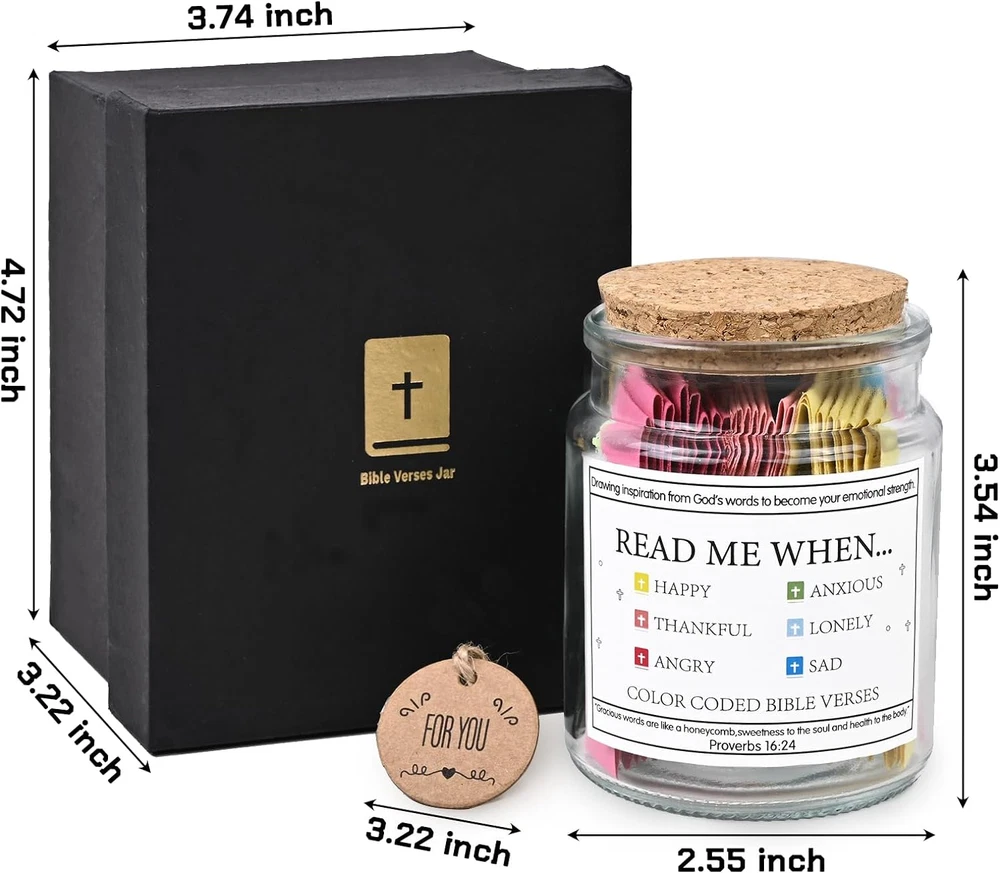 Bible Verses In A Jar Read Me When Bible Verses Jar For Emotions And Feelings ✅ Bible Verses in a Jar, Read Me When Bible Verses Jar for Emotions and Feelings,Glass the Hope Jar Bible Verses with Colored Bible Verse,Christian Gifts Church Biblical Faith Based Gift Product Description: The Bible Verses in a Jar is a beautiful Christian gift designed to uplift and encourage. Each jar contains a collection of carefully selected Bible verses, each printed on colorful paper strips. This inspirational jar is perfect for moments of reflection, offering comfort and hope when needed most. Whether you're looking for strength, peace, or guidance, this jar provides a daily reminder of faith and divine promises. Features: Inspirational Bible Verses : The jar contains a collection of Bible verses, each offering encouragement, hope, and wisdom to help guide you through life's challenges and celebrations. Colorful and Thoughtful Design : Each verse is printed on a vibrant, colorful paper strip, making the experience of reading them visually appealing and uplifting. Perfect for Any Occasion : This jar makes a meaningful gift for any Christian occasion, including birthdays, anniversaries, housewarmings, or as a thoughtful token of support during difficult times. Compact and Convenient : The glass jar design is both elegant and practical, allowing you to keep it on your desk, bedside table, or anywhere you need a reminder of God's love and strength. Encouraging and Comforting : Whether you're feeling down or simply seeking spiritual reflection, pulling a verse from the jar offers a moment of connection to your faith and spiritual healing. A Great Christian Gift : Ideal for friends, family, church members, or anyone seeking to strengthen their spiritual life, making it an excellent gift for pastors, youth groups, or prayer partners. Handcrafted Quality : Each jar is carefully put together with attention to detail, ensuring a thoughtful and personal gift that reflects your love and care. Daily Affirmation : Perfect for daily use, the jar serves as a reminder to trust in God’s plan, with each verse offering affirmation, encouragement, and peace to start or end your day. Unit Count 1.0 Count Capacity 2 Pounds Number of Items 1 Closure Type Twist Lug Pattern Solid Material Glass Shape Cylindrical Package Type sturdy cardboard box Item Dimensions W x H 2.55"W x 2.55"H Size 1 Pcs Shipping Fast shipping is very important for us. Our standard USA shipping service is FREE. Your order will be shipped within 1-2 business days upon full payment received. Your order will be delivered within 1-3 business days after the handling time. We only ship to the confirmed address. We reserve the right to cancel any order for any reason at any time. We are not responsible for undeliverable addresses. Returns and payment We offer a 30 days return policy from checkout winning date. FeedBack Your feedback very important to us, after you get your package and you are satisfied with our service please leave us positive feedback If you have any problem with your order / any questions please before leave any type of feedback For any questions, using eBay contact system Please visit our eBay store to check out other items for sale! Thank you for shopping at our store.