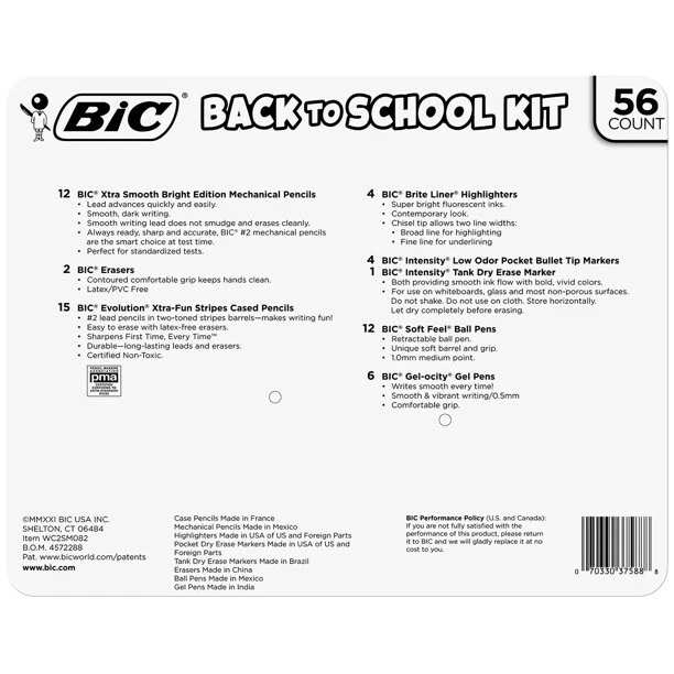 Bic Back to School Kit 56Pc Pencils Pens Dry Erase Markers Highlighters Erasers. Brand New. Stock up on school supplies with the 56-piece BIC Back to School Kit. This kit contains all the school supplies you need, including 15 BIC Xtra Fun Pencils with Erasers, 12 BIC Xtra Smooth Mechanical Pencils with Erasers, 12 BIC Soft Feel Ballpoint Pens with Soft Grips in Assorted Colors, 6 BIC Gel-ocity Gel Pens in Assorted Colors, 4 BIC Brite Liner Highlighters, 3 BIC Intensity Low Odor Dry Erase Markers and 2 BIC Erasers. BIC Xtra Smooth Mechanical Pencils have a versatile 0.7mm medium point, high-quality lead that doesn’t smudge and erases cleanly. It's the perfect mechanical pencil for school, with No. 2 lead that’s compatible with most standardized tests. BIC Gel-ocity Gel Stic pens have a precise 0.5 mm fine point with easy-flowing ink that writes fluidly and effortlessly. BIC Intensity Dry Erase Whiteboard Markers creates neat, bold lines on your whiteboard. These whiteboard markers are non-toxic and ACMI-approved -- ideal for use at school or for homework. BIC Brite Liner Highlighters have a chisel tip for both broad and fine lines. These bright highlighters have bold fluorescent ink perfect for homework, to-do lists and color-coding notes. BIC Soft Feel Ballpoint Pens have a versatile 1.0 mm point perfect for taking notes and doing homework. Evolution Xtra-Fun Stripes #2 Pencils are perfect for the classroom, standardized tests or create a fun everyday writing experience. 56 Piece Kit Includes: 15 Cased Pencils 4 Highlighters 2 Erasers 5 Dry Erase Markers 12 Mechanical Pencils 12 Ball Pens 6 Gel Pens Shipping Policy: We use calculated shipping, so you pay actual shipping only (no extra fees) Please check the shipping tab to see which option is cheapest for you We ship out the day after payment or same day if possible
