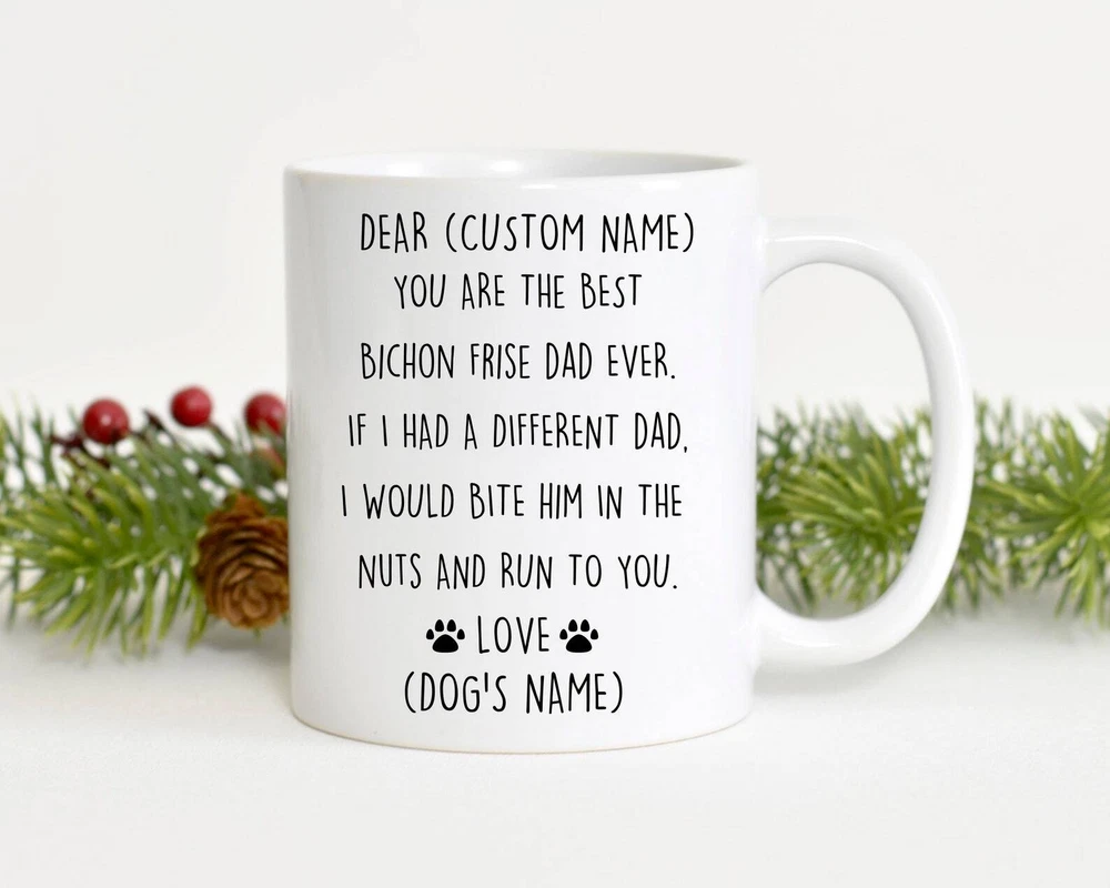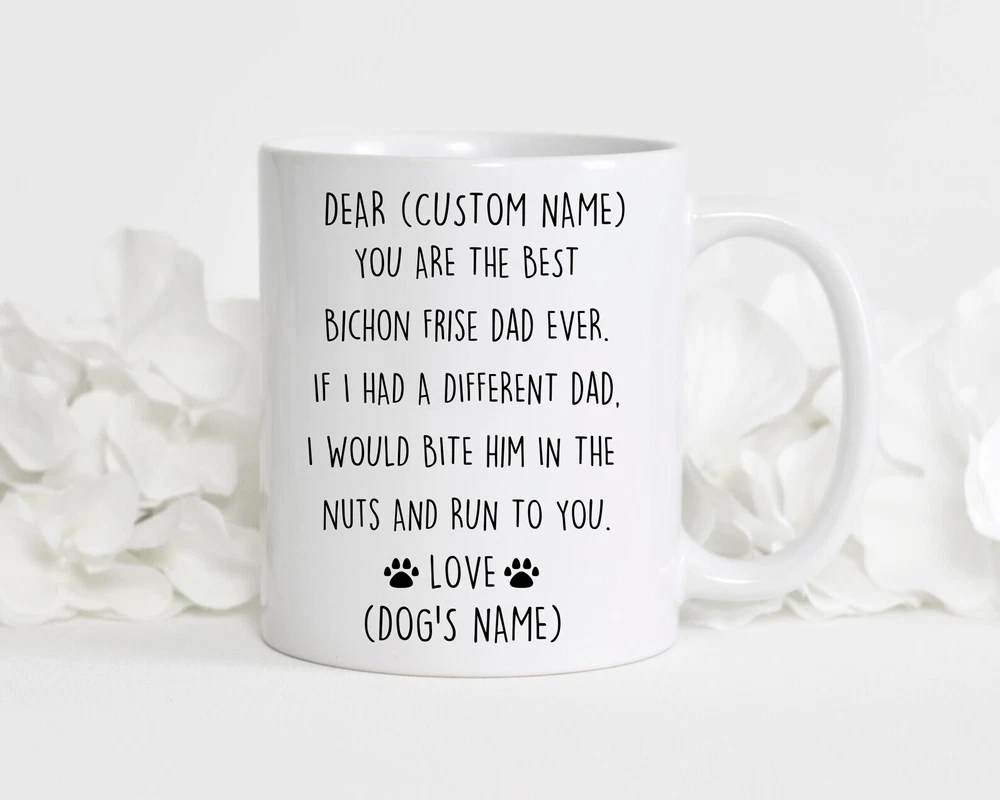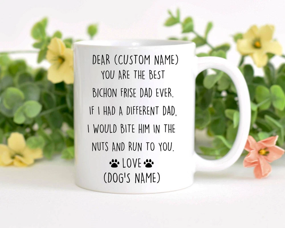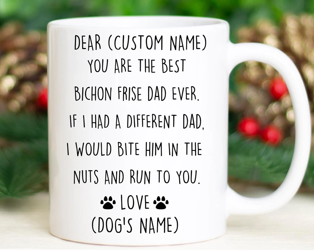 Bichon Frise Dad Birthday Gift Bichon Frise Dad Valentine Gift Bichon Dad Valentine Gift Funny Bichon Dad Appreciation Bichon Dad Mug Product Details.. This high quality 11oz. ceramic white mug has a premium hard coat that provides crisp and vibrant color reproduction sure to last for years. Perfect for all hot & cold beverages. The highest quality printing possible is used. It will never fade no matter how many times you wash it. Material: 100% Ceramic. Print both sides. Dishwasher and Microwave Safe. High Gloss + Premium White Finish. Printed in the U.S.A. Personalized & Custom. We support personalized and custom mug to add custom, when placing an order, you can add notes to the "order note" in shipping address section. Also you can contact us directly via message. Shipping Info. Ready to ship in 1 to 2 business days, All products are made-to-order and proudly printed in the United States. Shipped by USPS and DHL, You will receive your order in 5-7 days. Replace & Refund. All products are defective during shipping broken, chipped will be replaced free of charge. You are not satisfied with the product, we will refund 100% money to you. If any other issues arise, please do not hesitate to message, we would be more than happy to assist you.