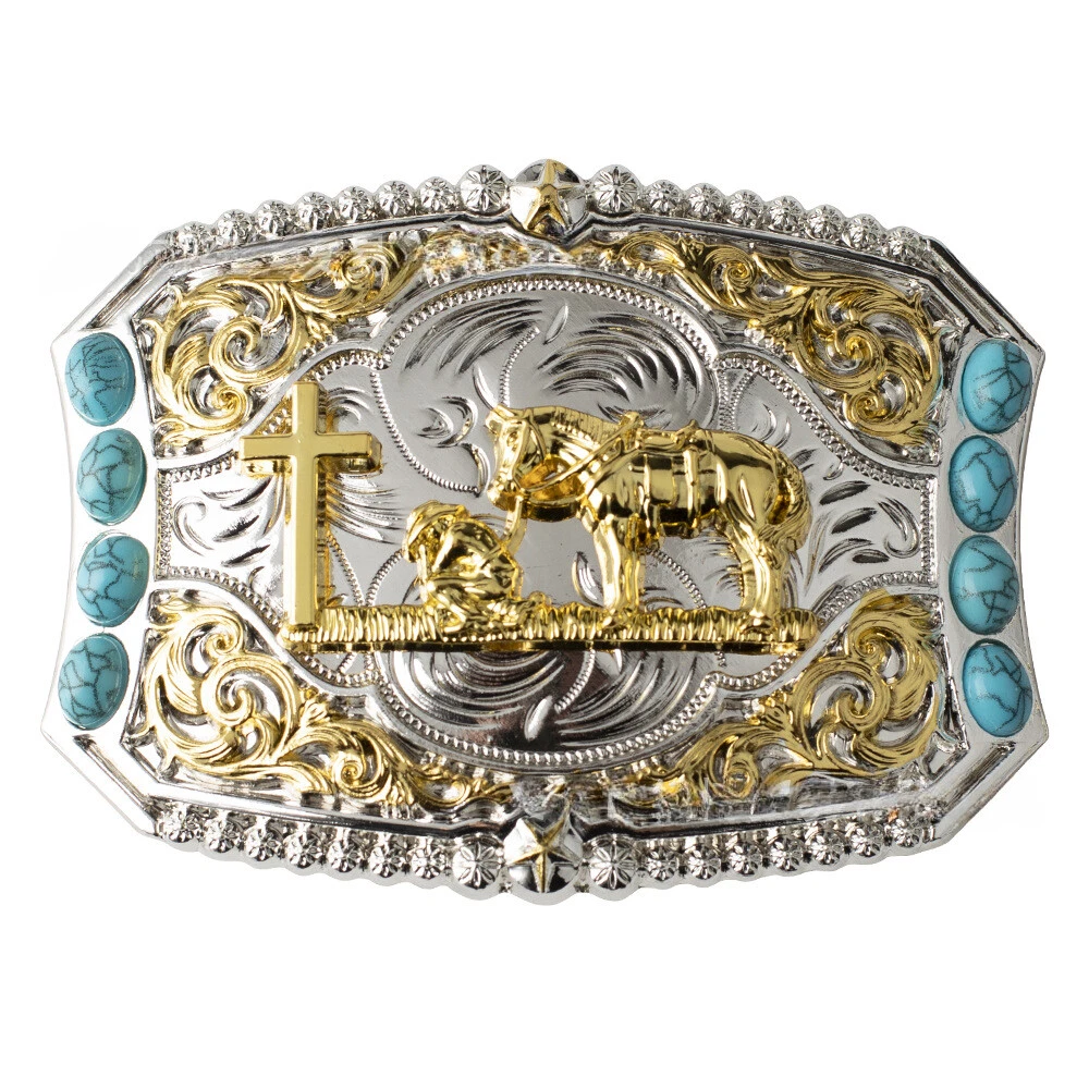 Add some western flair to your outfit with these Bicolor Horse Western Cowboy Belt Buckles. Perfect for men and women who love rodeo and casual wear, these buckles feature a patchwork design with a buckle accent and are made of zinc alloy. Measuring 8.8x6.5cm and fitting a 1.5 inch belt, these buckles are sure to make a statement. Themed with the Wild West, USA, animals, and more, these buckles are a great addition to any collection. Whether you're dressing up for a rodeo or just adding some character to your outfit, these buckles are a must-have for any western enthusiast.