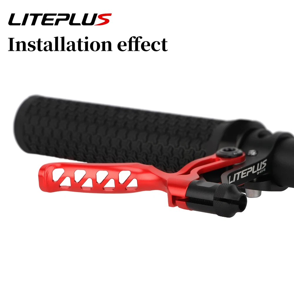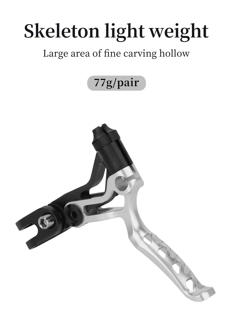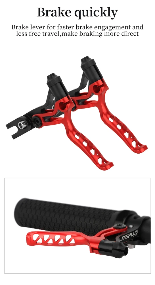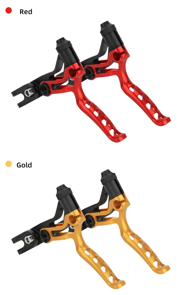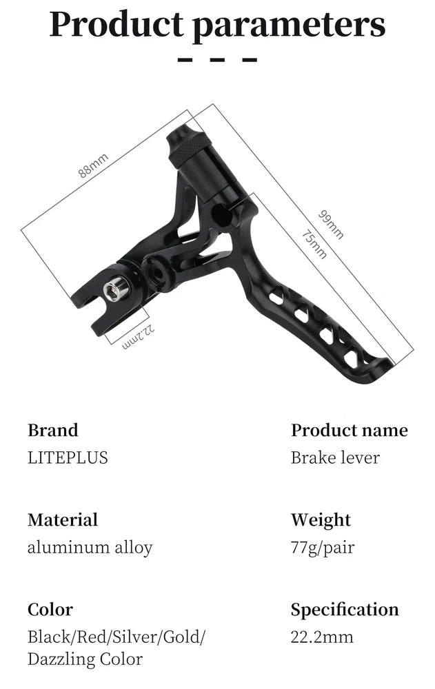 Product Name: Bicycle Brake Grip Material: aluminum alloy Weight: about 77 gr/para Specifications: for 22.2mm handlebars Color: black/red/silver/gold/colorful Properties: 1. The brake lever is made of high-strength aluminum alloy, which is integrally molded, stable and durable. 2. CNC processing, smooth edges, hollow design, one pair weight is only 77g. 3. The bearing is used as a connection turning point, the brake is simple and effortless, and the reverse rebound is fast. 4. Suitable for foldable bikes, mountain bikes, road bike modification, BMX.