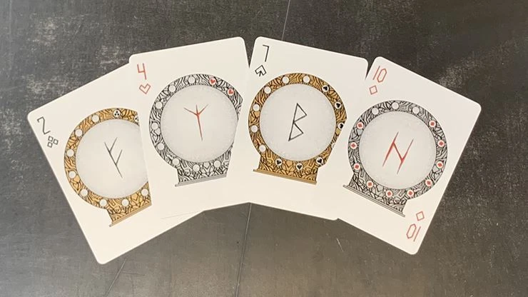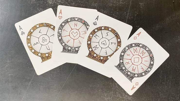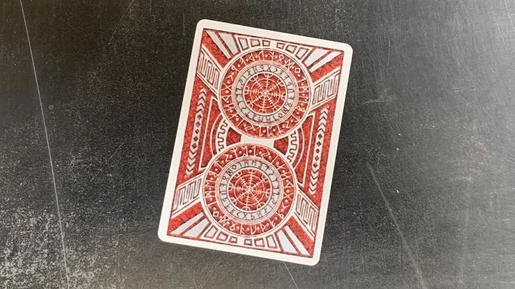 Please note: We only sell genuine playing cards from bonafide manufacturers. The sold-out Runes is back by popular demand in a new colorway of silver and red! A completely custom PCD Originals deck of playing cards based on the Elder Futhark, the oldest runic alphabet from Germanic & Nordic tribes. You will find a total of 24 runic letters used on the number & court cards. >br> The runes on the Aces spell out the corresponding suit and the Jokers feature a decorative octagram. The main feature of the back design is based on the famous rune circles. A double back & informational card are also included. Besides using this as a fun unique deck for your next card game, it is also perfect for performing mysterious themed magic tricks and using for cartomancy. Printed by USPCC on classic stock Traditional cut Standard Poker size Air-cushion embossed finish Metallic inks used on cards & box 52 cards & 2 Jokers Double back & info card Designed by Juniardi Satyanagara Produced by Will Roya Limited edition of 2,000 2023 release ____________________________________________________________________________________________ Are you ready to elevate your poker game with original playing cards? Visit our store today to browse our selection of authentic decks and start playing like a pro. Remember, when it comes to poker and other card games, we only sell original cards from genuine sources. Experience the difference for yourself and take your gameplay to new heights with premium quality playing cards.