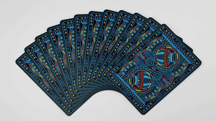 Please note: We only sell genuine playing cards from bonafide manufacturers. Tlaloc, The Storm God. This is the 2nd deck depicting the gods of Mexico's ancient Aztec religion. Tlaloc is the God of Rain. Worshipped as the giver of life and sustenance, but also feared for his power over hail, thunder, lightening, and even the rain itself. Associated with caves, springs, and mountains, specifically the sacred mountain, Mount Tlaloc, where he is said to reside. Meixca artists use the color blue to represent Tlaloc, and he will always be carrying a vessel that contains water. This colorful and intricately hand drawn deck honors ancient Aztec traditions by bringing their past back to the present. Makes a fantastic addition to any card collection and adds an element of interest and design to any card game. This deck is part of Collectable Playing Cards 1000 DECK CLUB. Only 1000 decks will be printed with an exclusive "CPC 1000 Deck Club" seal. Own one of the first 1000 decks to be printed! If any of these decks should be reprinted in the future, they will host the standard Bicycle seal. Total print run for Bicycle Tlaloc was 1152 Bicycle branded Printed by USPCC Air-cushion finish Hand drawn artwork and custom pips 1000 Deck Club seal ____________________________________________________________________________________________ Are you ready to elevate your poker game with original playing cards? Visit our store today to browse our selection of authentic decks and start playing like a pro. Remember, when it comes to poker and other card games, we only sell original cards from genuine sources. Experience the difference for yourself and take your gameplay to new heights with premium quality playing cards.