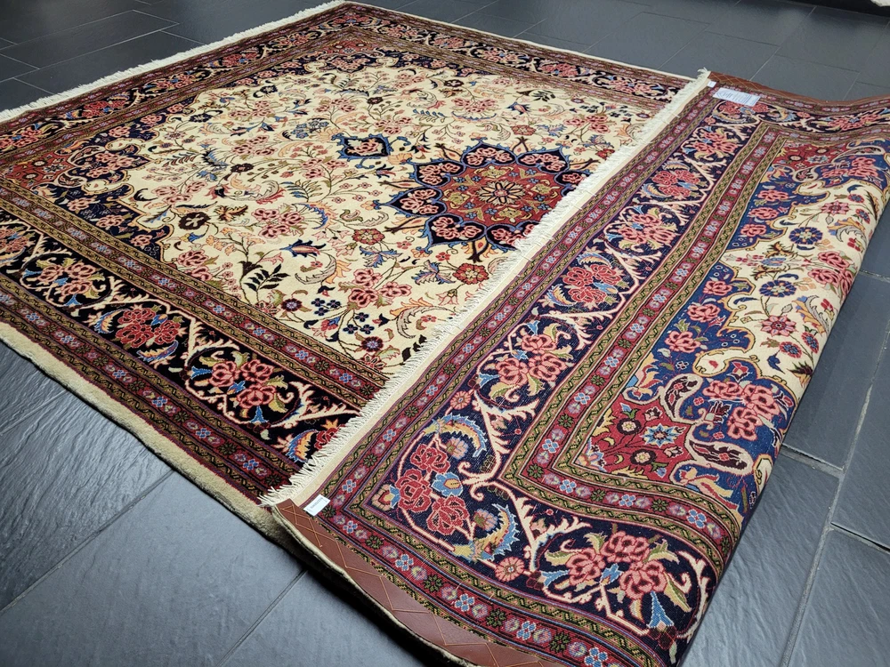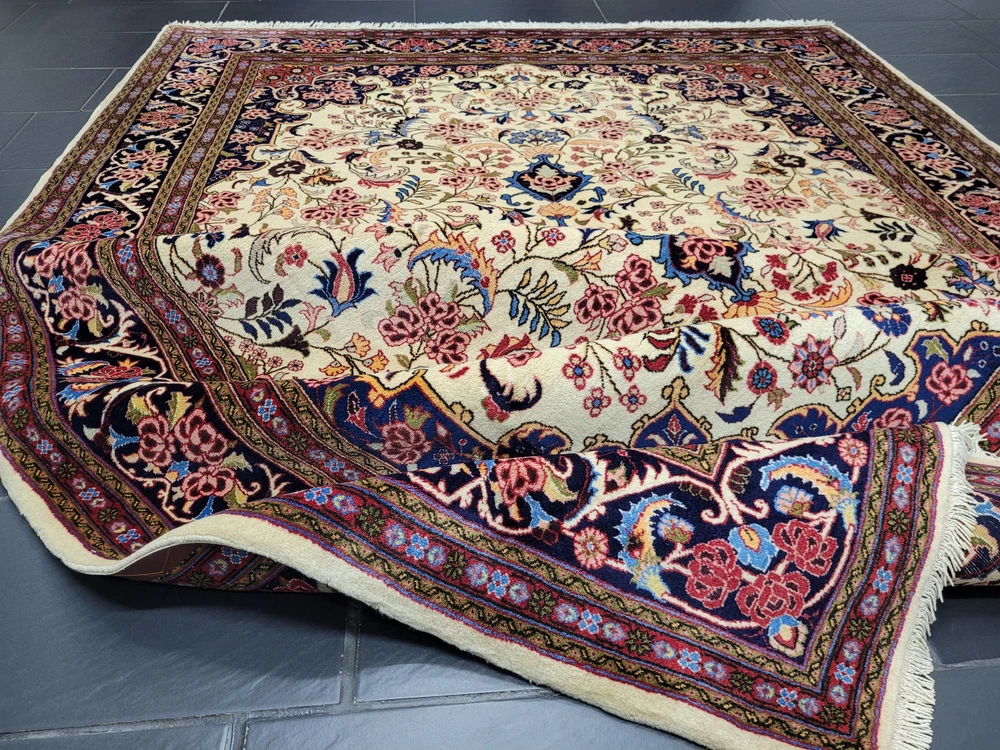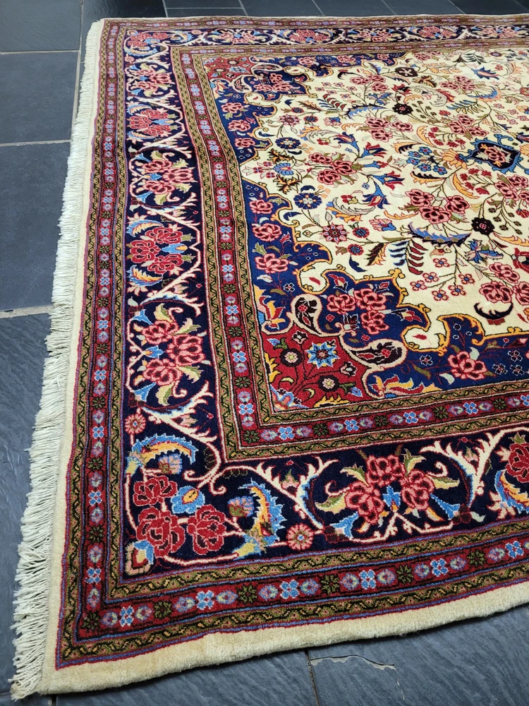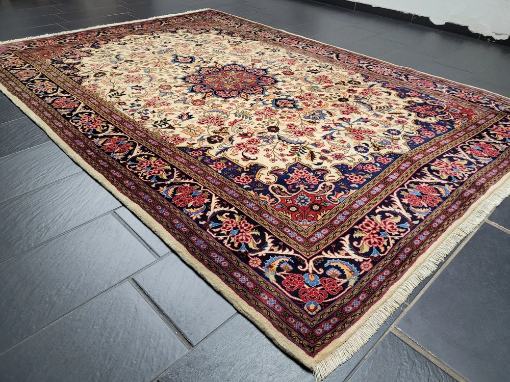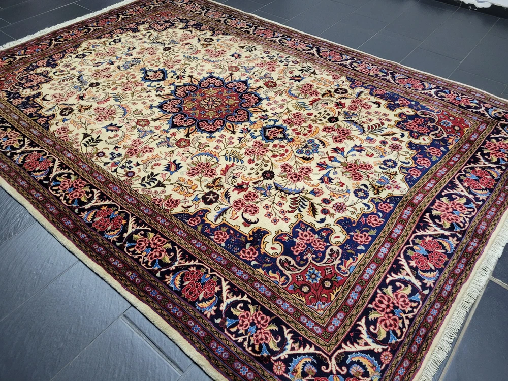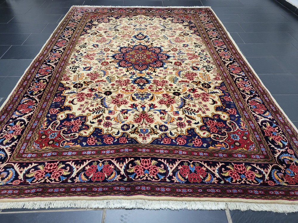 Herzlich willkommen, zum Verkauf steht ein fein gearbeiteter, handgeknüpfter Bidjar-Teppich aus dem Iran, gefertigt aus hochwertiger Korkwolle. Das Stück beeindruckt durch sein dichtes, strapazierfähiges Florbild und das für Bidjar typische florale Medaillon-Design. Der cremefarbene Fond wird von einem reich ornamentierten Mittelmedaillon in Rot- und Blautönen sowie von einer breiten, dunkelblauen Bordüre mit detailreichen Blütenmotiven gerahmt. Artikelnummer: GJH25/259 Maße: 300 × 195 cm Gewicht: ca. 26 kg Details: Technik: Handgeknüpft Material: Reine Korkwolle auf Baumwollkette Provenienz: Bidjar, Iran Motiv: Zentralmedaillon mit floralem Allover-Muster und klassischer Bordüre Farben: Creme, Dunkelblau, Rot, Rosé, Goldgelb Knotendichte: Fein gearbeitet, typisch für Bidjar-Manufakturen Verwendung: Hochwertiger Sammler- und Wohnteppich, ideal für repräsentative Räume Zustand: Sehr guter Zustand. Der Teppich zeigt keine erkennbaren Gebrauchsspuren oder Beschädigungen. Die Bilder sind Teil der Zustandsbeschreibung. Versand: Wir versenden per GLS, UPS und DHL versichert weltweit.