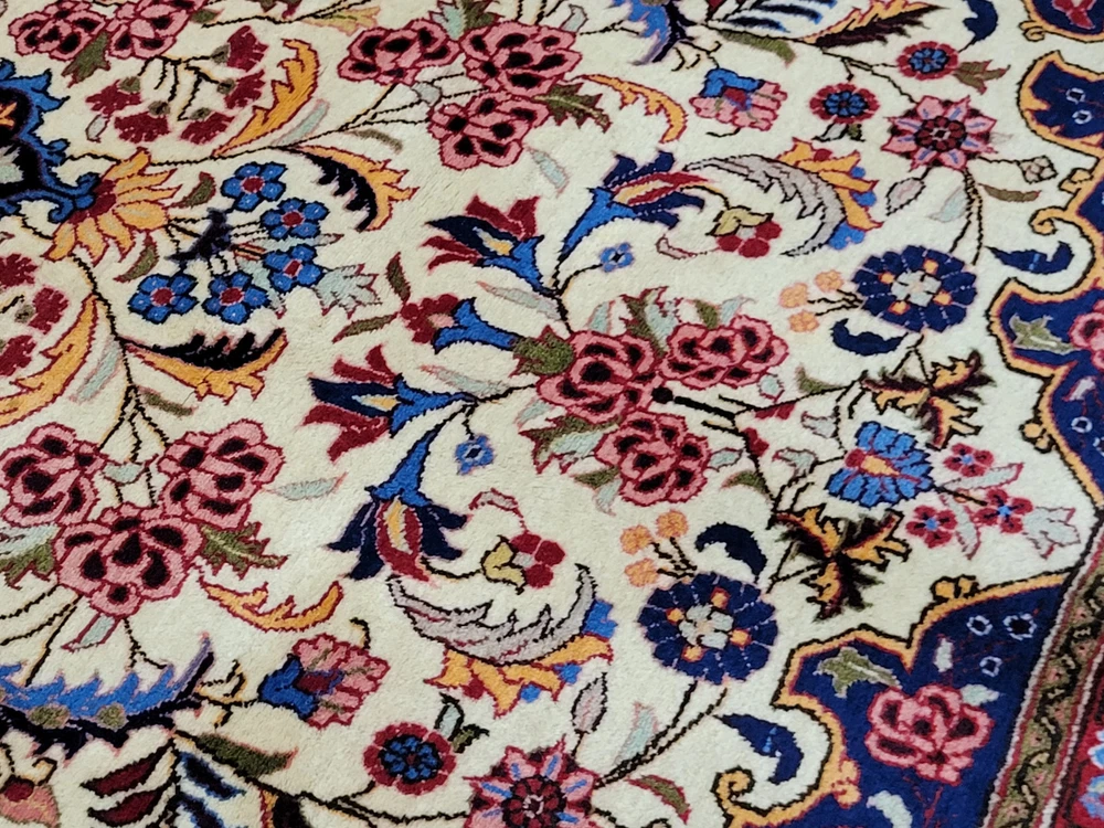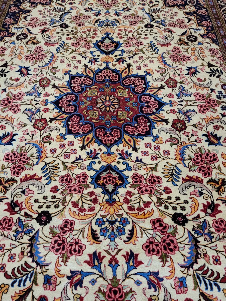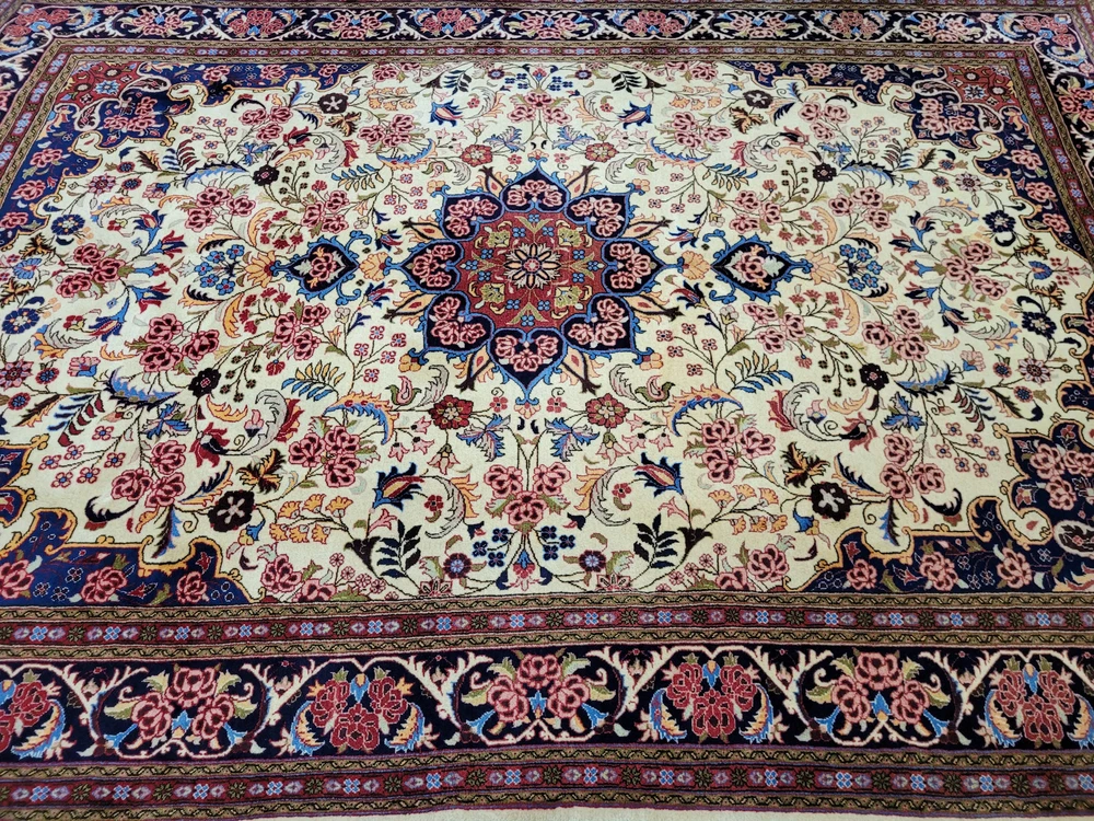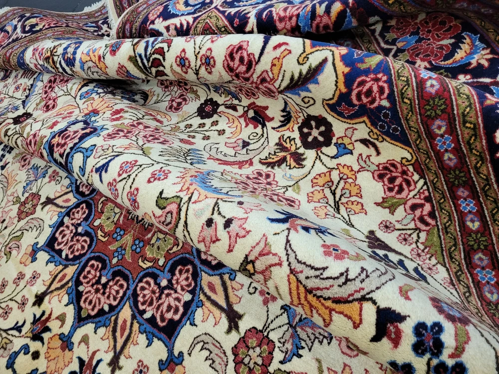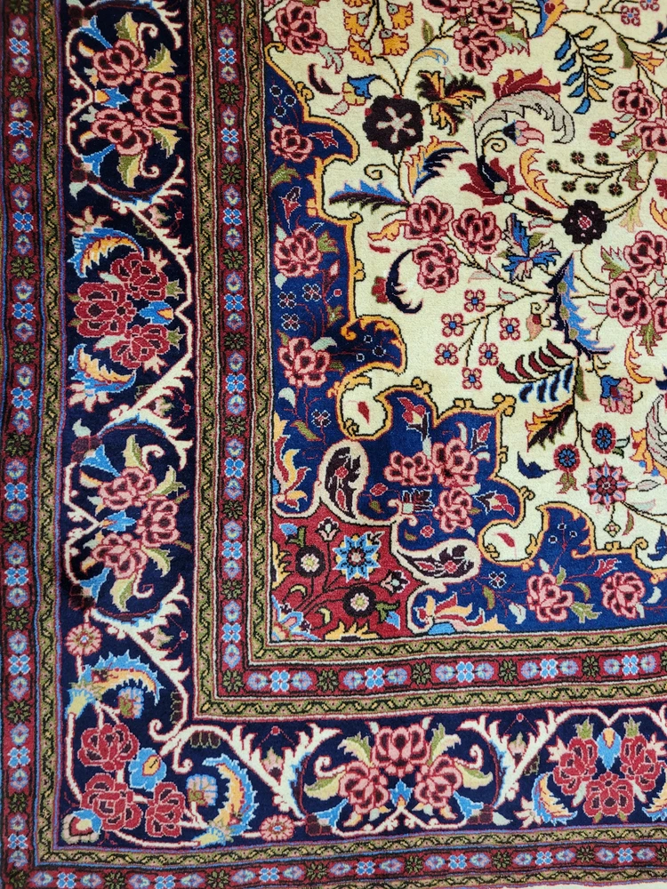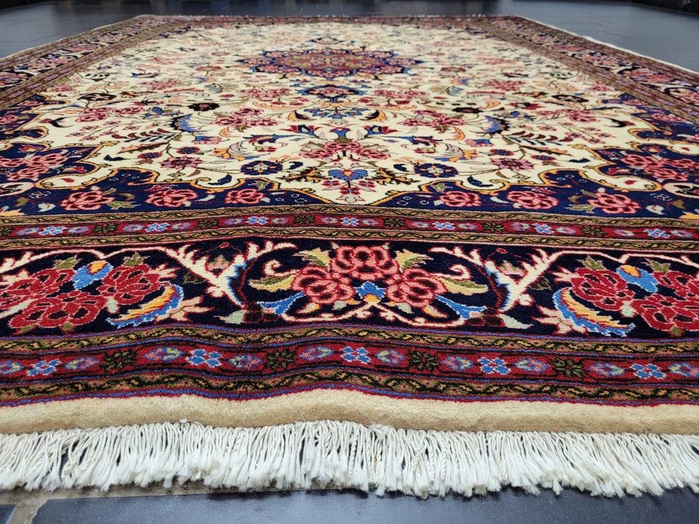 Herzlich willkommen, zum Verkauf steht ein fein gearbeiteter, handgeknüpfter Bidjar-Teppich aus dem Iran, gefertigt aus hochwertiger Korkwolle. Das Stück beeindruckt durch sein dichtes, strapazierfähiges Florbild und das für Bidjar typische florale Medaillon-Design. Der cremefarbene Fond wird von einem reich ornamentierten Mittelmedaillon in Rot- und Blautönen sowie von einer breiten, dunkelblauen Bordüre mit detailreichen Blütenmotiven gerahmt. Artikelnummer: GJH25/259 Maße: 300 × 195 cm Gewicht: ca. 26 kg Details: Technik: Handgeknüpft Material: Reine Korkwolle auf Baumwollkette Provenienz: Bidjar, Iran Motiv: Zentralmedaillon mit floralem Allover-Muster und klassischer Bordüre Farben: Creme, Dunkelblau, Rot, Rosé, Goldgelb Knotendichte: Fein gearbeitet, typisch für Bidjar-Manufakturen Verwendung: Hochwertiger Sammler- und Wohnteppich, ideal für repräsentative Räume Zustand: Sehr guter Zustand. Der Teppich zeigt keine erkennbaren Gebrauchsspuren oder Beschädigungen. Die Bilder sind Teil der Zustandsbeschreibung. Versand: Wir versenden per GLS, UPS und DHL versichert weltweit.