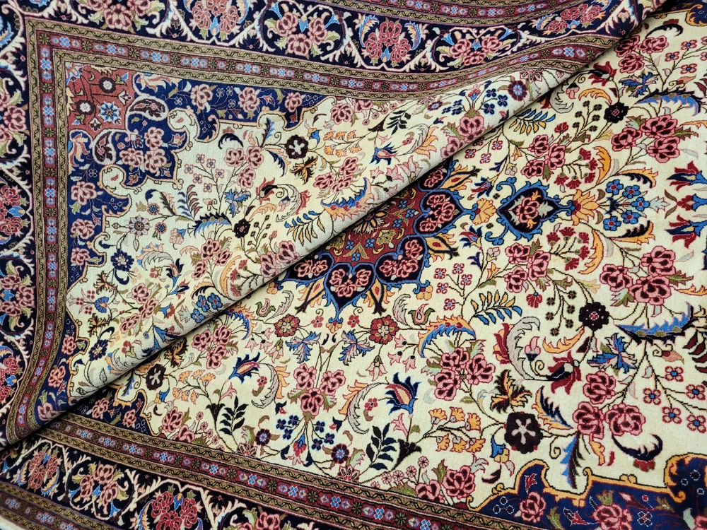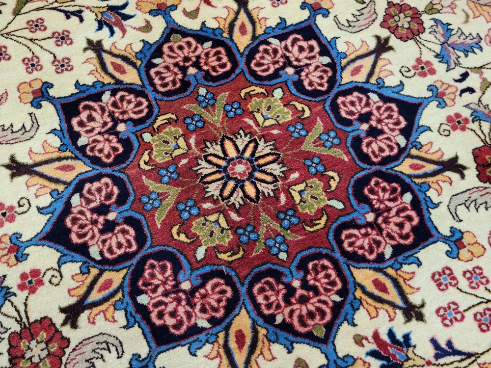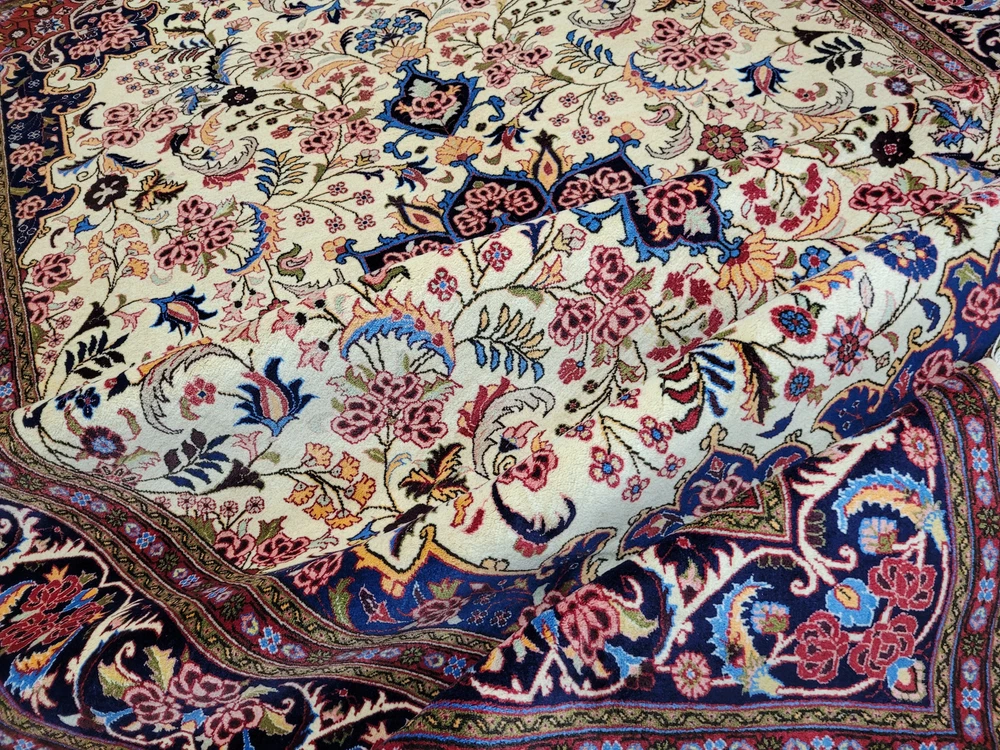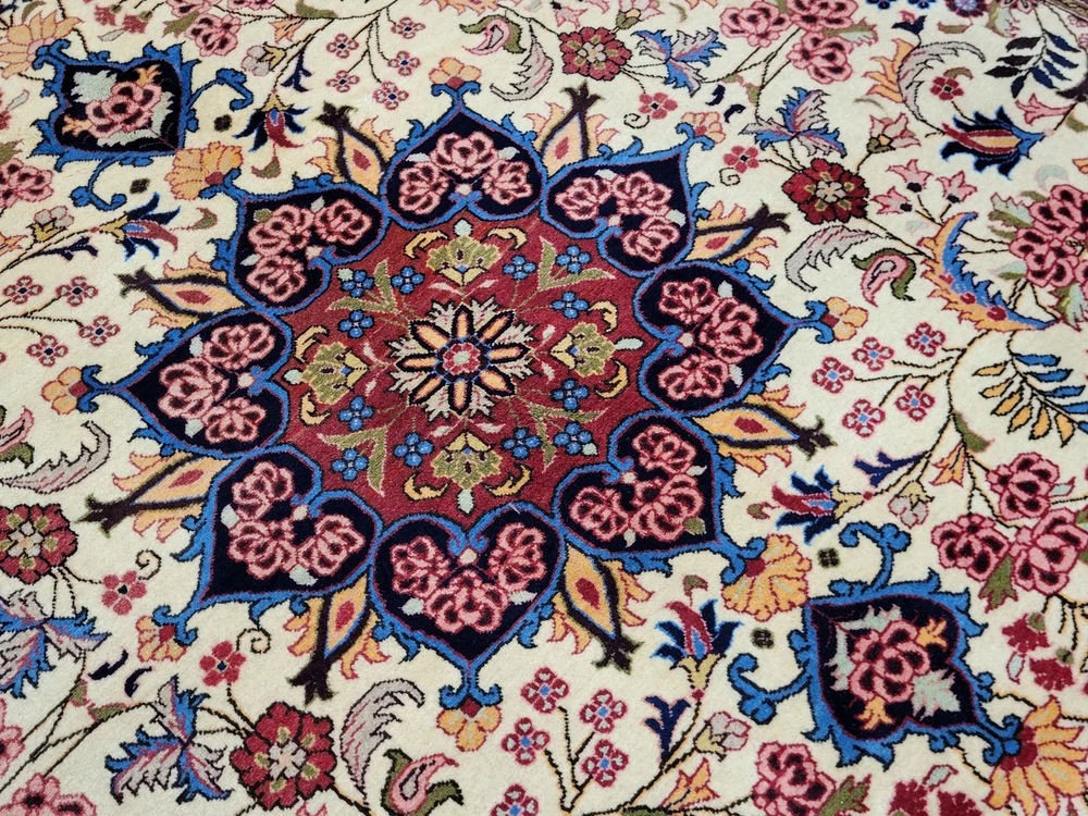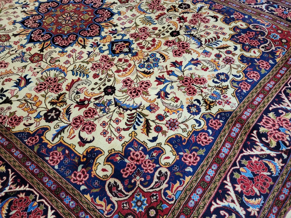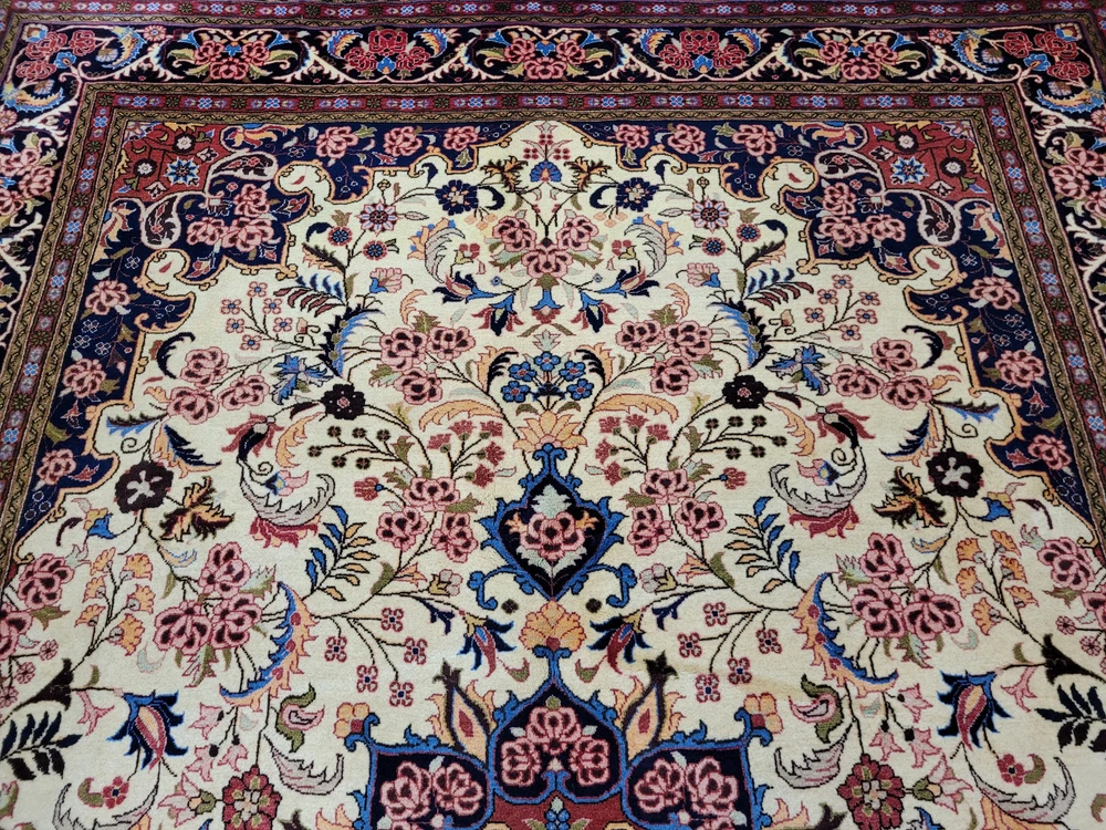 Herzlich willkommen, zum Verkauf steht ein fein gearbeiteter, handgeknüpfter Bidjar-Teppich aus dem Iran, gefertigt aus hochwertiger Korkwolle. Das Stück beeindruckt durch sein dichtes, strapazierfähiges Florbild und das für Bidjar typische florale Medaillon-Design. Der cremefarbene Fond wird von einem reich ornamentierten Mittelmedaillon in Rot- und Blautönen sowie von einer breiten, dunkelblauen Bordüre mit detailreichen Blütenmotiven gerahmt. Artikelnummer: GJH25/259 Maße: 300 × 195 cm Gewicht: ca. 26 kg Details: Technik: Handgeknüpft Material: Reine Korkwolle auf Baumwollkette Provenienz: Bidjar, Iran Motiv: Zentralmedaillon mit floralem Allover-Muster und klassischer Bordüre Farben: Creme, Dunkelblau, Rot, Rosé, Goldgelb Knotendichte: Fein gearbeitet, typisch für Bidjar-Manufakturen Verwendung: Hochwertiger Sammler- und Wohnteppich, ideal für repräsentative Räume Zustand: Sehr guter Zustand. Der Teppich zeigt keine erkennbaren Gebrauchsspuren oder Beschädigungen. Die Bilder sind Teil der Zustandsbeschreibung. Versand: Wir versenden per GLS, UPS und DHL versichert weltweit.