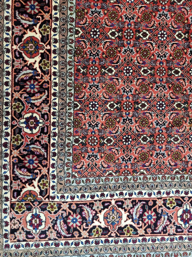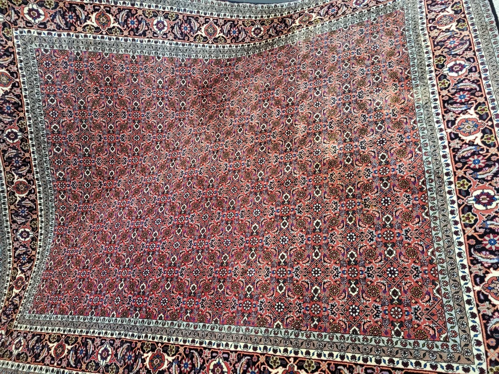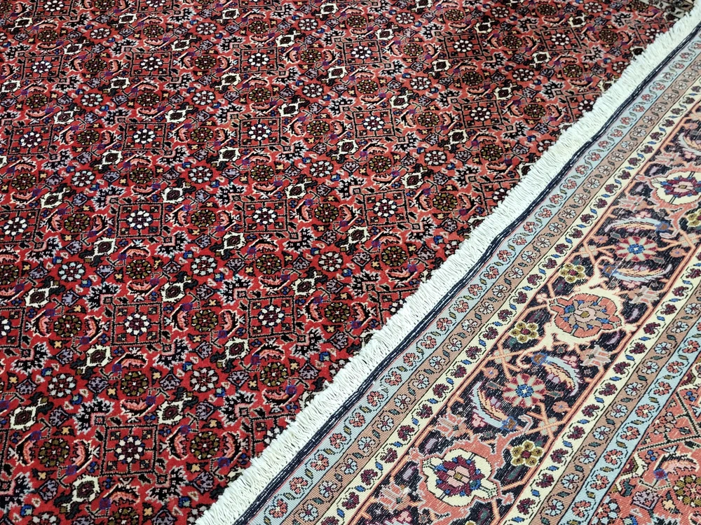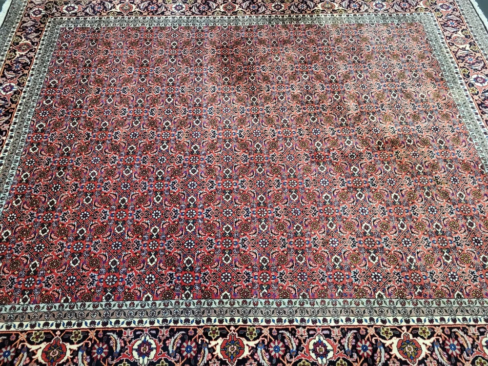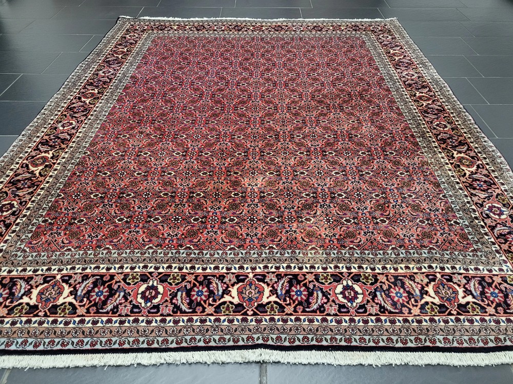 Herzlich willkommen, angeboten wird ein klassischer Bidjar Teppich aus reiner Korkwolle, handgeknüpft in dichter, kompakter Struktur. Dieses Stück besticht durch sein harmonisches Herati-Medaillon-Muster, das in feinster Ausarbeitung über das gesamte Feld verläuft und von einer mehrteiligen Bordüre mit floralen Ornamenten eingefasst wird. Artikelnummer: GJH25/264 Maße: 250 × 200 cm Details: Material: Korkwolle auf Baumwollkette, handgeknüpft Knüpfung: sehr fein und dicht, typisch für Bidjar Farben: kräftiges Rot im Fond, kombiniert mit Dunkelblau, Creme, Hellblau und Akzenten in Rosa und Grün Design: traditionelles Herati-Muster mit floralen Ranken und Rosetten Gewicht: ca. 28 kg – sehr kompakte Knüpfstruktur Verarbeitung: Der Teppich zeichnet sich durch seine außergewöhnliche Festigkeit und Langlebigkeit aus. Die dichte Knüpfung sorgt für ein ebenmäßiges, schweres Griffgefühl und eine außergewöhnlich feine Detailwiedergabe. Zustand: Sehr guter, gepflegter Zustand. Die Fotos sind Teil der Zustandsbeschreibung. Versand: Wir versenden per GLS, UPS oder DHL versichert weltweit.