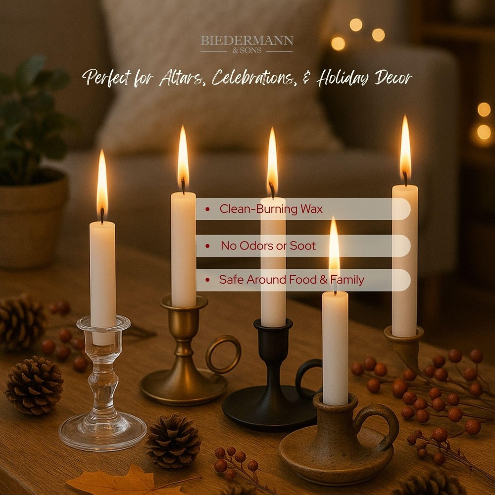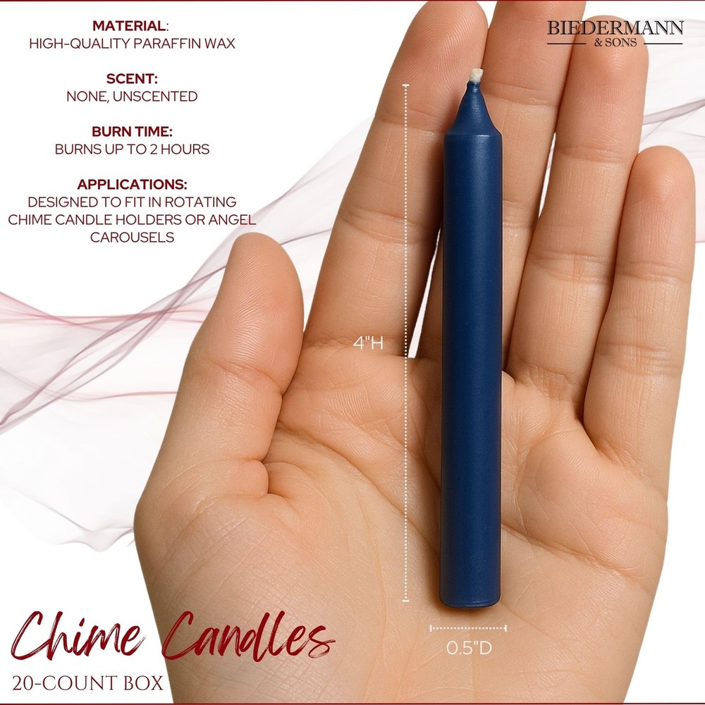 LASTING AMBIANCE: Enjoy beautiful candlelight with a long burning time of approximately 2 hours per candle. Adding peaceful home decor, these navy blue small chime candles are perfect for display. CONVENIENT SIZE & VALUE: Get a generous set of 20 candles in a convenient pack. These 4 inch long chime candles provide great value, perfectly sized tapers for various uses. CLEAN AIR: Enjoy a pure and clean atmosphere with our truly unscented chime candles. Made from quality wax, they provide a clean burn, ideal for use near dining areas or as part of a centerpiece. CLASSIC DESIGN: The classic design is perfect for various uses. Essential for altar work, meditation, spiritual ceremony decor, rituals, witchcraft, birthday celebrations, and Christmas displays. TRUSTED FOR DECADES: has provided quality decorative candles for home and events since 1956. Perfect for wedding, spring, easter, thanksgiving, advent, dinner, and prayer decor.