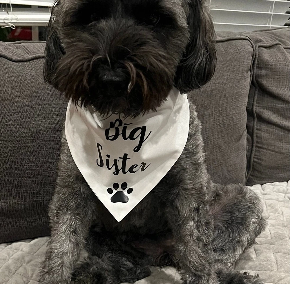 Do you have a new baby coming? let your dog show off his/her new title as a big brother/sister! BANDANA TRIANGLE SIZE: 26.4"x18"x18"(66x45x45cm) for neck size: 10-18inches(25-45cm)