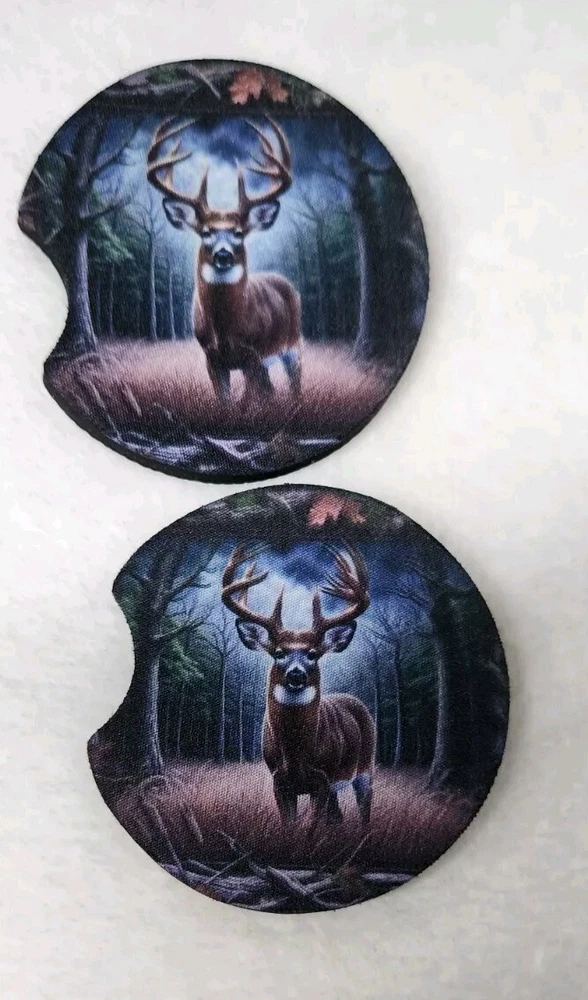 BIG BUCK IN THE WOODS . Set of 2 neoprene rubber backed non slip car coasters. 2.75" round Has a finger notch for easy placement and removal from your vehicles drink console. Handmade item ready to ship. Hand wash