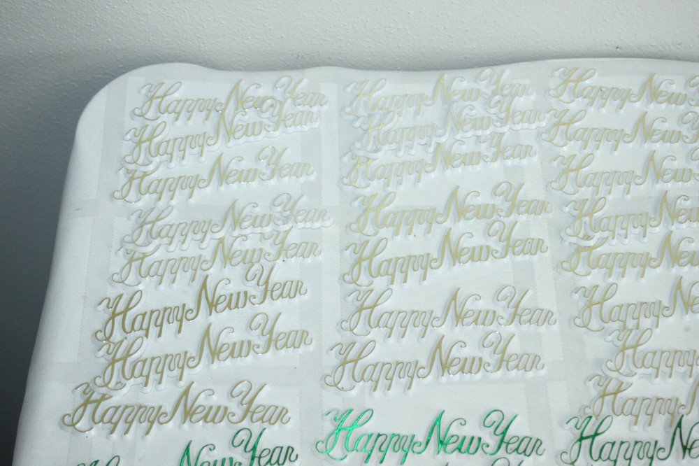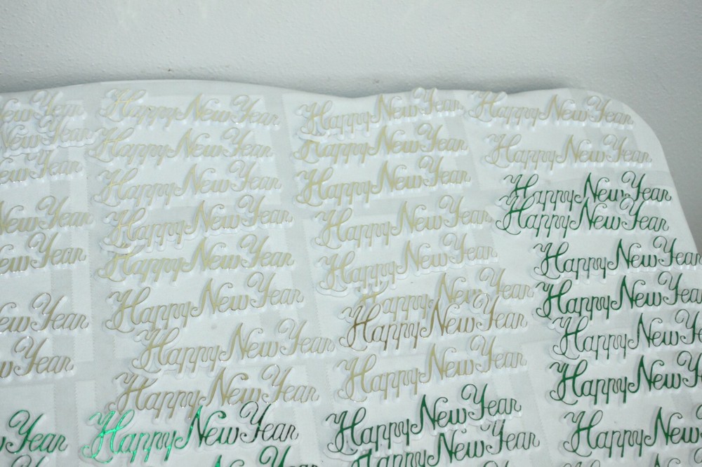 This is a big lot of plastic Happy New Year cake topper scripts. There are two different styles and different colors in each style. These are new, unused, but have been in storage for a while, so not perfect. Some have areas of missing color. Here is a list of all included: Happy New Year flat scripts, White plastic with metallic lettering - measure 4" long. 1) Red - 34 2) Green - 37 3) Gold - 33 Star and horn on long skewer - measure about 11" tall - decor piece is 2" x 3". 1) Green - 1 2) Blue - 2 3) Purple - 3 4) Red - 3