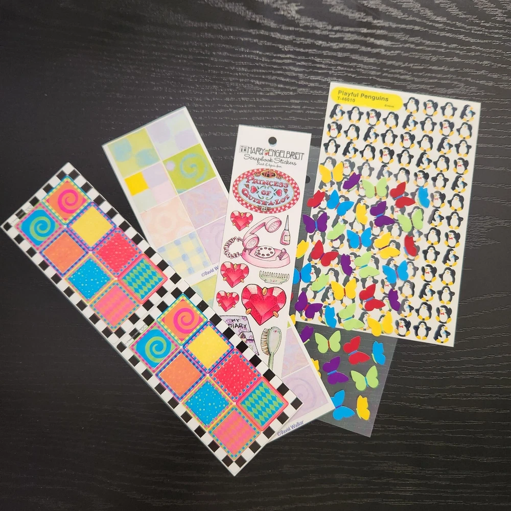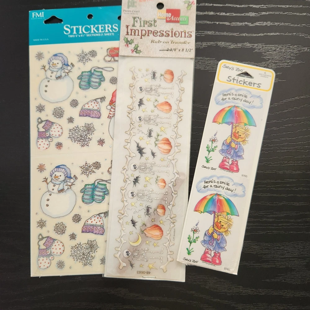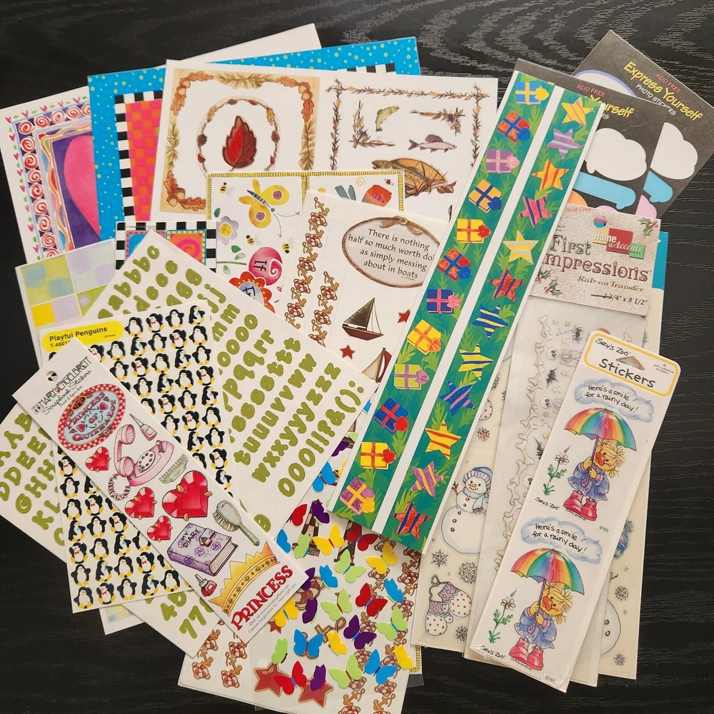 New Some in package, some loose. All sheets are complete (no missing stickers) There is also a new in package Halloween Run-on transfer Big Lot of stickers Various Themes Various brands