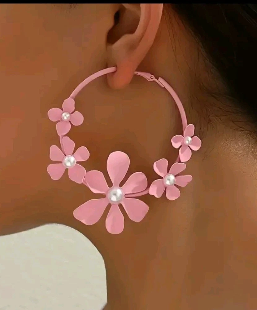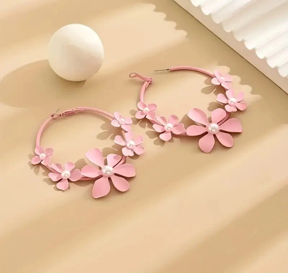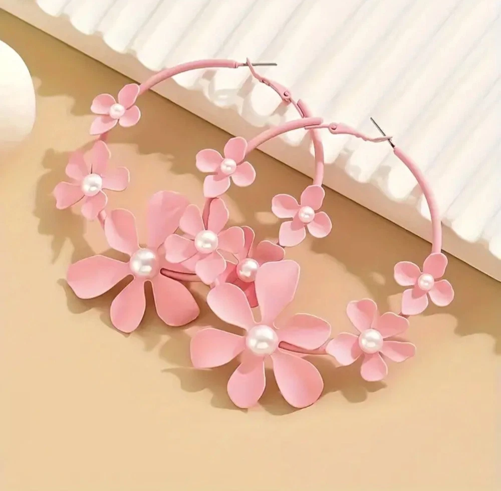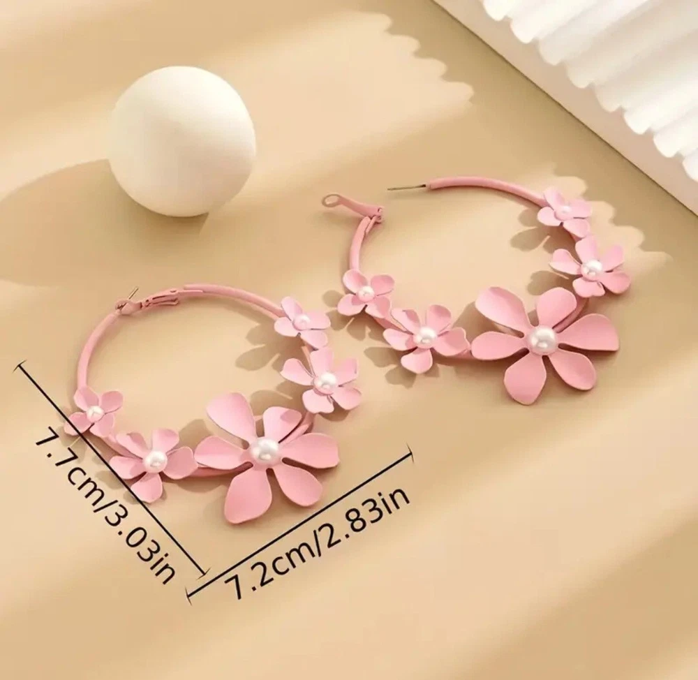 Big Pink Floral Earrings Unique Style Hoop Earrings Faux Pearls