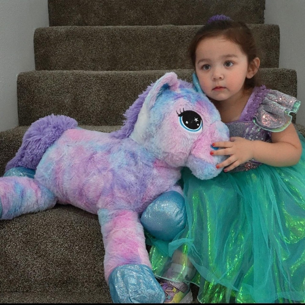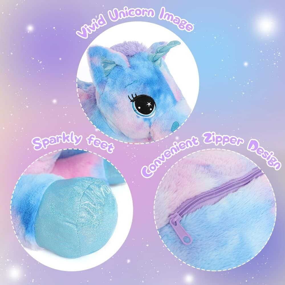 【Multicolor Unicorn】Adorable 31.6inch unicorn plush toy with dreamy plush, a sparkly blue horn, curious black eyes, and bright shimmery matching hooves. Big glittery embroidery eyes make unicorn plush toys look more lovely. 【Suitable Size】The 31.6 inch unicorn plush pillow is suitable for hugging and snuggling. This is a great choice for any decoration, you can put the stuffed unicorn in any bedroom or playroom. Decorate your room with dreamy blue unicorns and let you have a fairy-tale bedroom. 【Charming Details】Shinning eyes and colorful fur make the big unicorn stuffed animal exude a different cuteness and beauty. The zipper design is convenient to remove the filling when cleaning to ensure the durability of the stuffed unicorn. 【Soft High-Quality Material】Our cute unicorn plush toy with super soft fabric is made of plush and PP cotton, the material is very soft. When you receive it, you will feel the comfort and warmth that can't help but want to hug the unicorn plush. 【Best Gift for Unicorn Lovers】Perfect as a gift for Christmas, birthday, or any other holiday to your loved ones such as kids, babies, girls, boys, etc. A unicorn plush toy is not only a children's unicorn plush toy but also a partner to them.