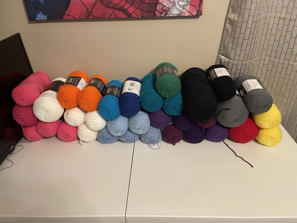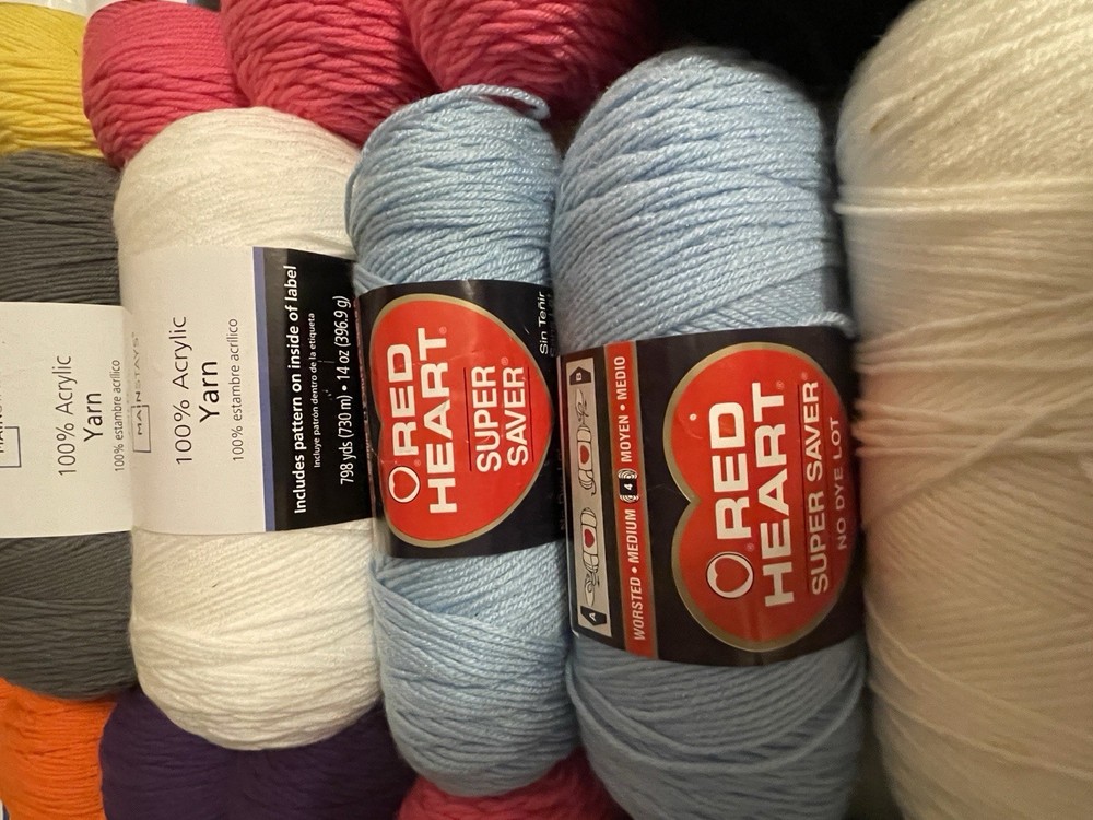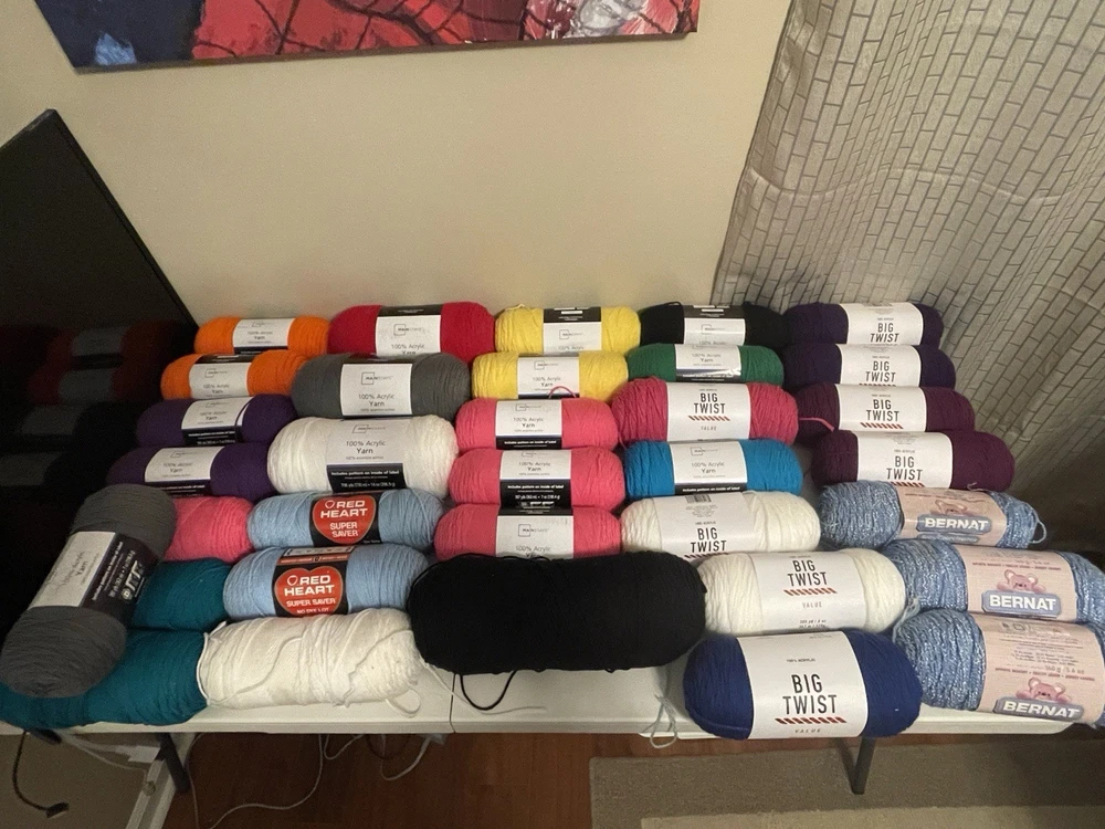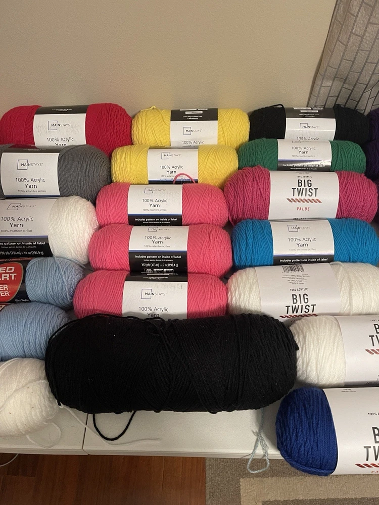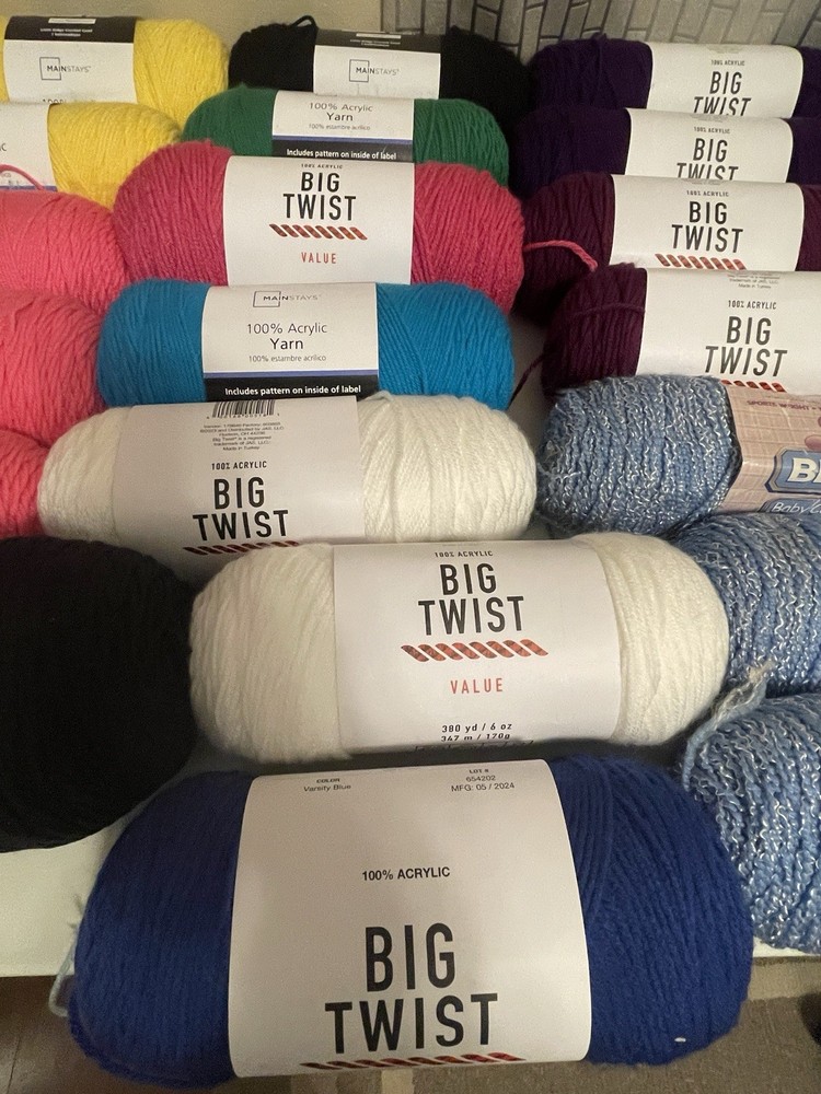 This bundle has a total of 34 new skeins. A breakdown of which 2 Red Heart brand, 3 Bernat, 8 Big Twist, 16 Mainstays (3 of those are jumbo size), and 5 unmarked because the label is missing. There is also a huge amount of yarn cakes that are made as well. The total weight of everything is 24lbs. This is being sold AS-IS. One white skein does have very light staining. See photos for details.