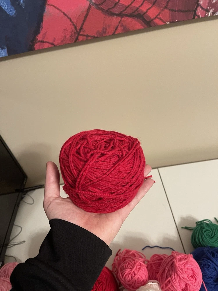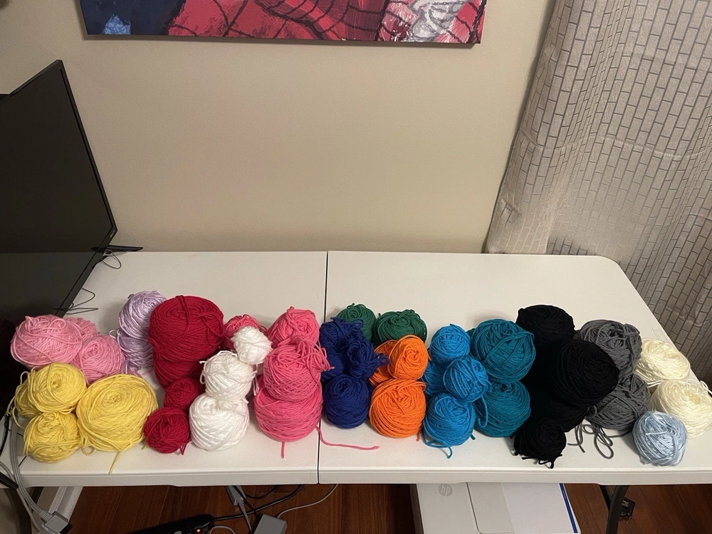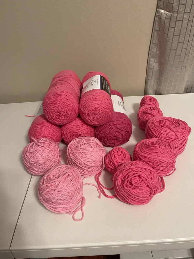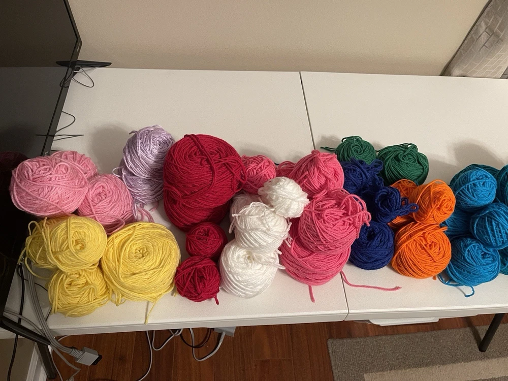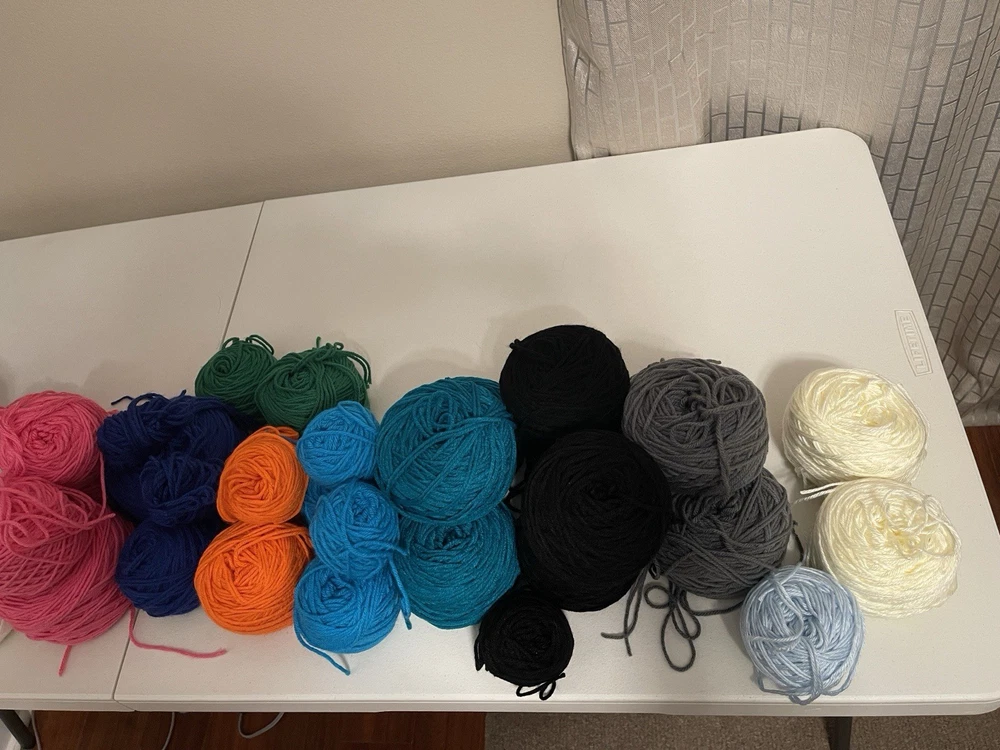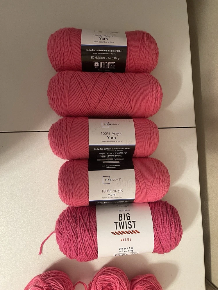 This bundle has a total of 34 new skeins. A breakdown of which 2 Red Heart brand, 3 Bernat, 8 Big Twist, 16 Mainstays (3 of those are jumbo size), and 5 unmarked because the label is missing. There is also a huge amount of yarn cakes that are made as well. The total weight of everything is 24lbs. This is being sold AS-IS. One white skein does have very light staining. See photos for details.