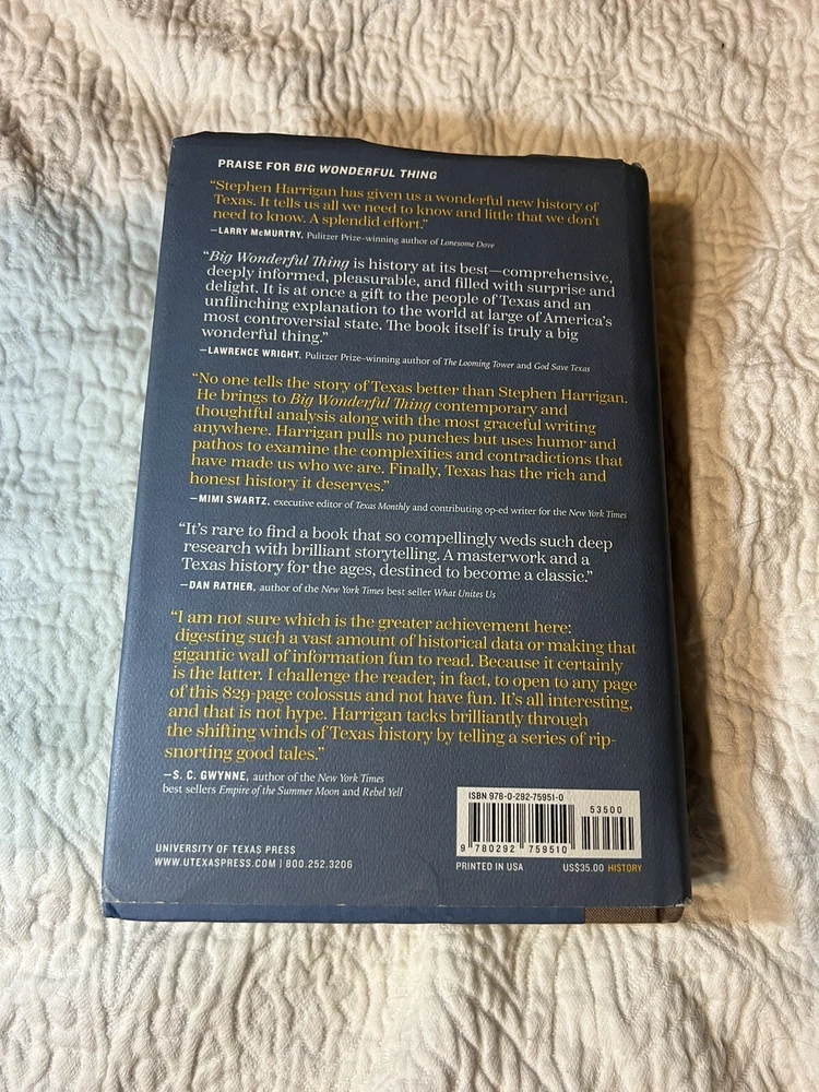 Publication Year:2019MPN:Does not applyTopic:United States / State & Local / Southwest (Az, NM, Ok, Tx)Book Series:The Texas Bookshelf Ser.Item Length:9.5 inGenre:HistoryNumber of Pages:944 PagesISBN:9780292759510gtin13:9780292759510Item Weight:61.1 OzItem Height:2.5 inFormat:HardcoverLanguage:EnglishBrand:UnbrandedIllustrator:YesPublisher:University of Texas PressBook Title:Big Wonderful Thing : a History of TexasItem Width:6.3 inAuthor:Stephen Harrigan