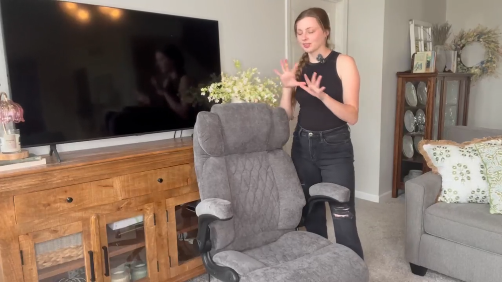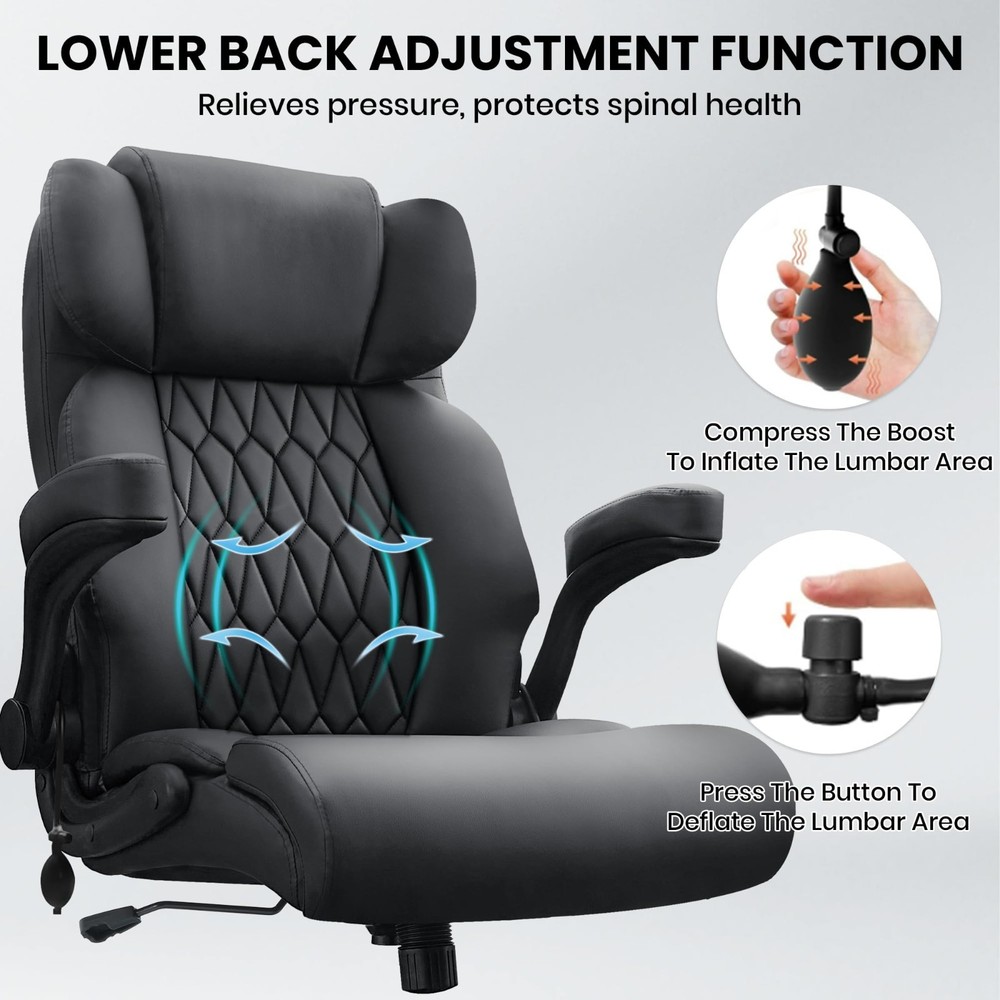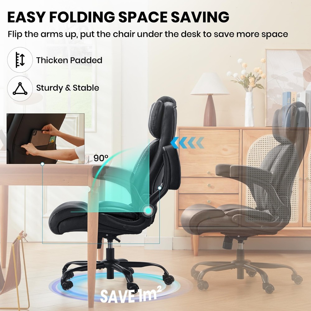 Products detail: Material: Fabric Upholstery Color: Black Capacity: 500 lbs Seat Size: 23.2"W × 22"D × 3.5" Thick Seat Height: 18.3"-21.4" Back Height: 29.5" Overall Size: 29.1"W × 29.1"D × 42.7"-45.8"H Features: Rocking 90°-122°, Flip Arms, Lumbar Pump, 360° Swivel Features: 【Strong Load Bearing】Built to hold up to 500lbs for heavy duty use 【Breathable Fabric】Durable black fabric keeps you cool while working 【Recline Comfort】Tilt function with rocking tension adjuster 【Flip Armrests】Easily slide under desk to save space 【360° Swivel Base】Move smoothly with silent caster wheels On Sep 22, 2025 at 00:13:56 PDT, seller added the following information: