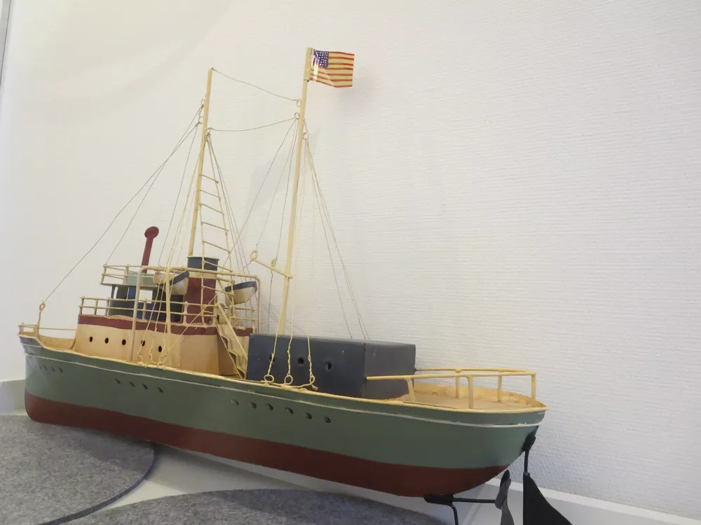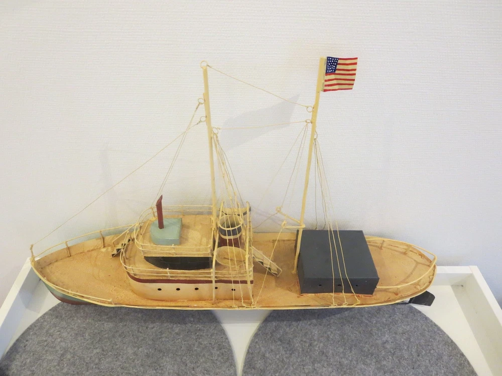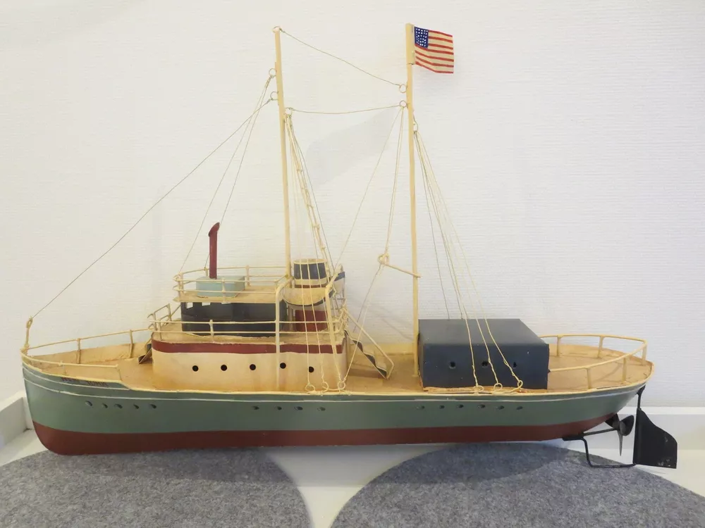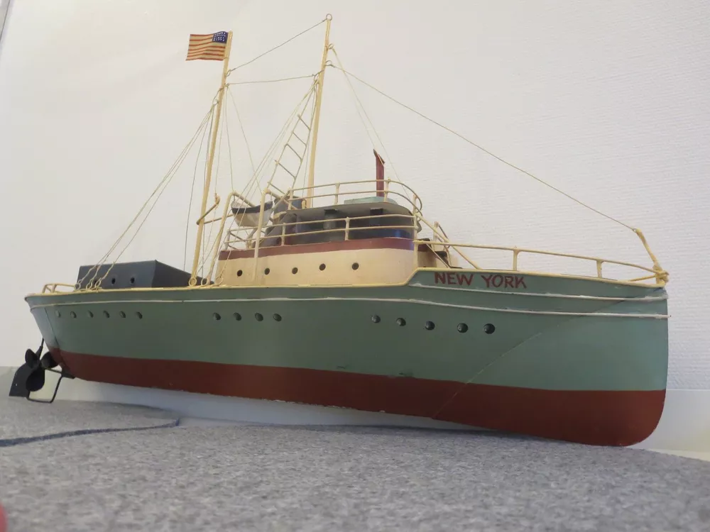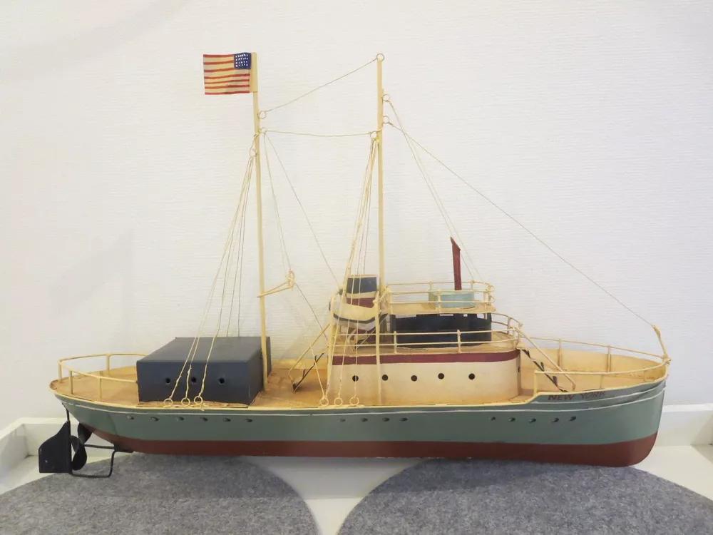 The New York was the first steam pilot boat in the New York harbor . She was built in 1897, by the Harlan and Hollingsworth company at Wilmington, Delaware for the a group of New York Sandy Hook pilots. She was designed by Archibald Cary Smith, who was a prominent naval architect and marine engineer . The New York was retired from pilot service in 1951. Great piece of history. Old beautiful craftsmanship, which appears to be in good condition. The rudder at the back moves, the propeller is stuck. It is probably meant to be like this. Many beautiful details. There is no engine in the boat. See all photos as it is a large part of the advertising.Is it from the 1930`s ? Leght 64 cm Height 42 cm w 15cm .Weight 940 gram. Added som web photo to show how it was. Customs fees are import taxes that international buyers may be required to pay in order to pick up their order from the post office, depends on your country rules.Might be good to check out as a buyer of items. It is something the buyer must pay for himself. It will not be refunded. Worldwide shipping Exclude: Afghanistan Bhutan Jemen Libya Syria Turkmenistan Russian Federation. Keywords: Rock & Spruce Marklin fleischmann bliss bing model boat metal arnold carette Falk, Plank