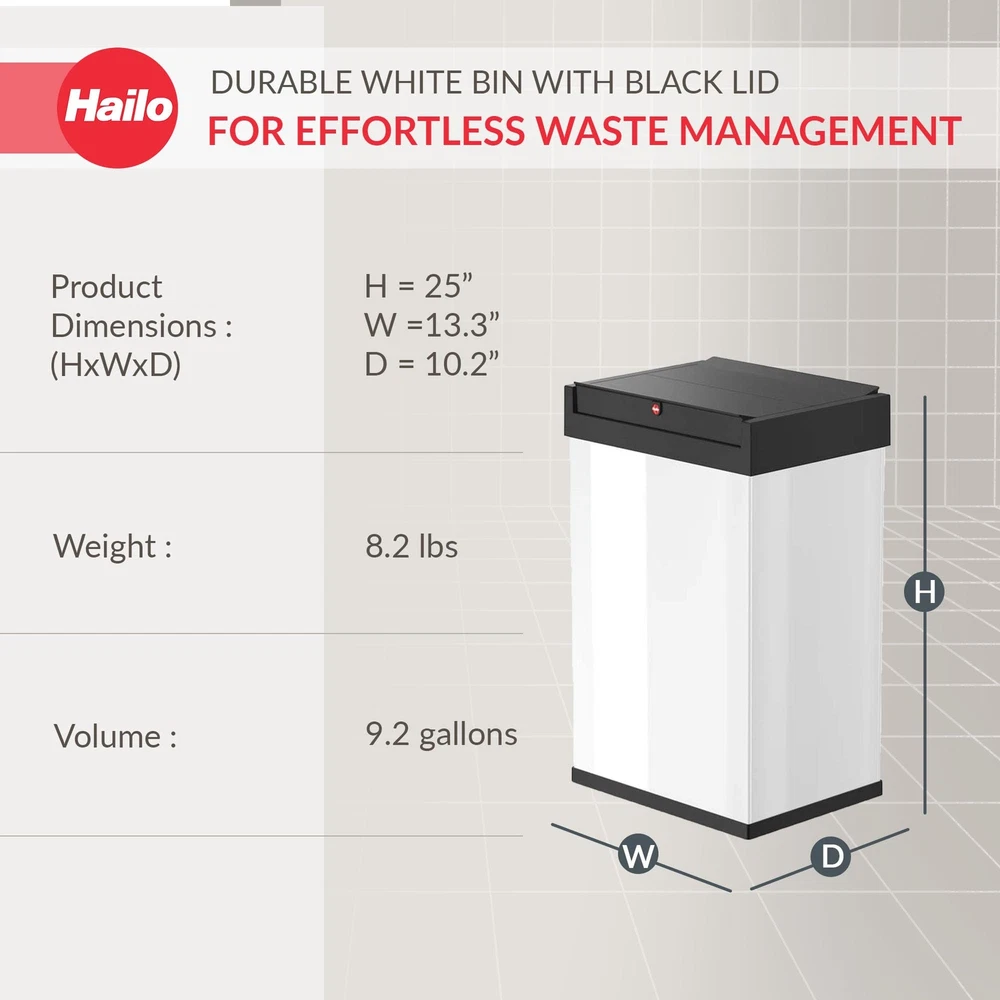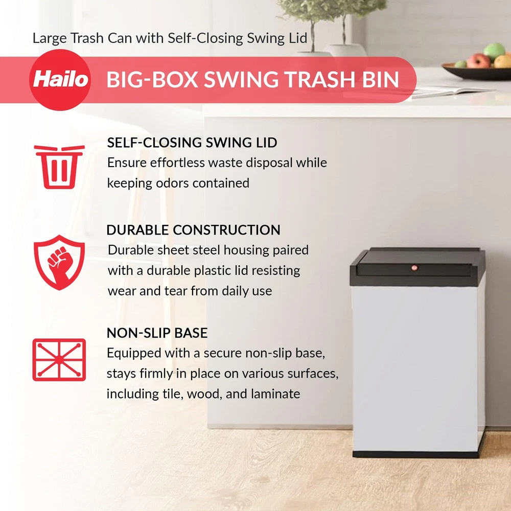 This waste bin adds a classic charm to any room. The Big-Box Swing L, made of corrosion-resistant coated steel sheet with a 35-liter capacity, self-closing swing lid, and bin liner clamping frame, not only takes care of your waste but is also a stylish eye-catcher. As diverse as the requirements in the household, kitchen or office are, so are the waste bins from . Whether large or small, white or black, made of stainless steel or another material, offers a suitable product for everyone. Innovations and clever product solutions have been 's strengths for over 70 years. With its durable waste bins and many other innovations in various product areas, has successfully established itself on the market over the years. As a leading manufacturer of ladders and waste bins in Germany, we offer our customers a wide range of innovative products that set standards. continually gives new impulses to the market with forward-looking product innovations. Today, products are sold in more than 60 countries across the world. Self-Closing Swing Lid: Big-Box Swing Trash Bin with a convenient swing lid to ensure effortless waste disposal while keeping odors contained Durable Construction: Durable sheet steel housing paired with a durable plastic lid resisting wear and tear from daily use Non-Slip Base: Equipped with a secure non-slip base, this bin stays firmly in place on various surfaces, including tile, wood, and laminate Space-Saving Design: Bin’s slim profile and compact design make it a perfect fit for small spaces such as under cabinets, beside desks, or in tight corners Ample Capacity: Ample 9.2-gallon capacity accommodates daily waste in high-traffic areas such as kitchens and bathroom