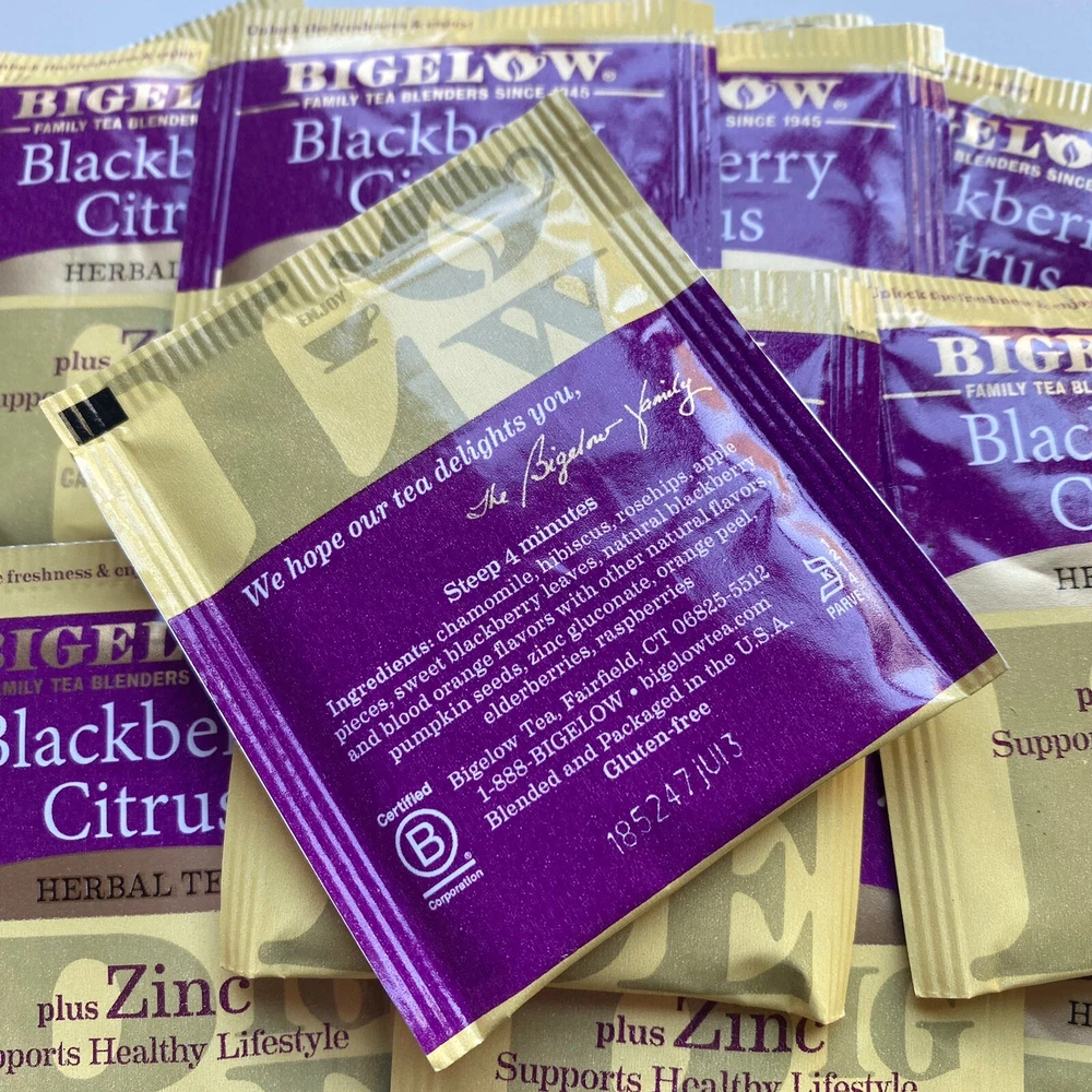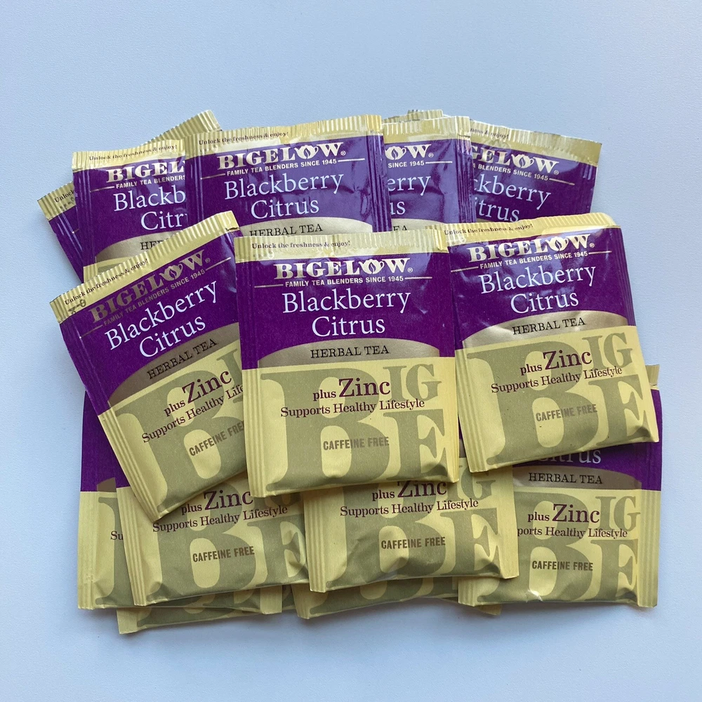 Bigelow Blackberry Citrus Plus Zinc, Caffeine-Free Herbal Tea Bags 16 Pack NEW Enjoy the refreshing taste of Bigelow's Blackberry Citrus Plus Zinc herbal tea bags. With a pack of 16 bags, each made with real citrus and berry flavors, you can savor every sip of this delicious tea. Made in the United States, these tea bags are perfect for those looking for a caffeine-free option. Ideal for any tea lover, these bags are suitable for any occasion and can be enjoyed both hot or cold. The Bigelow brand is known for its high-quality tea products, and this herbal tea is no exception. Whether you're relaxing at home or sharing with friends, this tea is sure to impress.