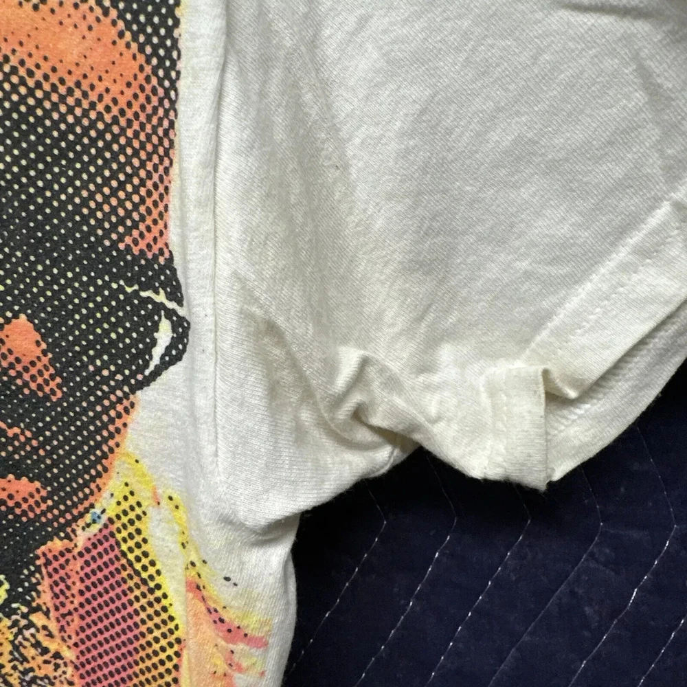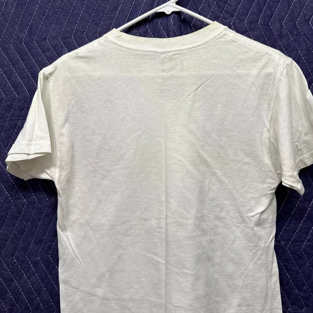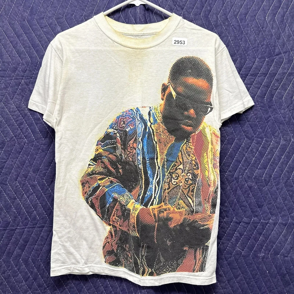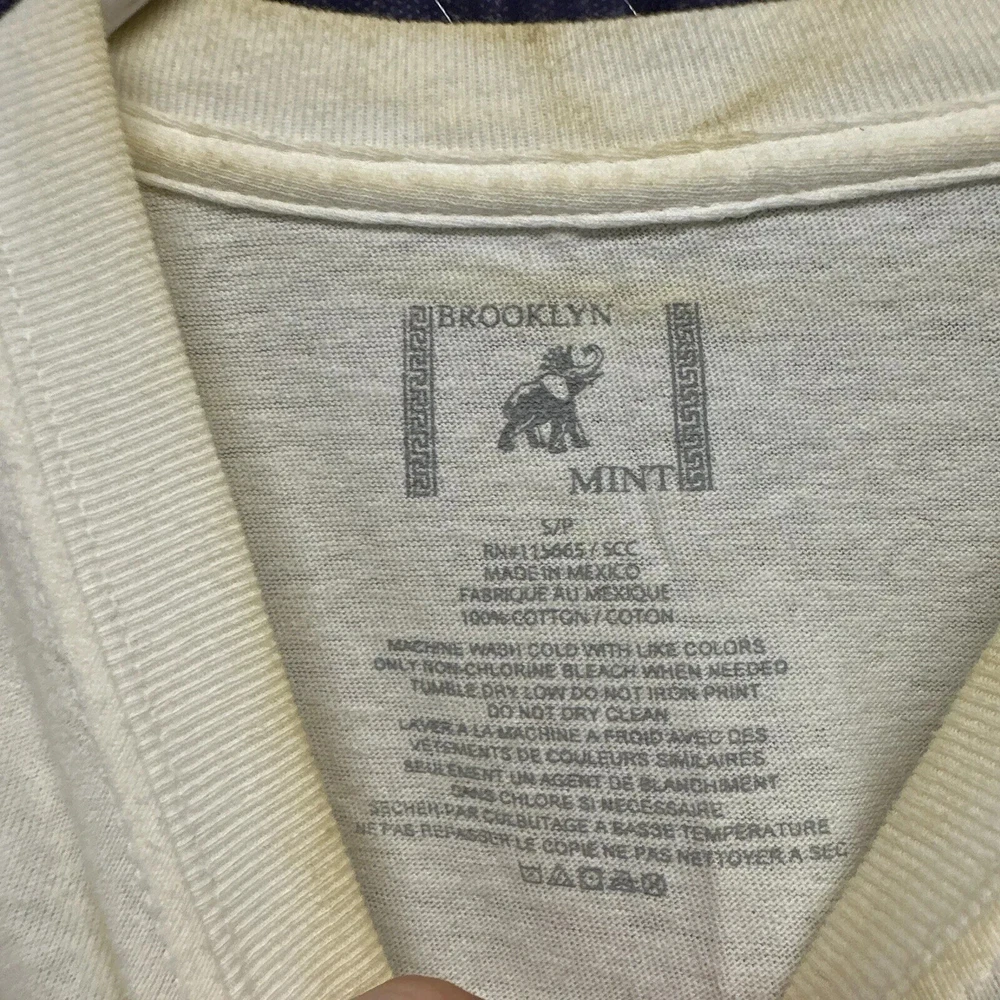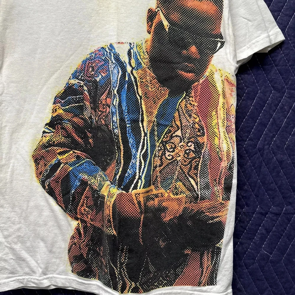 This limited edition Brooklyn Mint t-shirt is a must-have for any fan of Biggie Smalls. The white cotton blend fabric features a graphic print of the iconic rapper, with blue accents of embroidered logos and buttons. The shirt is designed with a crew neck and short sleeves, perfect for any season. This hippie and musical themed t-shirt is made with lightweight and breathable fabric, which is perfect for quick dry and all seasons. The shirt is preshrunk and stretchy, ensuring a comfortable and regular fit. It also features a full zip and hood, making it perfect for Friends and Free! lovers. Order now this classic 90s logo t-shirt, perfect for any occasion.