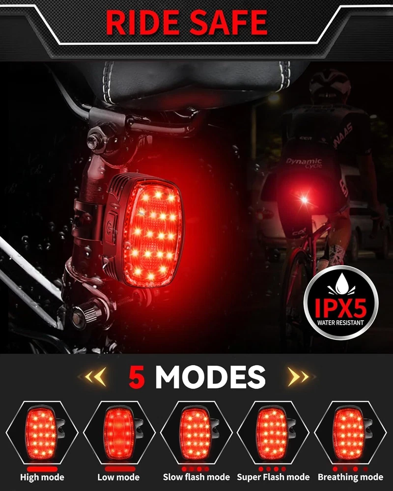 〖Super Bright Headlight and Warning Taillight〗Using upgraded 2 LED beads with high lumens, so that your cycling vision is clearer. Do not hesitate to use this 6-Mode bike headlight to enjoy wider visibility and 5-Mode taillight to ensure your safety when you are on night cycling or outdoor adventures. Good for outdoor cycling and emergency back-up! 〖6 Modes and USB-C Rechargeable Bike Light 〗Easy bicycling and hassle-free. 6 lighting modes bike light (strong light broad, low light broad, high spotlight, low spotlight, strong light full light, flash) to serving your various needs! Powered by built-in rechargeable battery with up to 4-8 hours of battery life. With 4 LEDs power indicator, you would clearly know the power status anytime to minimise the inconvenience of sudden shutdown. Easily charged by mobile power or any USB device. 〖IPX5 Waterproof and Easy Installation〗Adopt aluminium housing, super sturdy, dustproof and waterproof, ensure the bike light kit can work properly in rainy and foggy days on both city and country roads. Adopted special heat dissipation shell, quickly dissipate heat, fully protect the battery life, ensure the lights can be used for a long time! One-touch quick release installation, no tools required. 〖Multi-functional Tail Light〗It has 18 LED red tail lights with 5 levels of unique brightness (high, low, slow flash, super flash, breathing) a rechargeable Type-C connector on the back, and can work for up to 3-10 hours in normal mode. It can also be used as a backpack light, helmet light, wheelchair light, skateboard light, stroller light, or clipped to your dog's leash to alert pedestrians and vehicles. 〖WIDELY USED WITH 180 DAYS WARRANTY〗 More than just a bike light - can be used as an emergency flashlight, keep it in your car, basement, emergency kit. Use it in hiking, changing tyres, power outages and more! DARKBEAM will respond online 24/7 and take responsibility for your dissatisfaction (no reason for refund). If you have any problems with the bike light, please feel free to contact us via email: AMZ (from your Amazon order) ✔ What are you waiting for? Hurry up and place your order!!! Product Description DARKBEAM Bike Light Kit, USB Rechargeable, Super Bright Bicycle Lights, 6+5 Mode Cycling Lights, 2 LED Headlight and 18-LED Taillight Must-Have Riding Gear: Camping gear & Car must haves. Provide you with more variety of brightness solutions. Adopting fully reflective lenses (2 ultra bright LED lamp beads), with longer range, wider beam and higher brightness. Good for outdoor activities like hiking, night walking, night fishing, party and whatever you think of. Headlight - 6 Modes: Glare wide floodlight (3.5hrs), Low wide floodlight (8hrs), High spotlight (4.5hrs), Low spotlight (7hrs), Glare Full BrightTness (3.5hrs), Breathe Flash (2.5hrs) Taillight - 5 Modes: High mode (3hrs), Low mode (10hrs), Slow flash mode (6hrs), Super Flash mode (6hrs), Breathing mode (6hrs) This Bike Light Kit can be charged by any USB device such as computer, mobile power and phone charger. HOW TO CHARGE Attach the USB cable to the bike light's USB input port. Insert the other end of the cable into either an AC adapter (not included) connected to a socket or an active computer USB port. When charging, the four-level power indicator of the headlight is flashing and the tail light indicator is red. When charging is complete, the headlight is a full level indicator and the tail light indicator is always red. Widely Used More than just a bike light - Can be used as an emergency flashlight, keep it in your car, basement, emergency kit. Use it in hiking, changing tyres, power outages and more! IPX5 Waterproof Ad opt aluminium housing, super sturdy, dustproof and waterproof, ensure the bike light kit can work properly in rainy and foggy days on both city and country roads.