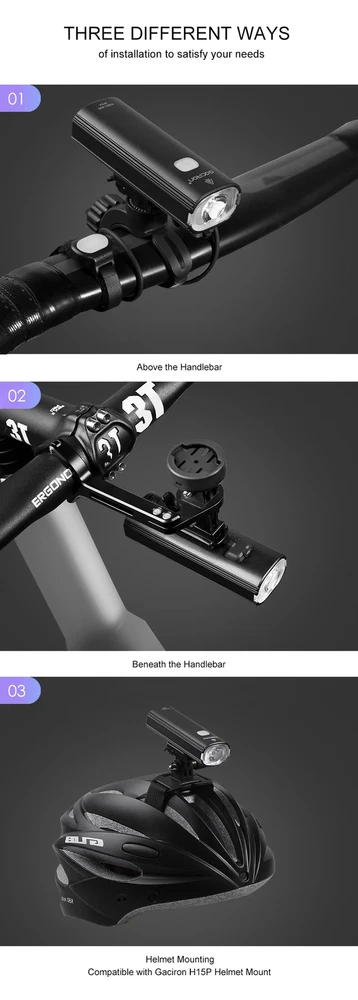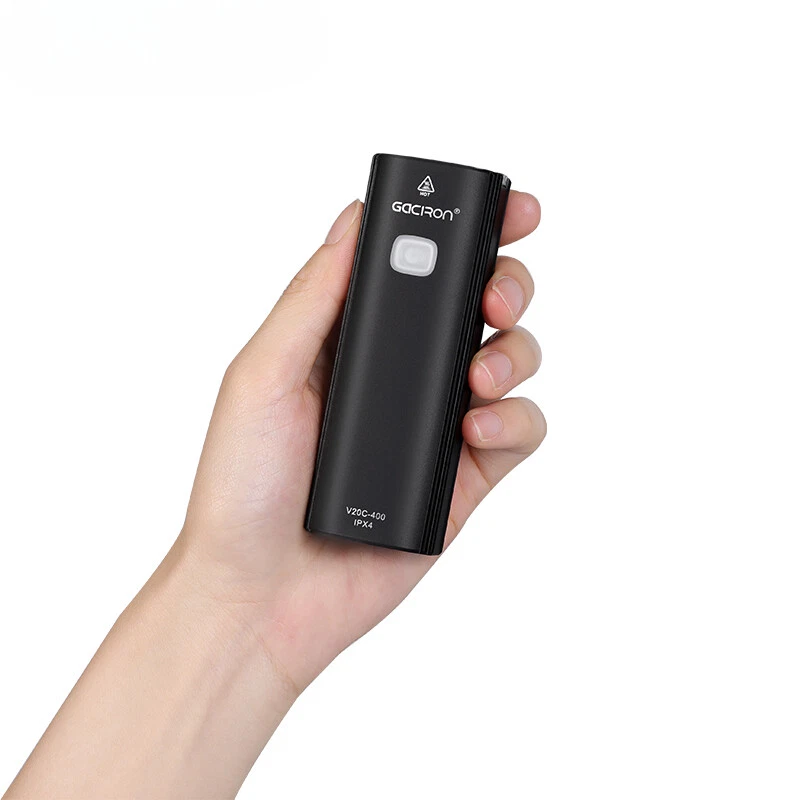 Bike Light V20C 400 Rechargeable Bicycle Front Lamp Waterproof Bike Headlight Helmet/Handlebar Light Bike accessories Specifications: Product name:V20C-400 Main LED:CREE XPG3 Max Brightness:400Lumens Floodlight Angle:118° Battery:1*18650 Lithium 2200mAh Input:Type-C 5V/1.0A Beam Distance:>200m Waterproof Level:IPX4 Net Weight:About 99g Size:99*35*32mm Material:Plastic Body Charging Time:3hrs Features: 400LM High Brightness 118°Floodlight Angle IPX4 Waterproof Compact & Light-weight USB Rechargeable Max 24hrs Working Time Symmetry Light Spot Design Support R03 Wire Remote Control Package List: 1*V20C-400 Bicycle Headlight 1*H07P Holder 1*USB Cable 1*User Manual 1*Packaging Box Notice: 1,New Upgrade!!! Floodlight Angle: upgraded from "95°" to ">118°"; Input: upgraded from "Micro 5V/0.7A" to "Type-C 5V/1.0A"; Wire Remote Control: upgraded from "R01" to "R03".(R03 wire control products need to be purchased separately.); Charging Time: upgraded from "3.5hrs" to "3hrs". 2,The net weight is only 99g, which is specially compact & light-weight, which does not burden the rider too much and increases the riding experience. 3,The waterproof function of V20C-400 needs to be used with R03 wire control to be effective.The wire control port needs to be firmly connectedto ensure no water seepage. 4,The symmetry light spot designallows the installation to be above or beneath the handlebar. 5,The V20C-400 is not only suitable for the Gaciron H07P handlebar bracket (mounted above the handlebar), but also can be paired with the Gaciron H15P helmet bracket (mounted on the helmet), the Gaciron H17 bracket (mounted beneath the handlebar), and the Gaciron H18 bike fork bracket (mounted above the front wheel). H18 H17 H15P