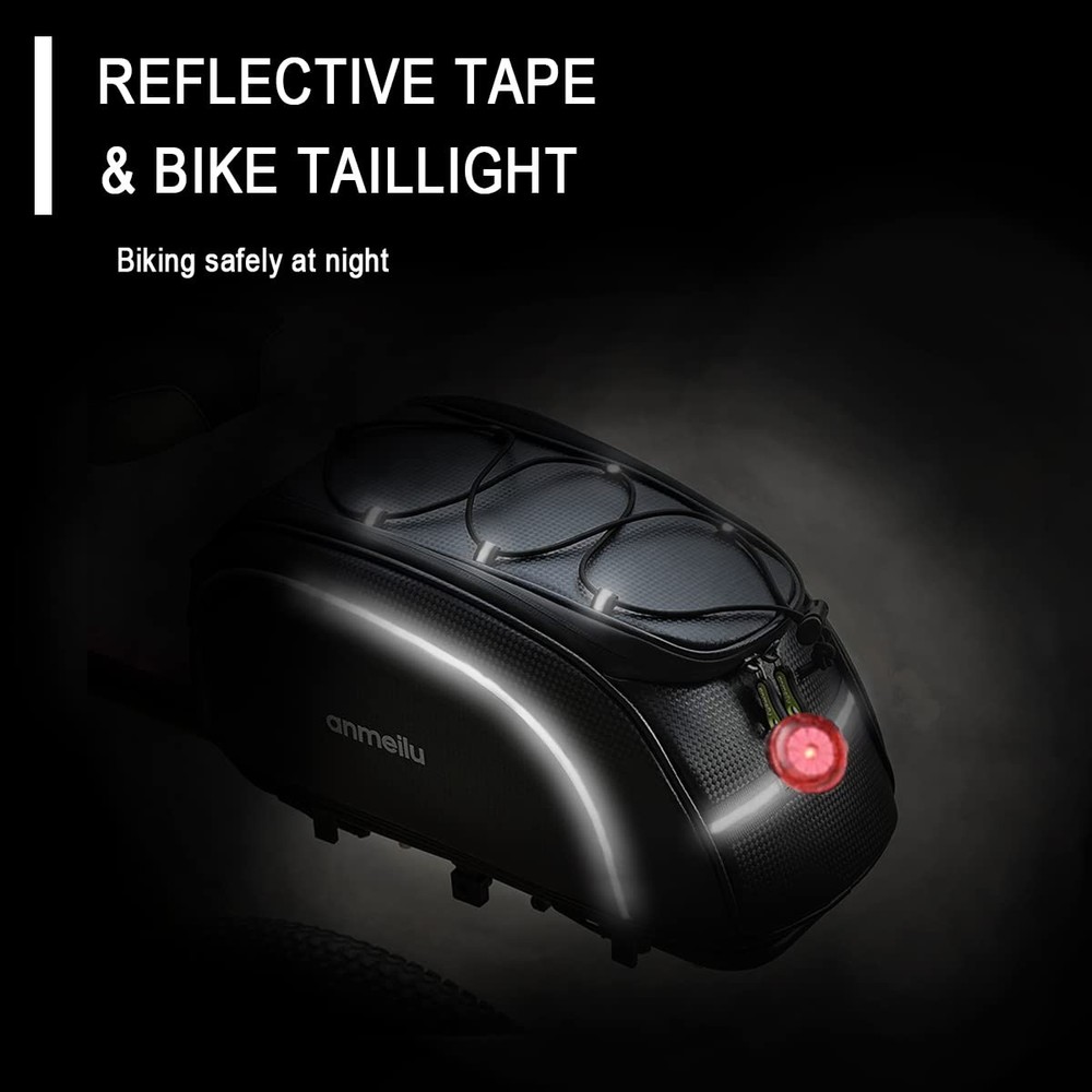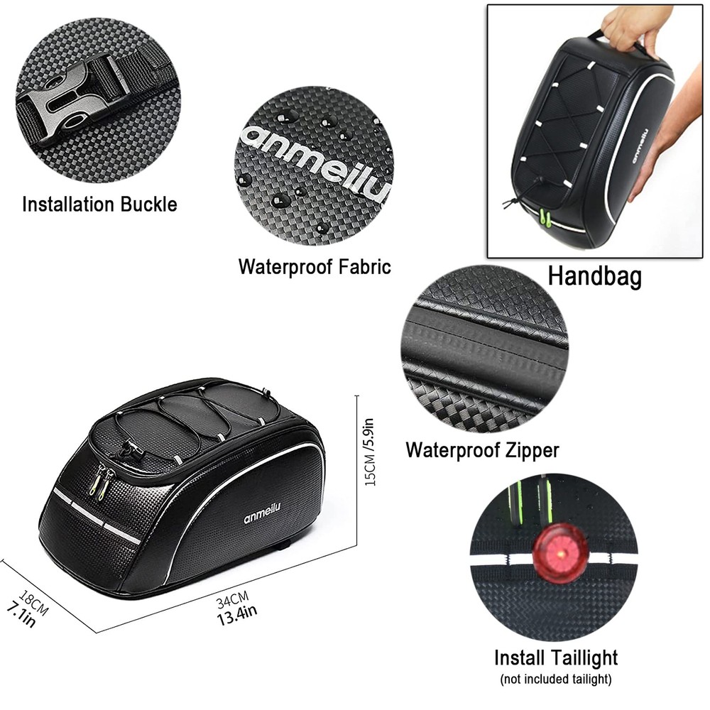【Design】bicycle bag is hard-shell anti-pressure, and there is an isolation board in the bike bags so that you can better place your daily necessities. The bike bag bicycle rear rack can be used as bike rack bag or a handbag. 【Fabric】The bike rear rack bag surface is made of 600D waterproof PU,wear-resistant, tear-resistant, durable and easy to clean. And send a rain cover. Learn more about bike luggage bag through the video. 【Reflective strips】There are reflective strips on both sides and back of the bag, which can cause warnings under the lights, so that you can ride safely at night. 【Installation instructions】 There are two explanation straps at the bottom of bike pannier bag . You can unfasten the buckle and fix it on the rear seat frame of the bicycle. The straps can be adjusted tightly to ensure a firmer installation of your bike rear seat bag. 【Capacity】The capacity of bike trunk bag :7L, which can meet your daily travel needs. You can also put water cups, umbrellas, cameras, mobile phones, and power banks in the bag.