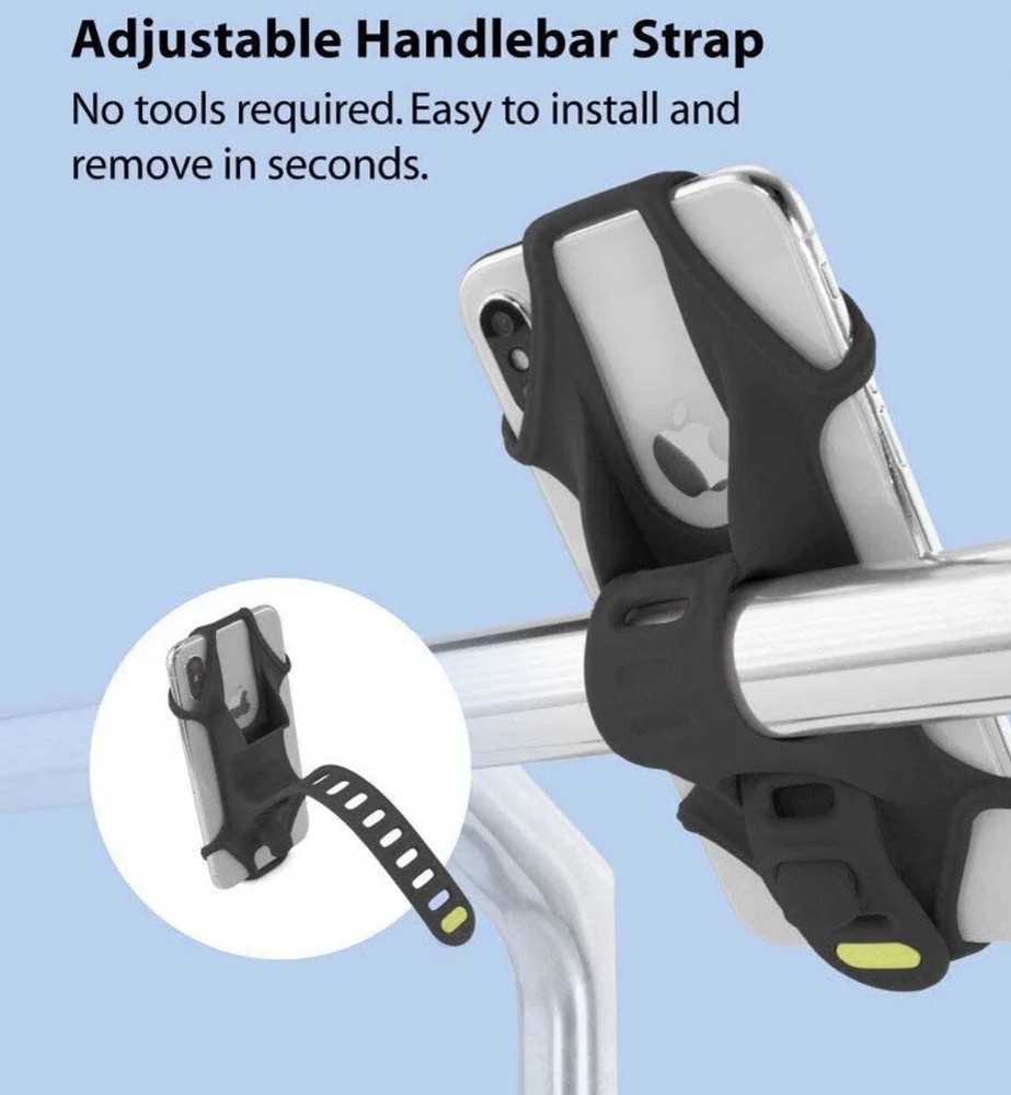 The Bike Tie 2 Cell Phone Holder from Bone Collection is a versatile and convenient accessory for any cyclist. With its universal compatibility, it can be used with a variety of different phone models and brands. The holder features a strong and secure hook and loop fastener, allowing you to easily attach it to your handlebars. This phone holder is specifically designed for use with bicycles, and it can hold your phone or other devices securely in place. Product Features: • Elastic and durable silicone band stretch and firmly holds a wide range of smartphones from 4 to 6.5 inches. • Quick mounting strap for bike stem. Install and remove in seconds! • Fits various bike handlebars, baby strollers, and many more bar areas. • Made from environmentally friendly silicone and fully washable. • Product has adjustable mounting strap for secure fastening. • Attachment still allows all use of phone such as Face ID and Touch ID