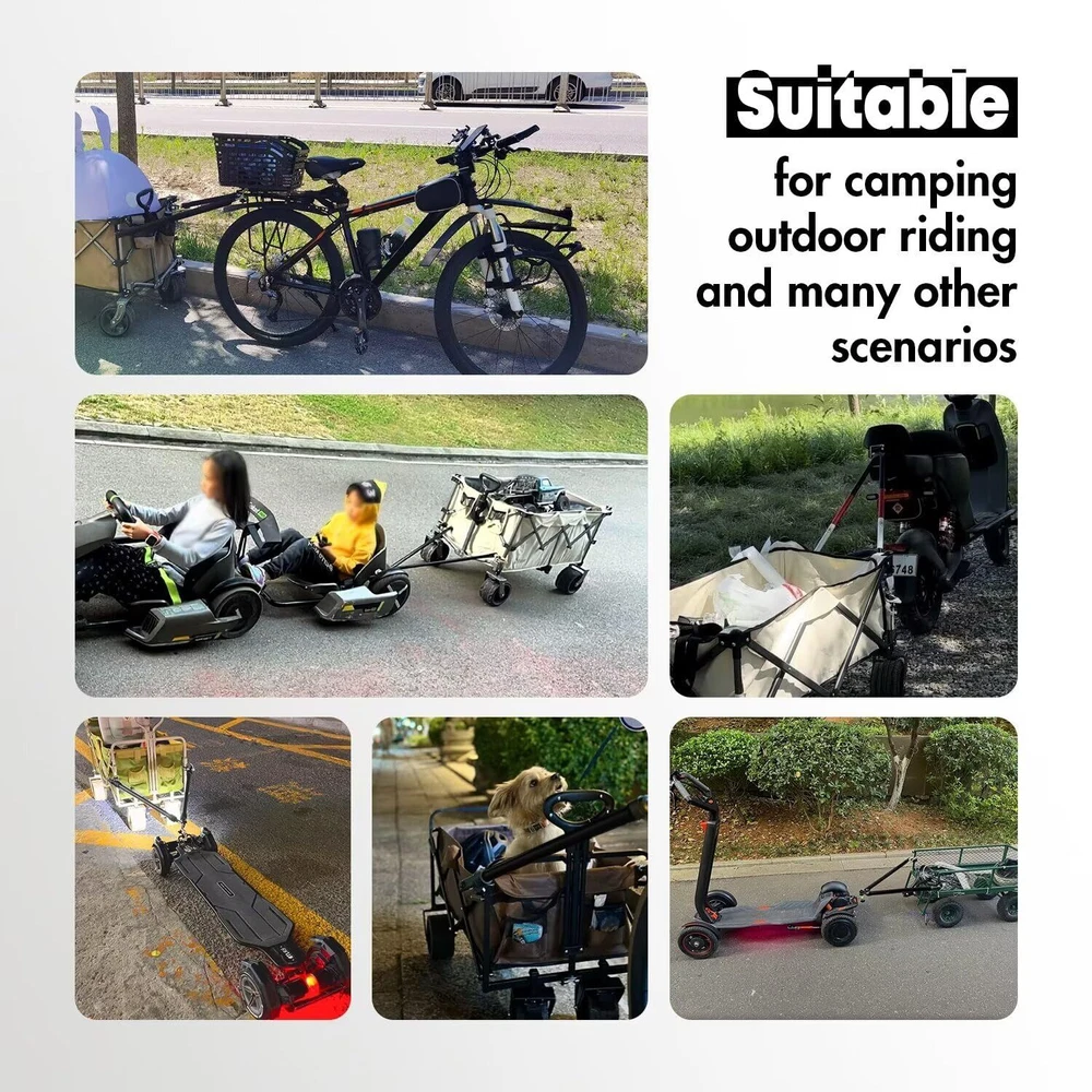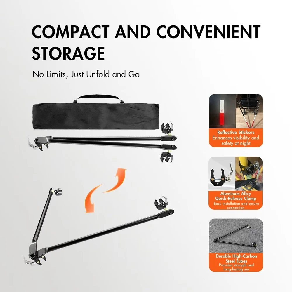 Portable and Foldable Design: This bike connector features an innovative foldable design, making it convenient to carry wherever you go. Effortlessly connect your bike or ebike and trailer for enhanced mobility during your travels.Package Contents: Trailer Connector *1, Reflective Stickers *2, Storage Bag *1. Premium Aluminum Alloy Construction: Crafted with reinforced aluminum alloy clamps and high-carbon steel tubes, our garden trailer connector ensures a robust and long-lasting connection. Experience exceptional traction and reliability, even on challenging terrain, with this ebike trailer accessory.With a payload capacity of 110 pounds, this trailer connector provides ample carrying capacity for your cargo needs. Effortless Connection and Release: With simple operation of our bike trailer clamps and couplers, you can quickly connect or disconnect your bike and cargo bike trailer, saving valuable time and energy on your outdoor adventures.Compatible with both traditional bicycles and electric bikes, it's ready for use as long as you have a rear cargo rack. Versatile Functionality: Seamlessly integrating your bike and bike trailer cargo, our connector facilitates easy transportation of cargo or shopping items, enriching your cycling experience with added versatility. Simplify your travels and diversify your adventures with this bike cargo trailer accessory. Wide Compatibility: The bike trailer hook is compatible with four-wheel, three-wheel, and two-wheel trailers, offering versatility to meet a range of needs. Note that it is not compatible with single-wheel trailers, ensuring reliable compatibility for various usage scenarios.