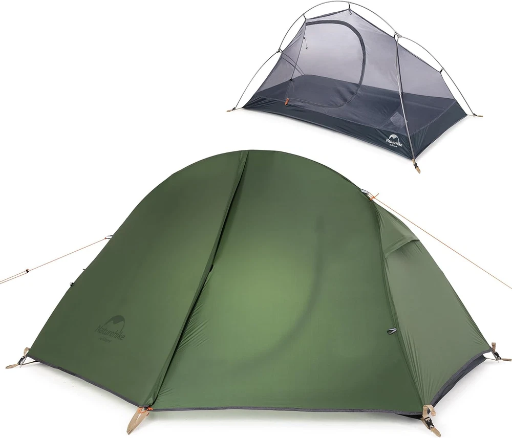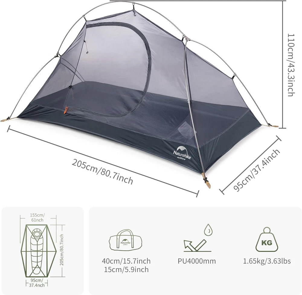 Rainfly: 20D silicone coated nylon(Waterproof PU 4000mm) 【Waterproof & Windproof】:Made of PU4000mm waterproof 20D nylon with silicone coating, and all corners and seams are taped, keeps you dry , with no leaks or drops of water inside. The 7001 aluminum alloy is tough and durable, hold up firmly in heavy wind and rainstorm. Enjoy a good night’s sleep regardless of the weather, go through hail and tons of rain and wind with the tent. 【Roomy 1 person Tent for 3 Seasons】:Tent Dimensions : 80.7 (L) x (12+37.4+12)(W) x 43.3 (H) inches. This one person tent has height of 43.3inch, plenty room for a single person to sleep and enough headroom to sit down inside comfortably. 【Easy setup Freestanding Tent】: Super easy to assemble, free-standing design with 2-Y aluminum alloy poles, it takes less than 5 minutes to set up the tent for anyone with no experience. 【Good Ventilation Double Layer Tent】:This tent is designed with two layers, which helps to create as much space and airflow between the fly and the inner tent. High desity B3 mesh inner tent and the window provide good ventilation and much air flow inside the tent. D-shaped mesh door with smooth two-way zippers provide much better ventilation and easy access to the tent. 【Ultralight Single Person Tent】:Made of lightweight 20D nylon material, this ultralight single person tent only weighs 3.63lbs. Small packed size:15.7 x 5.9 x 5.9 inch,save room for other camping gears, this solo tent is perfect for lightweight backpacking, bikepacking, motorcycle camping, hiking, cycling,fishing,etc. 【FOOTPRINT INCLUDED】:This backpacking tent comes with the footprint for the tent, you don’t need to purchase separately. Package also included: Tent x1, Rainfly x1, Aluminum Pole x1, Reinforced Pegs x8, Reflective Wind Ropes x2, Carry Bag x1. Product Description Package Includes: Tent x1 Rainfly ×1 Aluminum Pole ×1 Reinforced Pegs ×8 Reflective Wind Ropes ×2 Carry Bag(Two kinds of bags will be sent randomly.)×1 Footprint ×1 Naturehike Ultralight 1 Person Tent - Designed for Backpacking Super Easy to Set Up! Our compact tent will fit into your backpack without filling it up. Offers more inside room than almost any other ultralight tent. More durable -- You can see from the reinforced strength and stitching of our tent Naturehike 1 person tent is great for camping, hiking, cycling, backpacking, festivals outdoors or a weekend bikepacking trip with family and friends. Capacity: 1 Person Packed Size: 15.7" × φ5.9" (40 × φ15cm) Water-resistant: PU4000mm UV Resistance: UPF 30+ ✔ The manual is sewn inside the carry bag. Material for 20D Green Rainfly : 20D nylon, silicone coated(PU 4000mm) Inner Tent : 210T rip-stop polyester+B3 breathable mesh(PU 3000mm) Floor : 150D rip-stop oxford(PU 3000mm) Packed Weight : 3.63 lbs (1.65kg) Why Naturehike? Waterproof & UV Resistance -- UPF 30+ Using professionally tested high quality waterproof fabric, no need to worry about water seepage during rainy days, keep the inside of the tent dry and comfortable. Spacious for 1 Person Width is 37.4"(95cm), the vestibule of 11.8"(30cm) on each side provides you enough space for placement. Wide enough for one person. Carry Bag -- More Portable Our backpacking tent can be stored in the 15.7” x φ5.9” (40 x φ15cm) carry bag, more convenient and beautiful. More Details Adjustable high-level vents Rainfly and inner tent curtains gathering unit Smooth & 2-way zippers Reflective wind ropes buckle Mesh pocket for collection Aluminum pole tee structure Hanging buckle Feet lock function Tent light hook