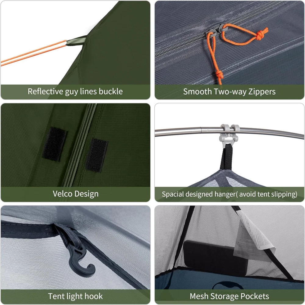 Tent Design: Camping Tent Form Factor: Dome Number of Guylines: 1 Number Of Poles: 2 Color: 20D Forest Green Product Dimensions: 80.7"L x 61"W x 43.3"H Material Type: Nylon Number of Doors: 1 Assembly Time: 5 minutes Tent Floor Material: 210T ripstop fabric Item Shape: dome tent Recommended Uses For Product: Backpacking, Trekking, Camping & Hiking, Mountaineering, Fishing Brand: Does not apply Is Waterproof: True Stake Material: Aluminum Occupancy: 1 Person Required Assembly: Yes gtin13: 7445003055016 Seasons: 3 Season Number of Vestibules: 1 Special Features: Portable, Ultralight, Waterproof, Lightweight, UVProtection, Rain Installation Type: Easy Setup Occupant Capacity: 1 Base: Nylon Product Care Instructions: Hand Wash Size: 1 person Floor Length: 80.7 Inches Support Pole Attachment Mechanism: Clip Type: Does not apply Floor Width: 12 Inches Pole Material Type: Aluminum Closure Type: Zipper Age Range Description: Adult Included Components: Carry Bag, Peg, Rope Maximum Height: 43.3 Inches Style Name: Three-season Item Dimensions L x W x H: 80.7"L x 61"W x 43.3"H Ultraviolet Light Protection: UPF 30+ UPC: 7445003055016 Water Resistance Level: Waterproof Item Weight: 3.63 Pounds Shape: dome tent Fabric Type: Rainfly: 20D silicone coated nylon(Waterproof PU 4000mm), Inner T Sport Type: Camping & Hiking Number of Stakes: 8 Water Resistance Technology: 4000 Mm