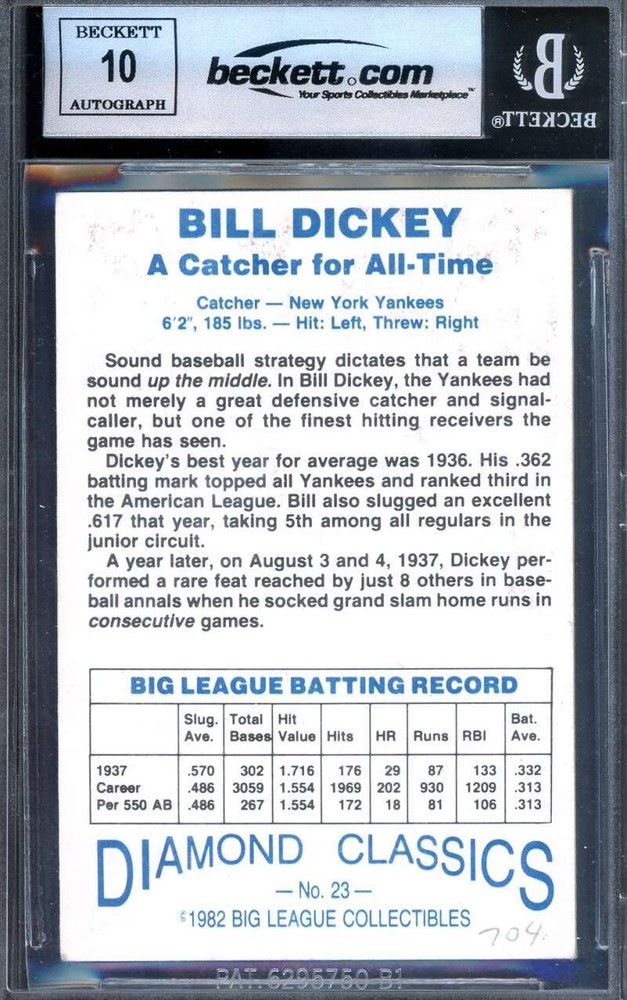 Bill Dickey Gem Mint 10 Beckett BAS Signed 1982-83 Diamond Classics Autograph PHOTO: DESCRIPTION: FULLY CERTED BECKETT SLABBED AUTHENTIC SIGNED SPORTSCARD FROM THE INTERNETS #1 SELLER OF AUTHENTIC SIGNATURES SHIPPING & PAYMENT: thanks for looking. All items are mailed within 24 hrs of payment , most within a few hours.We combine shipping so if you have more than one item request total when done.We combine shipping at about .50 extra a piece to point then free.Feel free to ask . International shipping rates have gone up this year, we will ship at the cost we pay.Most will be between 6-12.00 for like slabbed cards to a baseball. Feel free to email any questions about items or to talk collectibles, thanks always!!!! This listing created with GLETech Multiple Selling Channel tools.
