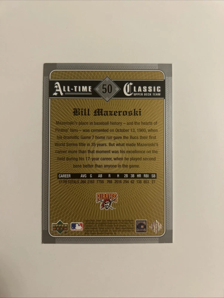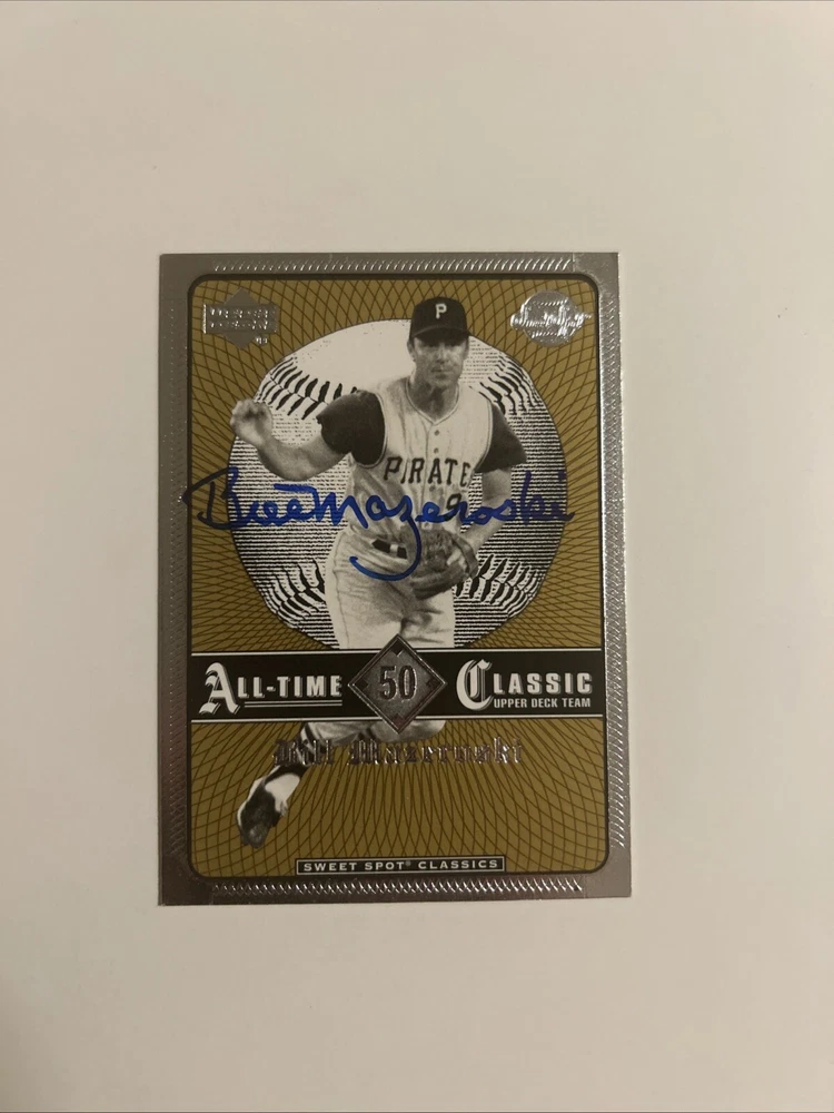 This trading card features Bill Mazeroski, a legendary baseball player for the Pittsburgh Pirates. The card is autographed and signed by Mazeroski himself, making it a valuable addition to any fan's collection. The card is in excellent condition and is a must-have for any baseball enthusiast.