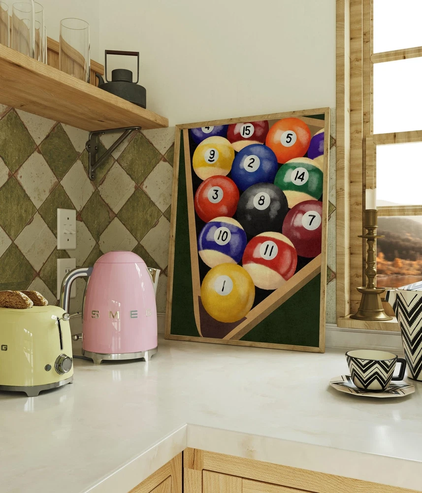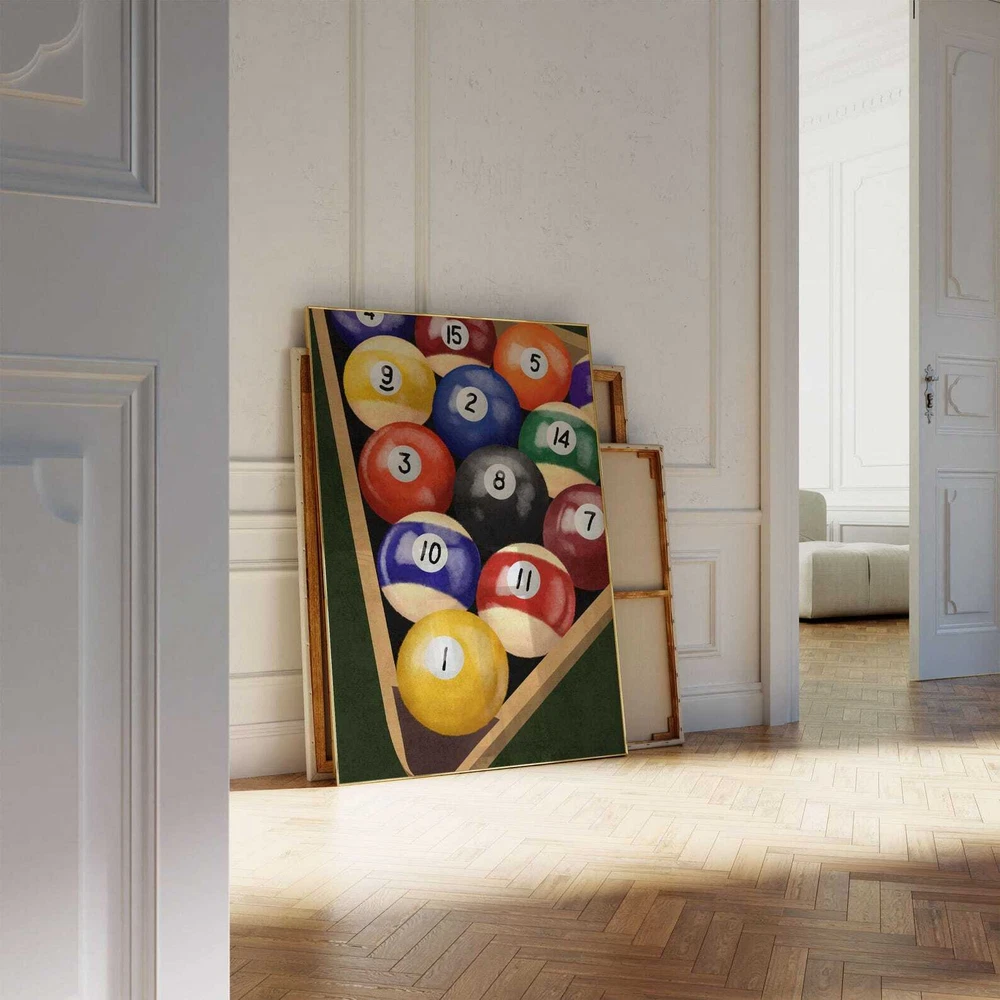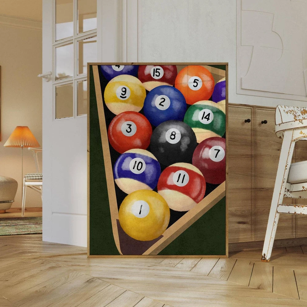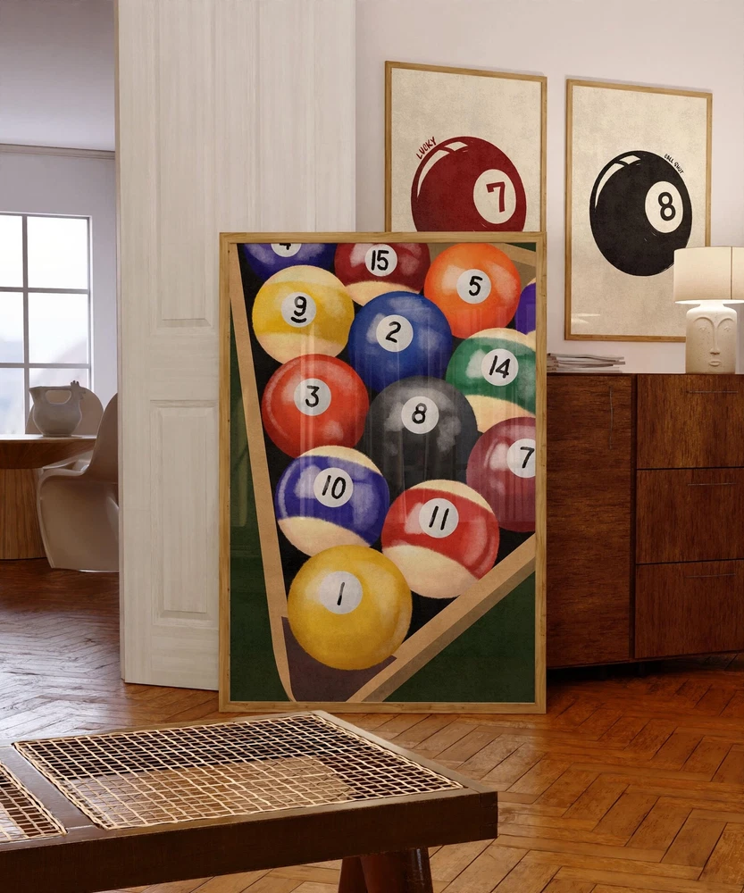Billiard Balls Wall Art Vintage Pool Table Decor 8 Ball Room Print Game Room Poster Pool Ball Set Artwork Material: Premium luster photo paper Print type: Inkjet printing One side printed + The finish provides the highest possible resolution and color saturation + Lasts up to 200 years in color and 400 years in black-and-white + Printed on high-quality resin-coated photo base paper medium + Posters can be hung with double-sided tape, tacks, or framed + Hand washing with a gentle cry cloth is recommended for extended durability I will hand select the best choice of paper for your chosen design to ensure top quality results for a beautiful, bright and luxurious print. All prints are sealed in cellophane slips for protection during transportation, and are shipped in a protective cardboard envelope.