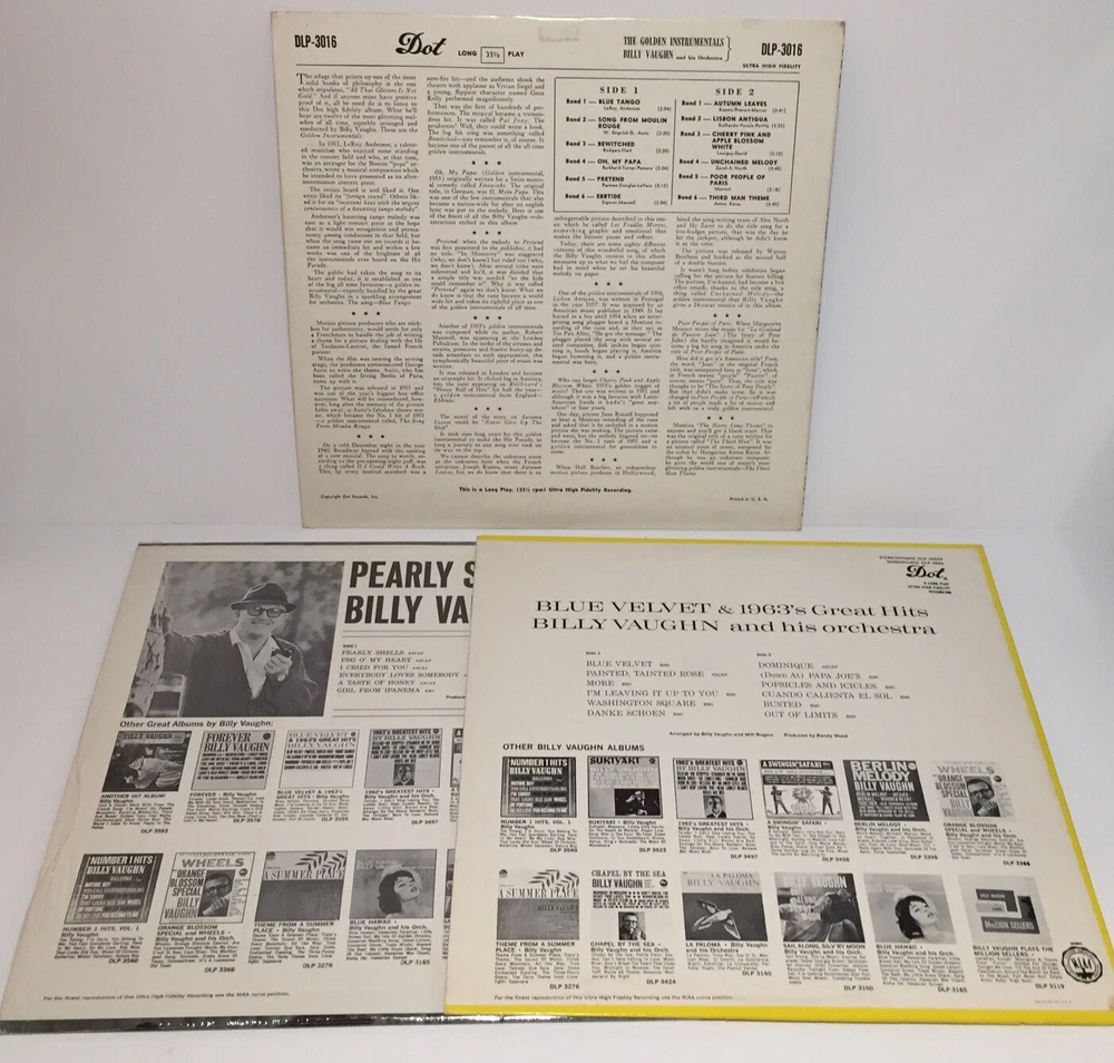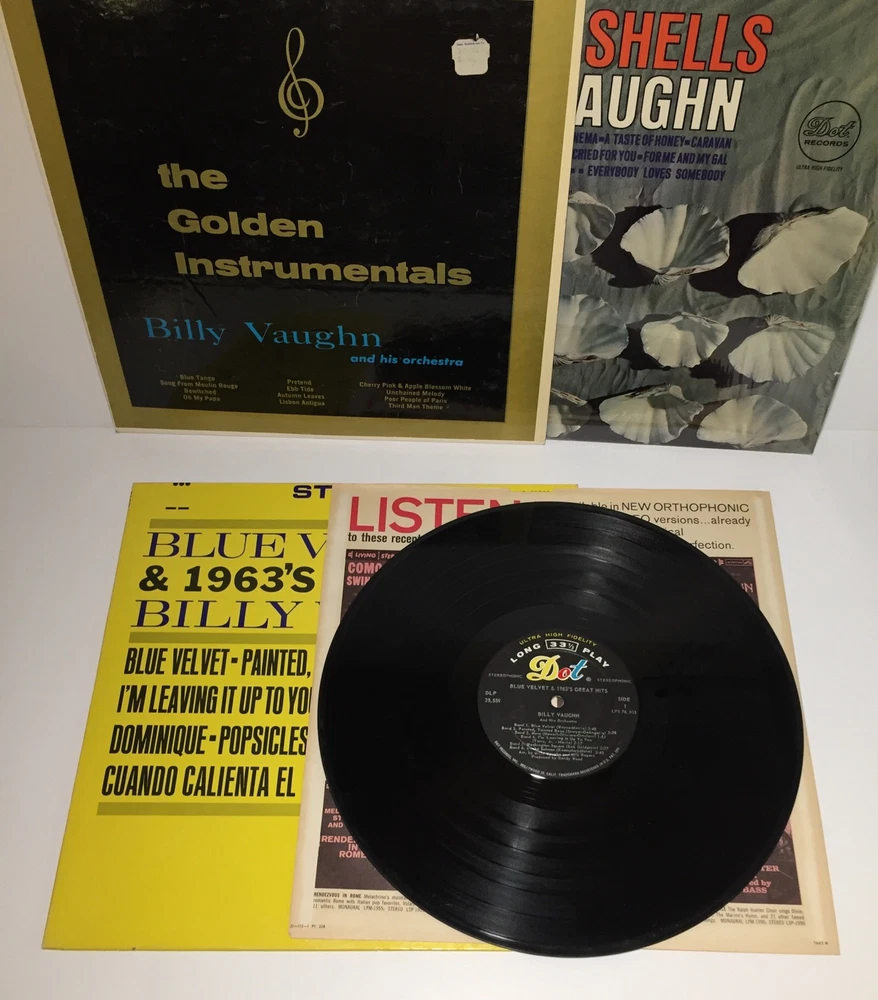Billy Vaughn The Golden Instruments Blue Velvet Pearly Shells Vinyl LP Lot Of 3. The records are in acceptable condition. They do have some scratches. Please feel free to ask any questions. The lot will ship out safely and securely the same or next business day.
