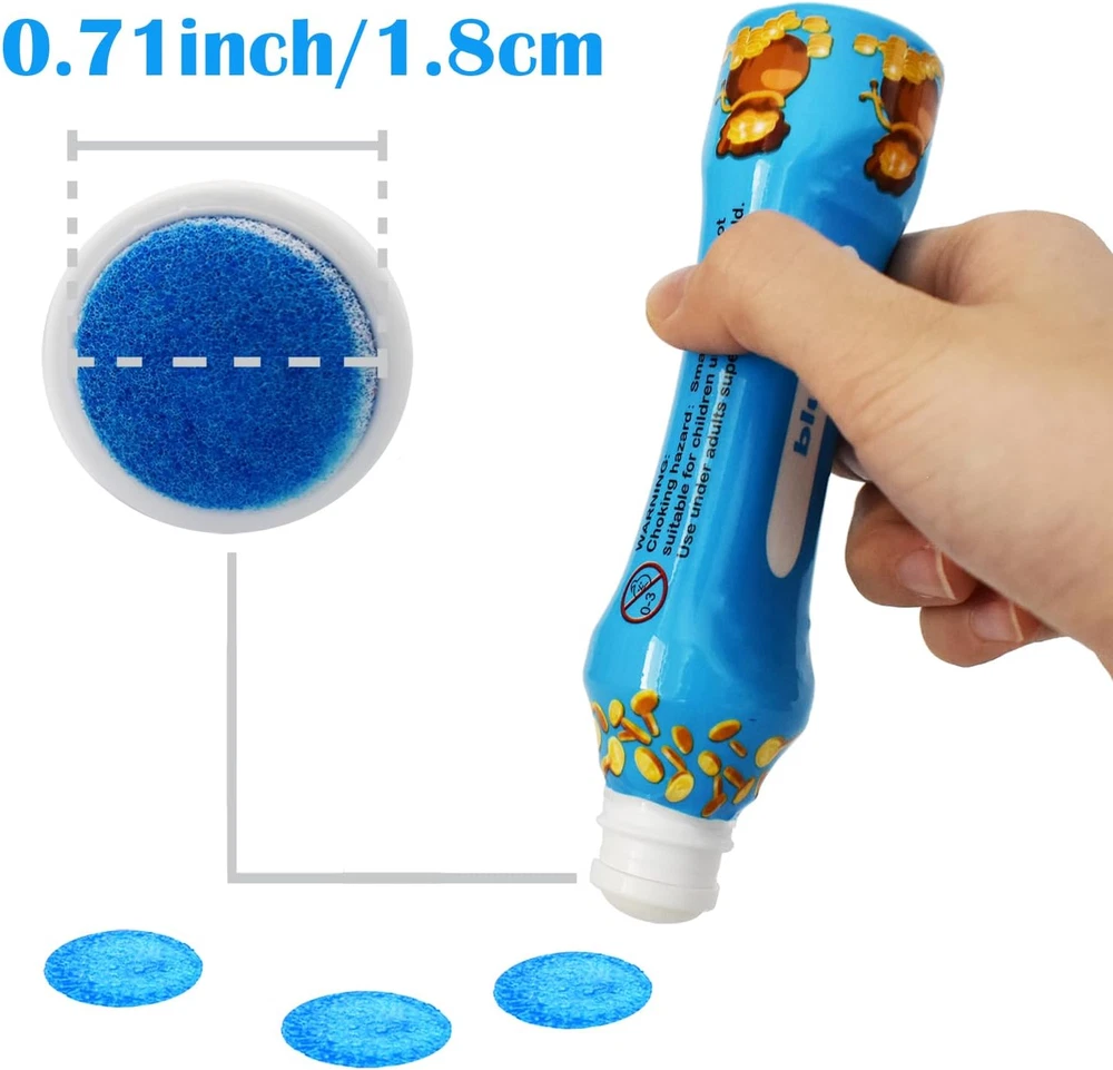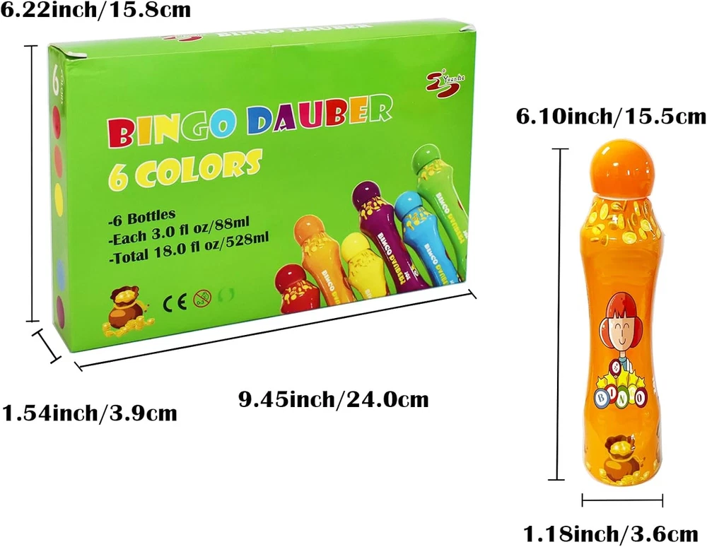 MULTI COLORS:Set of 6 mixed color bingo daubers,filled with premium quality ink that dries in seconds! No mess, no splatter. PREMIUM QUALITY:The leakage-proof dot markers for kids keeps the color fresh for a long time and the large sponge tip will not dry out. SAFE AND EASY TO USE: 3oz/88ml large capacity. Made of non-toxic ink,which are completely safe for children. And kids can easily unscrew the caps. BEST GIFT: Perfect for bingo games! The ink dries quickly so you don't have to worry about smearing your card, you can enjoy the bingo game with your family. FUN AND LEANING: Teachers and Parents can have fun with kids for dot paint projects, Dabbing, Bingo daubing. Product Description Durable Large Sponge Tip The leakage-proof dot markers for kids keeps the color fresh for a long time and the large sponge tip will not dry out. No mess, no splatter! Description: Looking for a fun way to introduce your little kids to coloring? Worrying about the ink smears your hand in the bingo game. Our dot markers are the perfect choice! The bingo daubers are made of non-toxic ink,which are completely safe for children. And kids can easily unscrew the caps. The ink dries quickly,no mess, no splatter.you can enjoy the bingo game with your family. 12 fun colors to choose from, creating colorful designs is a breeze! Packing: color box Meterial: non-toxic ink Colors:red/orange/yellow/apple green/blue/purple Applicable age: 3 years and up Package Included : 6x Bingo daubers Math Skills People can paly the math game by the dot markers and help children to learn numbers. Perfect for the Bingo Game The ink dries quickly so you don't have to worry about smearing your card, you can enjoy the bingo game with your families. Paint the Funny Cartoon Teachers and Parents can have fun with kids for dot paint projects to nurture hand-eye coordination and improve children’s creation.