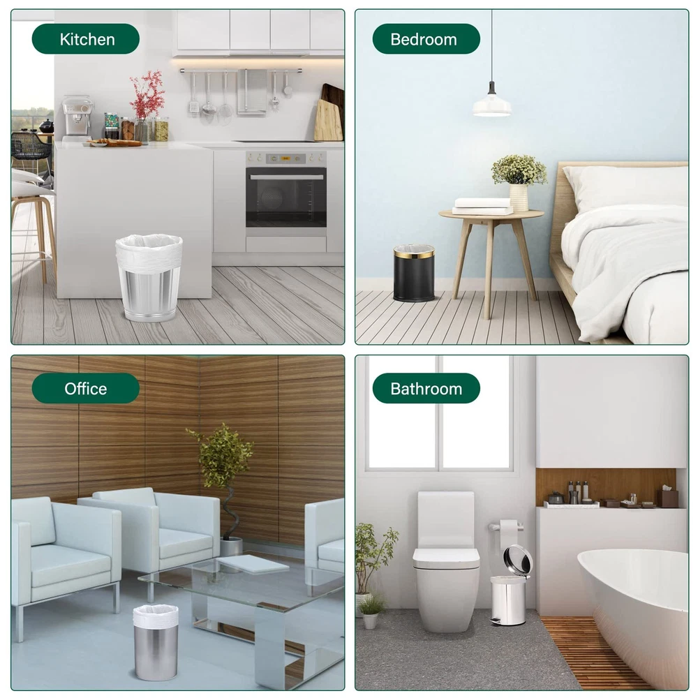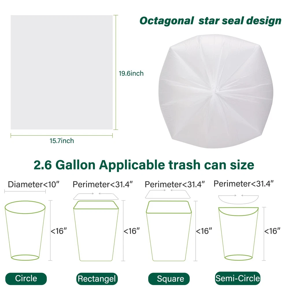 【Biodegradable & Translucent & Scented Free】Our biodegradable trash bags are made of EPI-certified eco-friendly materials, it's effective to reduce white pollution, also the small trash bags are translucent design, which could help you easily view and separate recyclable from non-recyclable rubbish. And the scented-free making is for our families, so we could be more when we are paying effort for protecting our environment through using these small garbage bags. 【Thickening & Leaking Proof & Bearing Capacity Upgrading】According to a survey, the biodegradable trash bags in the market adopt thin material which causes them easy to break. So we thicken our 2.6-gallon trash bag and designed the bottom with octagonal, which upgraded leaking proof & bearing capacity, you will find that our small garbage bags come with excellent resistance to tearing, leak-proof, prevent odor, and extra durable, but avoiding sharp stuff. 【Humanized Breakpoint Design Upgrade & Easy to 】Upgrading break-point design makes our 2.6 gallon trash bag is easier and perfect tear apart from the roll than other kitchen trash bags in the market. Also, our clear garbage bags come with a premium package, it is perfect for organizing and keeping your home tidy. 【Perfect Size & Suitable for Most Trash Cans & Multi-Purpose】: The size of our small garbage bags is 15.7 inches * 19.6 inches. Fit most small-size trash bins, so our small trash bags are not only for office, kitchen, living room, bedroom, bathroom, garage, cars, and baby diapers but also perfect for storing blankets and clothes. As an environment protector at home or on the go. 【100% Unique Brand Customer Satisfaction Service】Our aim is to not only offer premium clear trash bags, but also every satisfying purchase. If there is any problem or unsatisfied with our 2.6 gallon trash bag, please feel free to send us your issues, and we will solve your trouble within 24 hours. Just choose our mini trash bags without any hesitation.