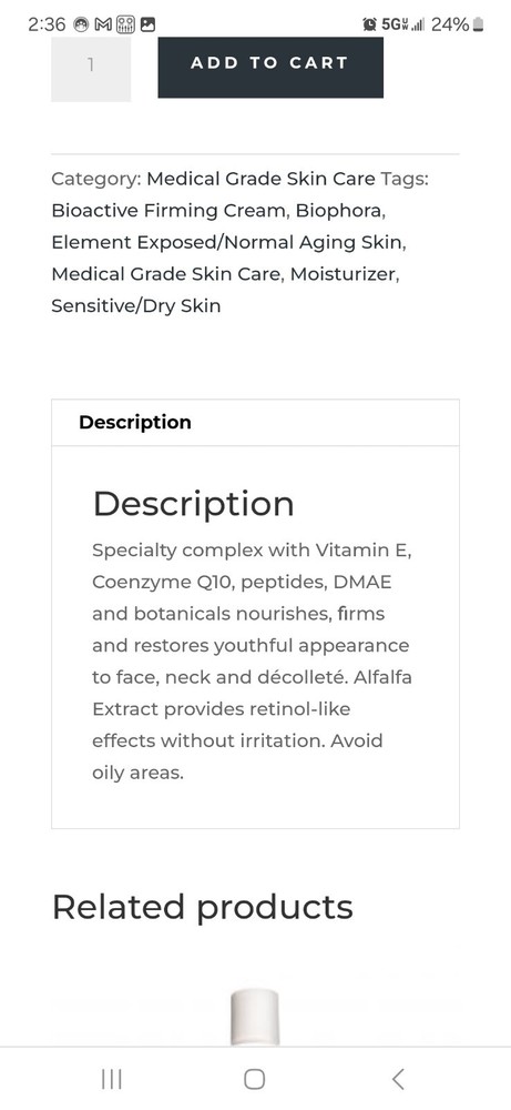 Biophora Bioactive Firming Cream. Specialty complex with Vitamin E, Coenzyme Q10, peptides, DMAE and botanicals nourishes, firms and restores youthful appearance to face, neck and décolleté. Alfalfa Extract provides retinol-like effects without irritation. Avoid oily areas.