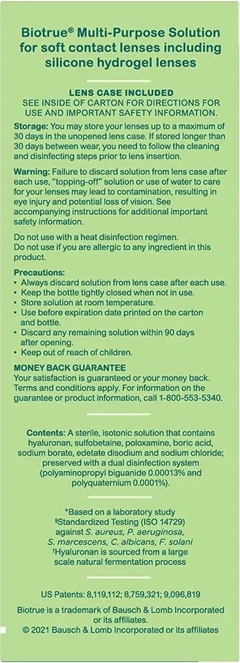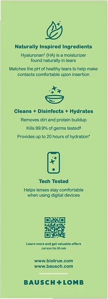 EYE DOCTOR RECOMMENDED: Biotrue is recommended by eye care professionals. It helps contacts stay moist and comfortable all day long. CLEANS & DISINFECTS: Biotrue contact lens solution provides exceptional cleaning and disinfection. It removes dirt and protein buildup for clean, clear lenses. HYDRATES: Biotrue provides up to 20 hours of moisture (based on a laboratory study). Biotrue offers all day comfort. Biotrue is gentle and helps lenses stay comfortable when using digital devices. NATURALLY INSPIRED FEATURES: Inspired by the biology of the eye, Biotrue contact lens solution contains hyaluronan (HA), a moisturizer found naturally in tears; and matches the pH of healthy tears to help make contacts comfortable when you put them in. MULTI-PURPOSE SOLUTION: Biotrue contact lens solution can be used to store, clean, and disinfect contacts in a lens case when not being worn, or to rinse contacts before wear. For soft contact lenses including silicone hydrogel lenses. BIO.0050.USA.23