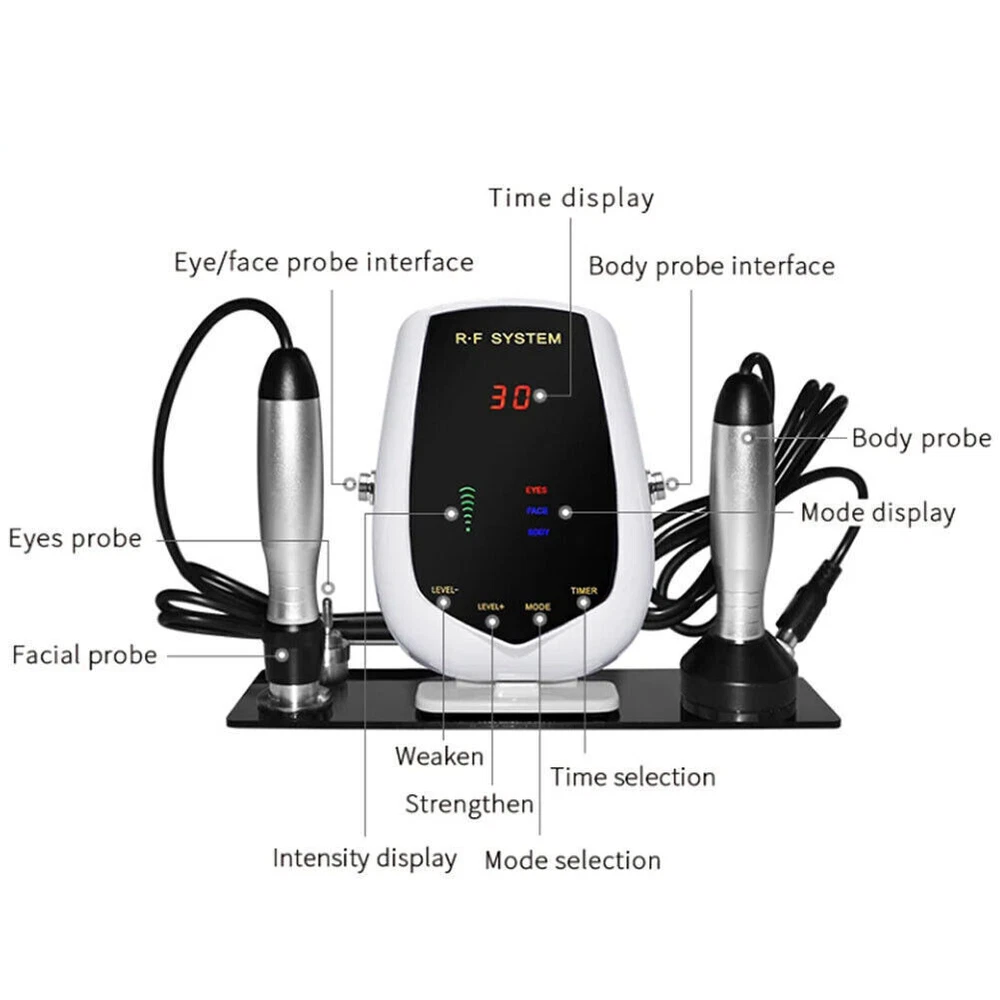 What is RF (Radio Frequency)? Technically speaking, radiofrequency is a kind of electromagnetic spectrum. It is a high frequency and alternating electromagnetic wave. When RF acts on the skin, it will make the collagen of dermal fibers heated to 45 °C -65 °C. Then the collagen fiber will shrink in a short time which can tighten the flabby skin and stimulate the collagen to grow. By this, RF energy will prompt the dermis layer to be firm and elastic. That is, to tighten the skin and remove the wrinkle. Product Function 1. Smooth wrinkles 2. Lift Eye contour 3. Compact pores; 4. Go swelling; 5. V-shaped face; 6. Subtractive double chin; 7. Go eye bags and dark circles; 8. Rosy face color 9. Heal the bitter wrinkles/expression wrinkles 10.Clear face contour; 11. Smooth forehead wrinkles Packing List Machine Unit * 1pc Body RF wand *1pc Face RF wand *1pc Face RF Tip *1pc Eye RF Tip *1pc Power Adaptor *1pc User Manual *1pc Box *1pc Product Picture People Who Bought This Item Also Bought Multifunction Led Rf Needle Injector Meso Gun Meso Injector Mesotherapy Gun NEW 501.59 USD 9.99 USD
