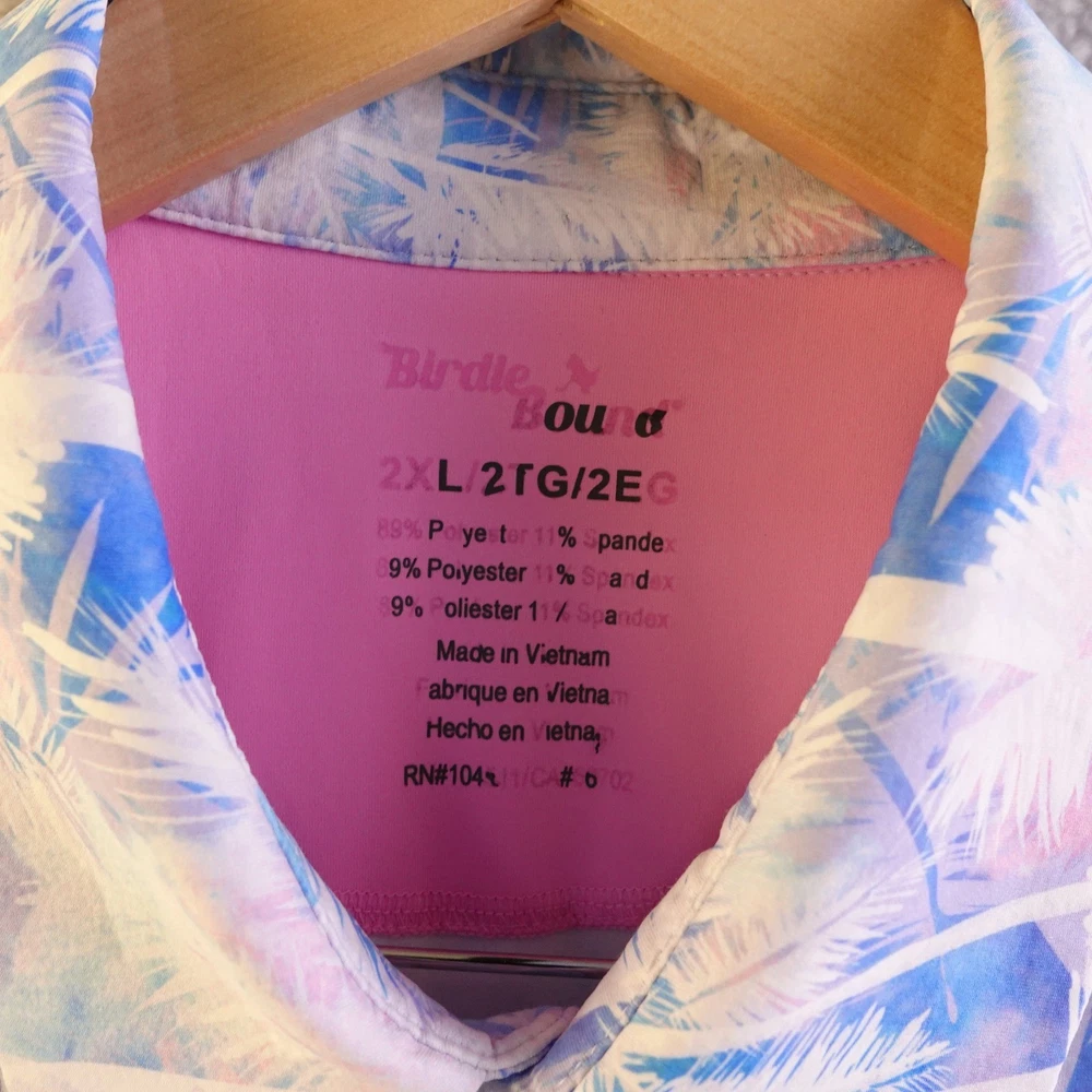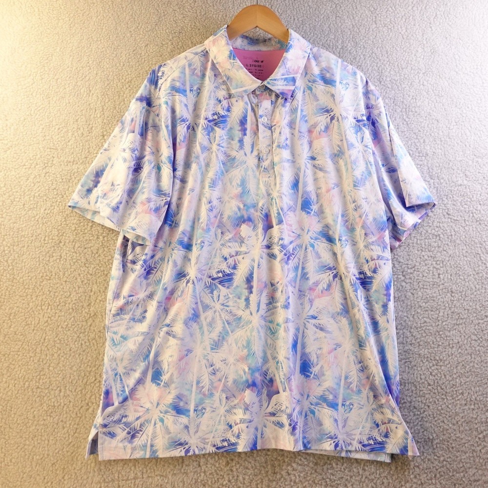 Capture a vacation vibe with this vibrant Birdie & Bound polo shirt. The eye-catching tropical palm tree print in shades of blue, pink, and purple evokes sunny days and warm breezes. Designed for comfort and style, this polo is perfect for a round of golf, a casual outing, or simply enjoying a relaxed day. Type: Polo Department: Men Pattern: Graphic Print Style: Basic Sleeve Length: Short Sleeve Material: Polyester Blend, Spandex Fit: Regular Neckline: Collared Features: Breathable, Stretch Season: Summer Performance/Activity: Golf Occasion: Activewear, Casual Sleeve Type: Casual Sleeve Country of Origin: Vietnam Keywords: Birdie & Bound, golf shirt, polo, tropical, palm tree, print shirt, men's activewear, vacation shirt, summer, breathable, athletic fit, casual wear