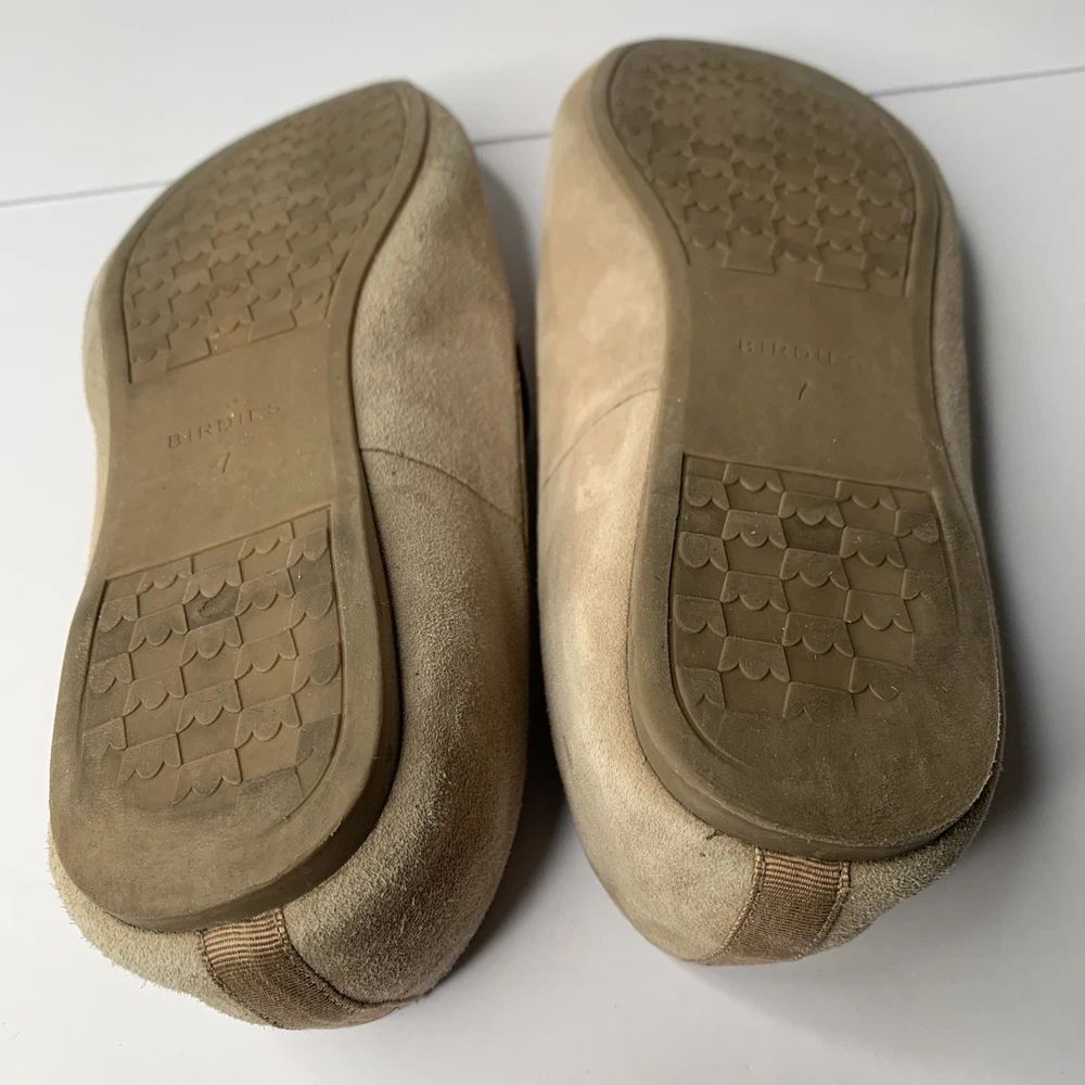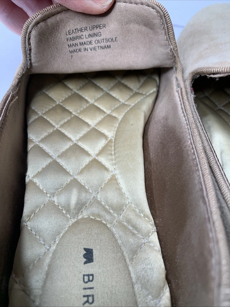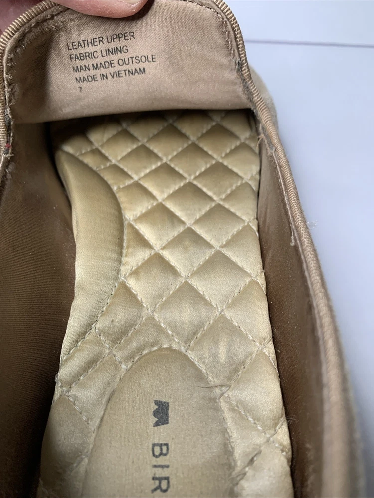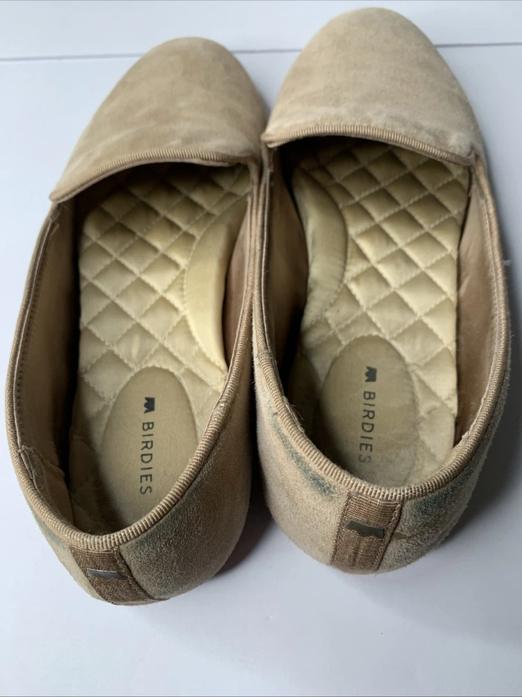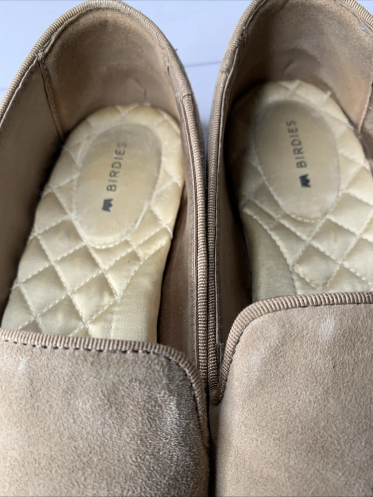 The Birdies Starling Almond Toe Latte Tan Leather Flat Shoes are a stylish and comfortable slip-on option for women. Featuring an almond toe shape and a solid tan color, these shoes are perfect for casual indoor occasions during the summer, fall, and spring seasons. The lightweight and cushioned design with a rubber outsole provides comfort and stability, making them ideal for indoor use. Crafted with leather and a fabric lining, these loafers from Birdies are a versatile addition to any wardrobe. These have Birdies are very worn. Please see photos.